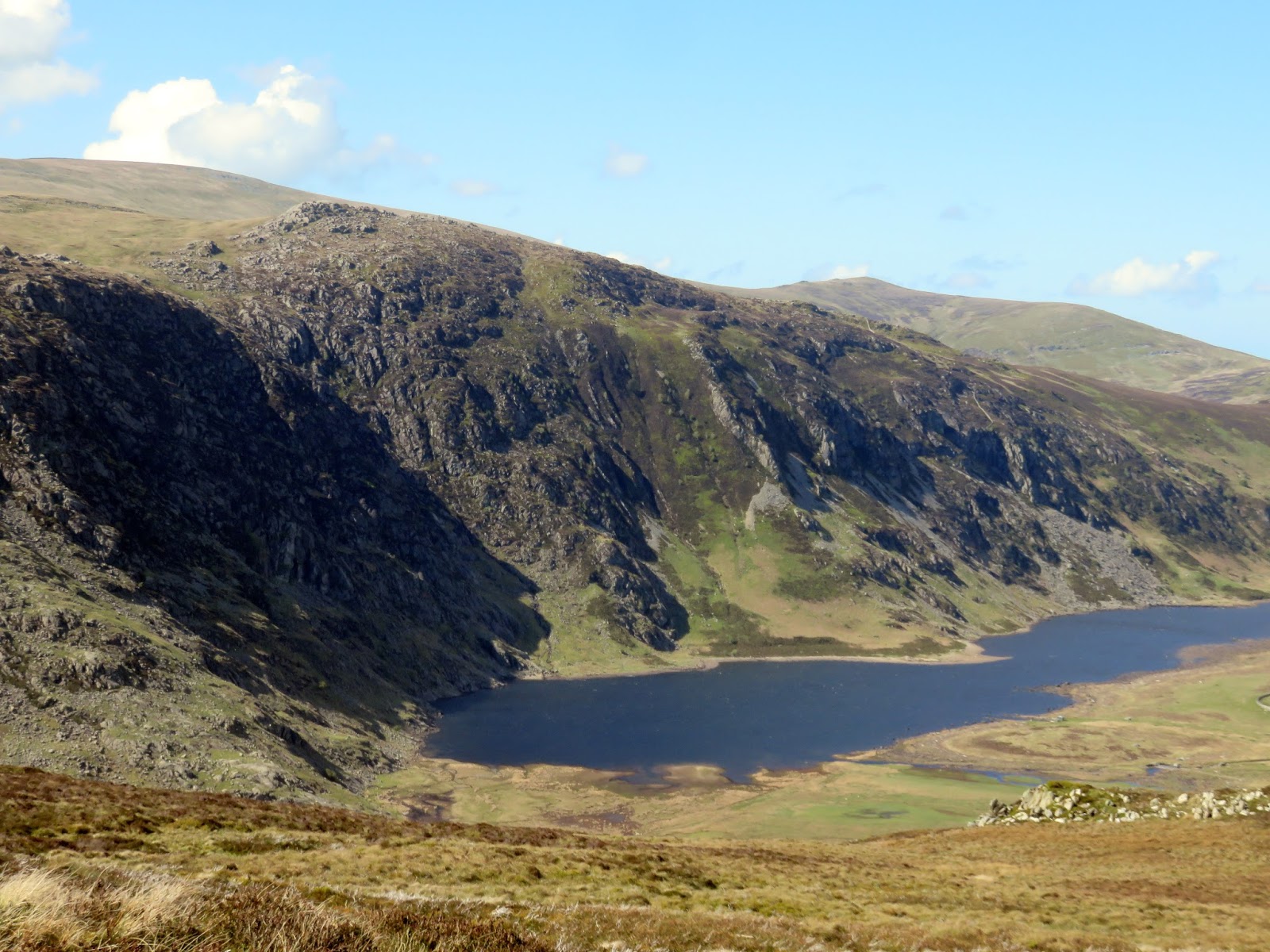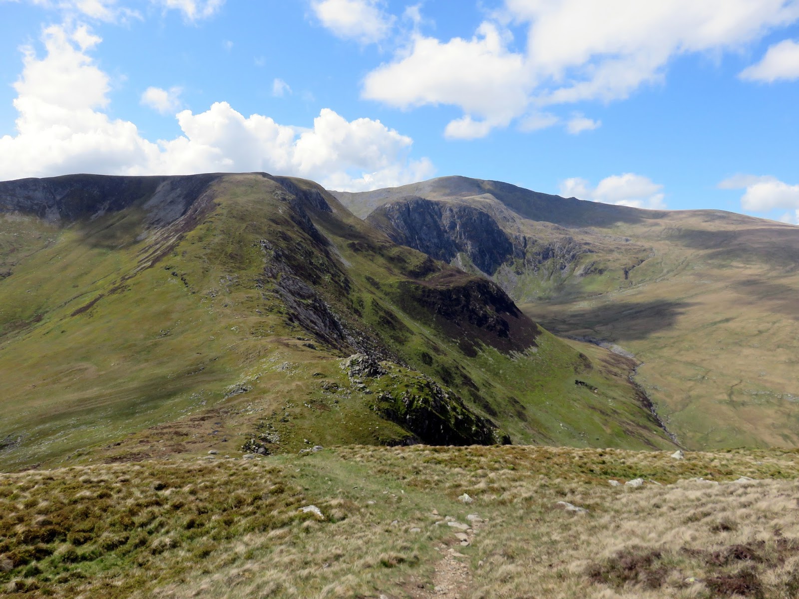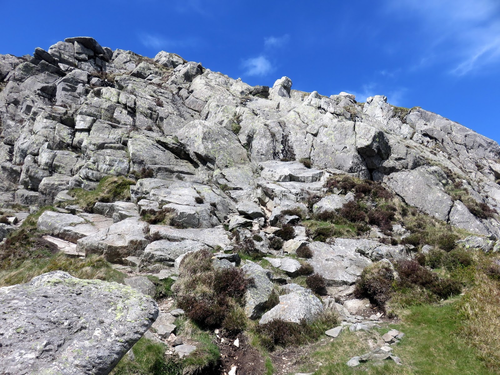 A broad grass ridge, Gledrffordd, joins Craig Eigiau to its parent Foel Grach with an obvious path leading towards the summit. It’s easy to wend around on the ridge – to the north, the small Llyn Melynllyn is well seen while the enormous Craig yr Ysfa dominates Carnedd Llewelyn’s south-east ridge.