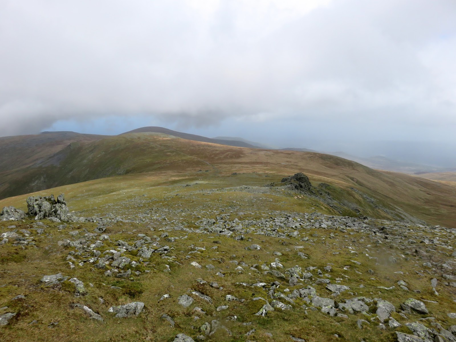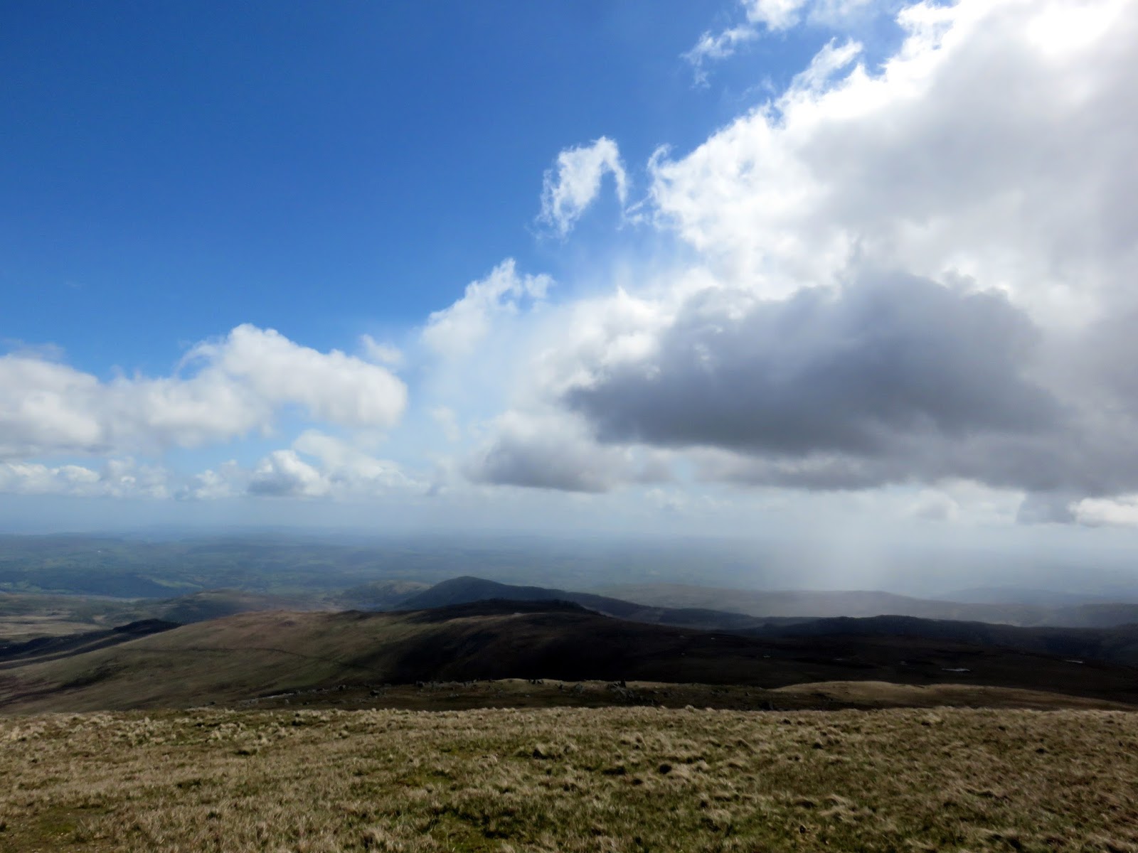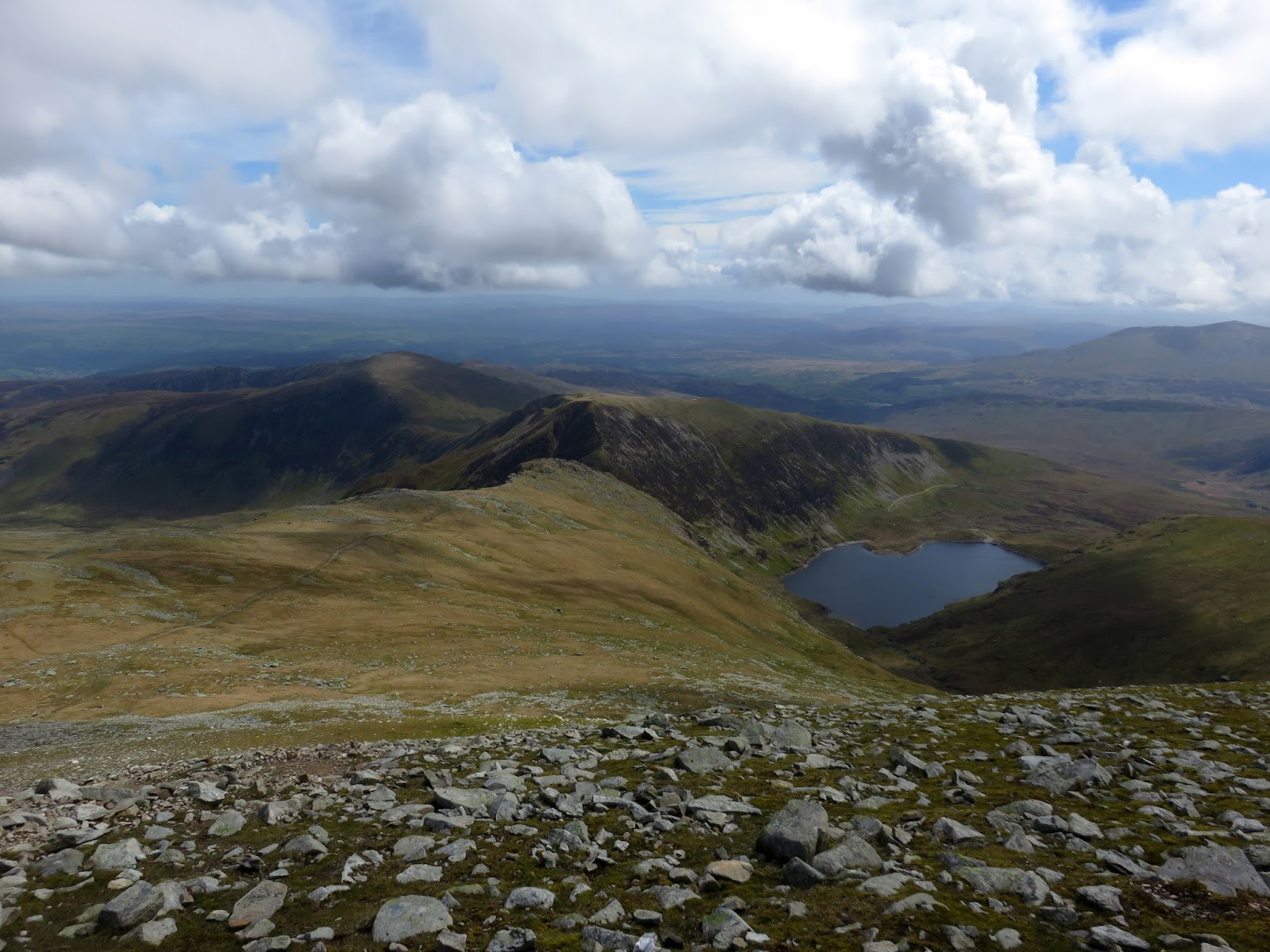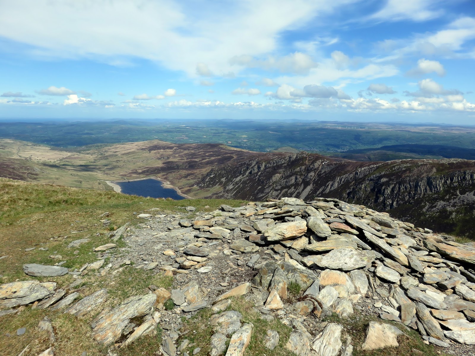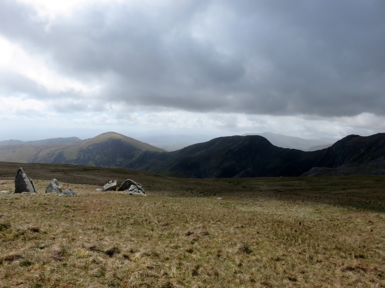 The Cefn-Tal-llyn-Eigiau ridge finds its highest point at Craig Eigiau, the top of a series of cliffs that shelter Llyn Eigiau below. The summit is formed of interesting sheets of rock with a tilted slab marking the high point. From this vantage point, I could see some showers forming to the west, no doubt heading in my direction.