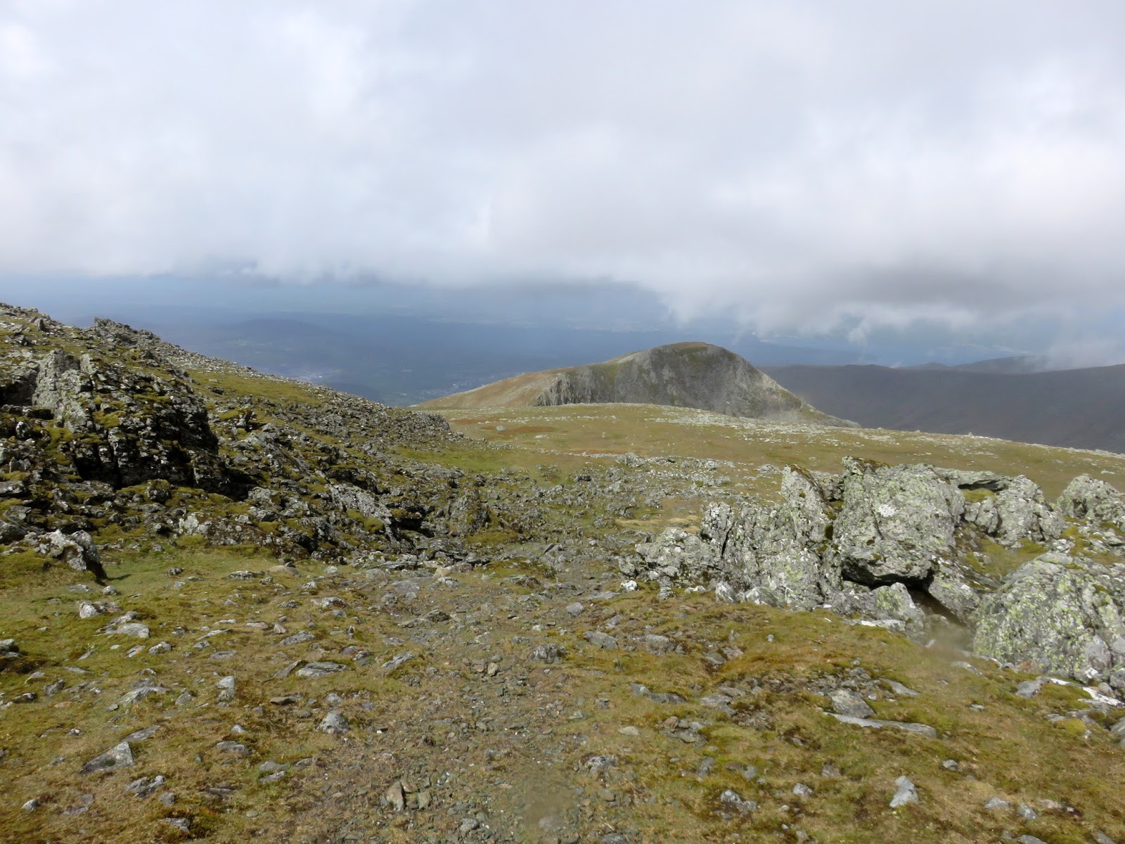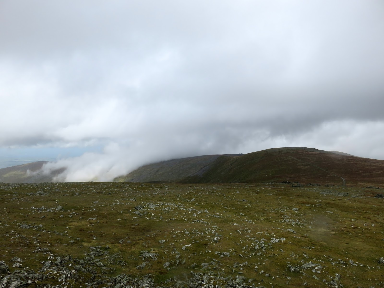 With full waterproofs on I began the climb towards the top of Carnedd Llewelyn along the Gwaun y Garnedd ridge, leaving the path occasionally to peer down into Cwm Eigiau and the tiny Ffynnon Llyffant. The rain had eased as I reached the top but, instead of aiming for the summit, I turned to the west, intent on visiting the outlying summit of Yr Elen.