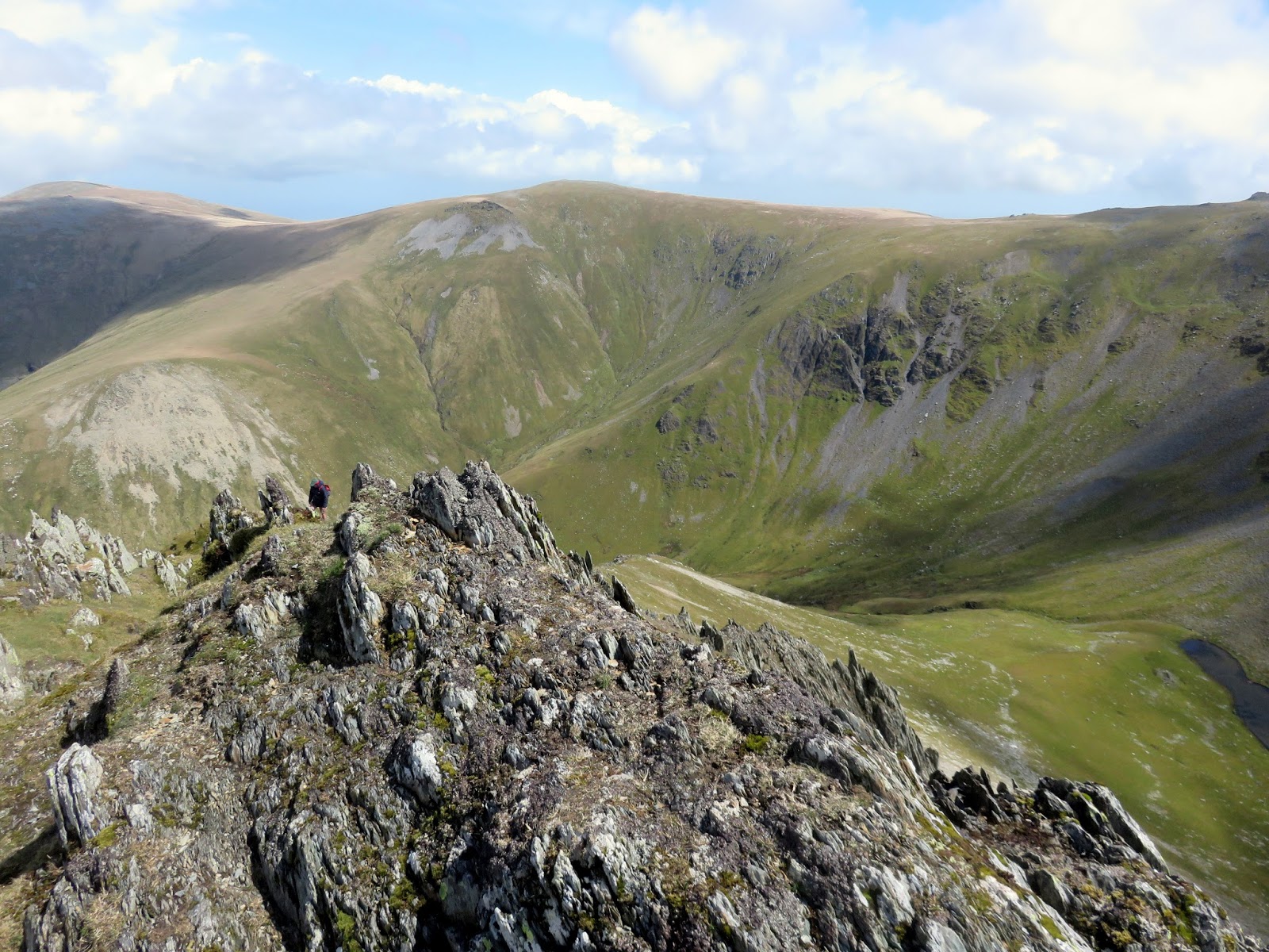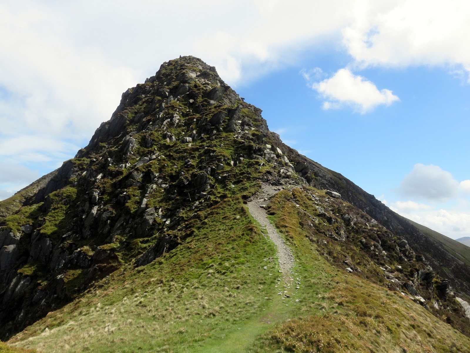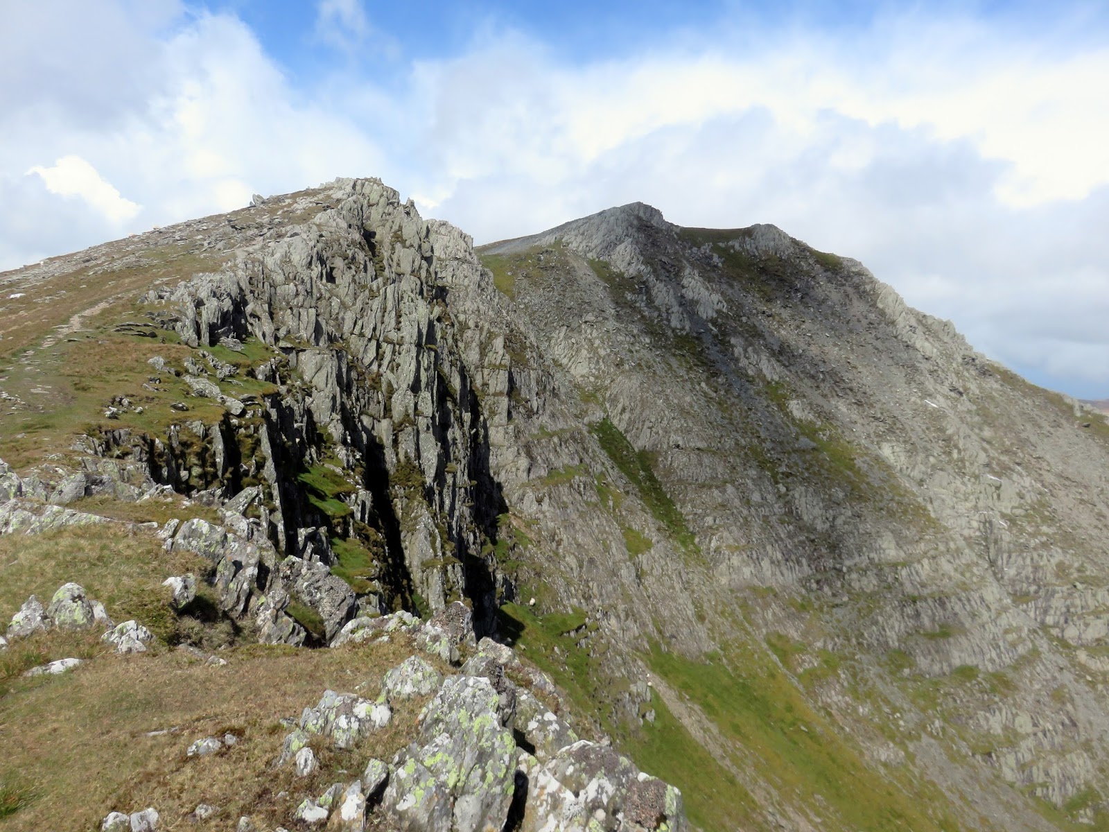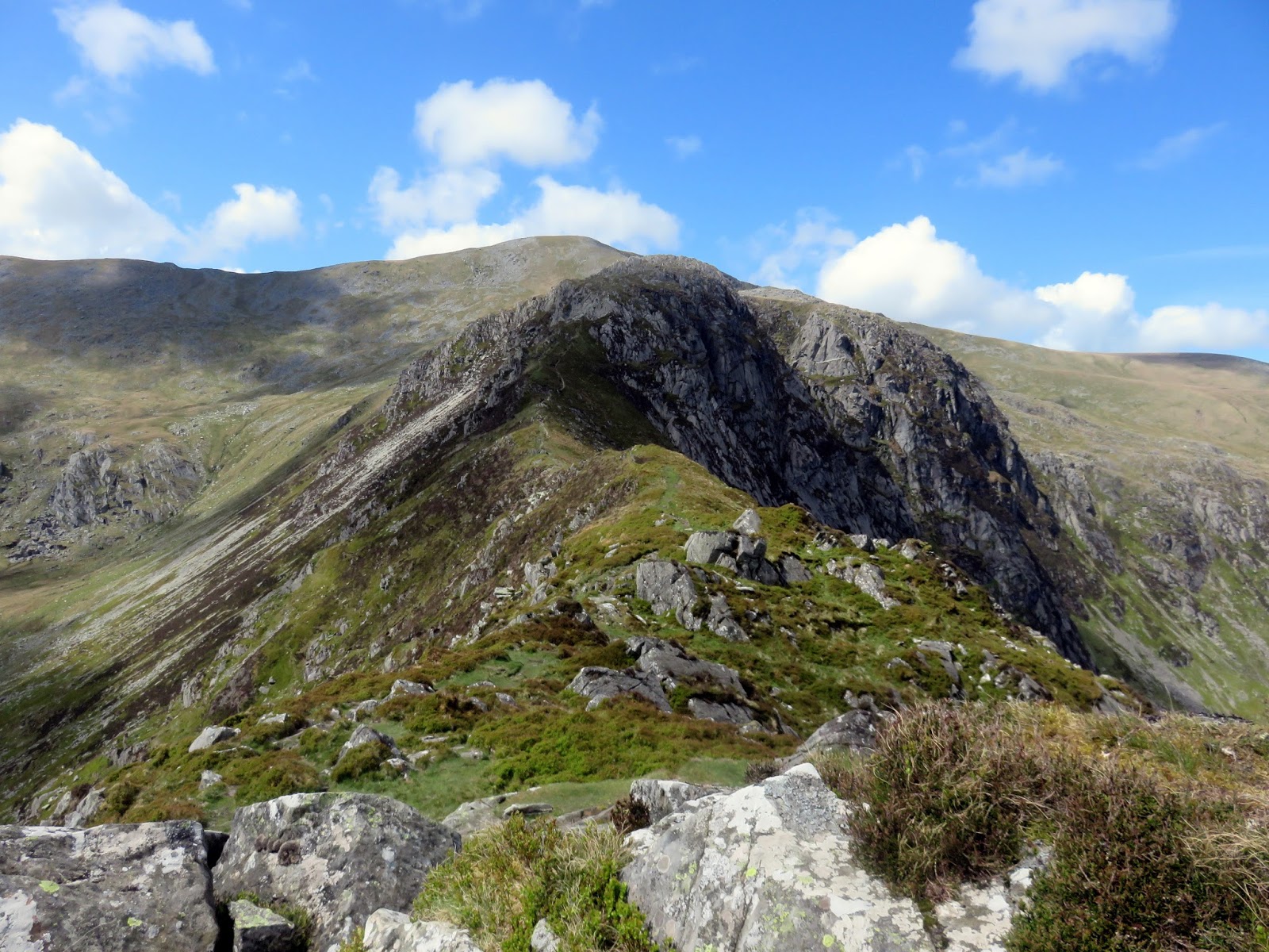 The step drops you onto the narrow Bwlch Eryl Farchog, a superb arête that separates Cwm Eigiau from Cwm Llugwy. Ahead is the imposing north-west ridge of Pen yr Helgi Du.