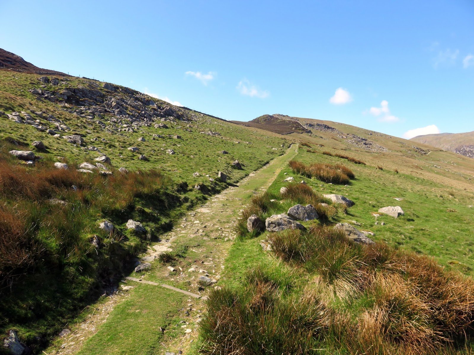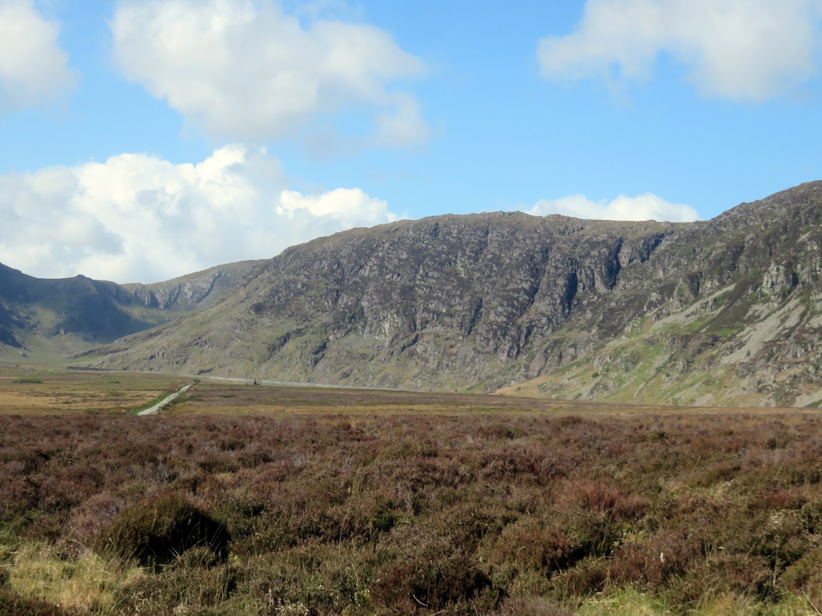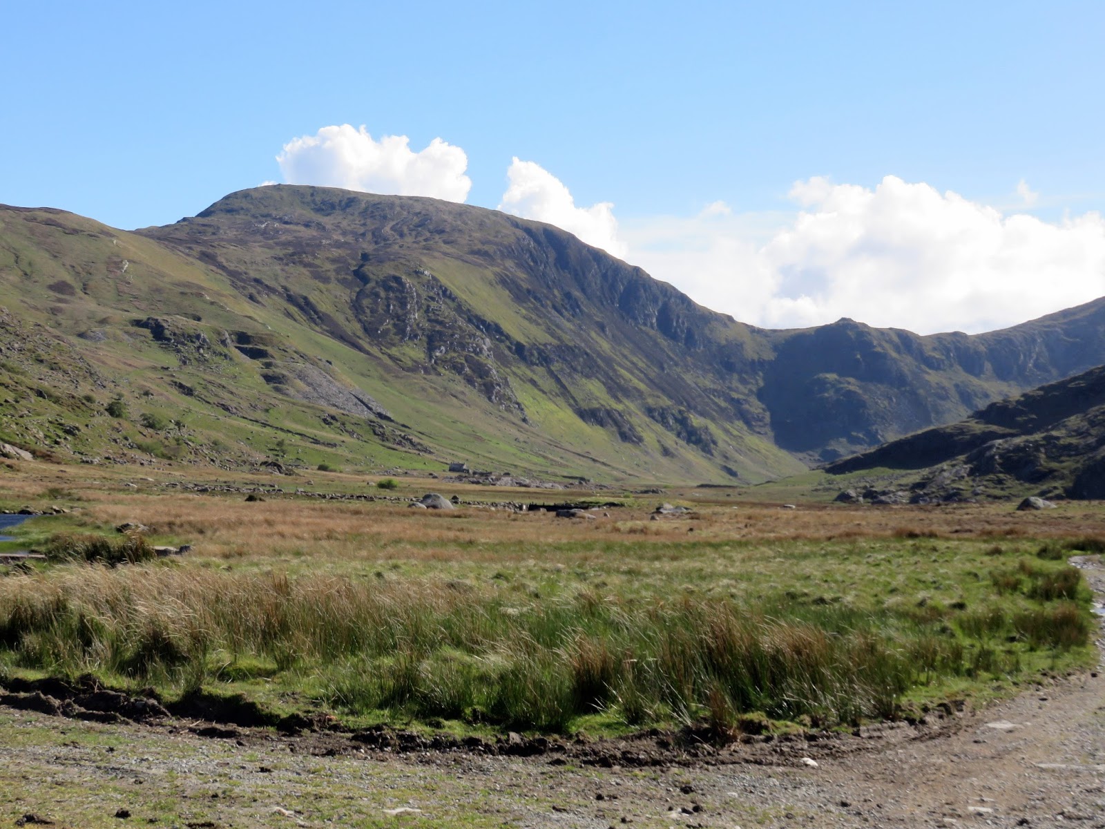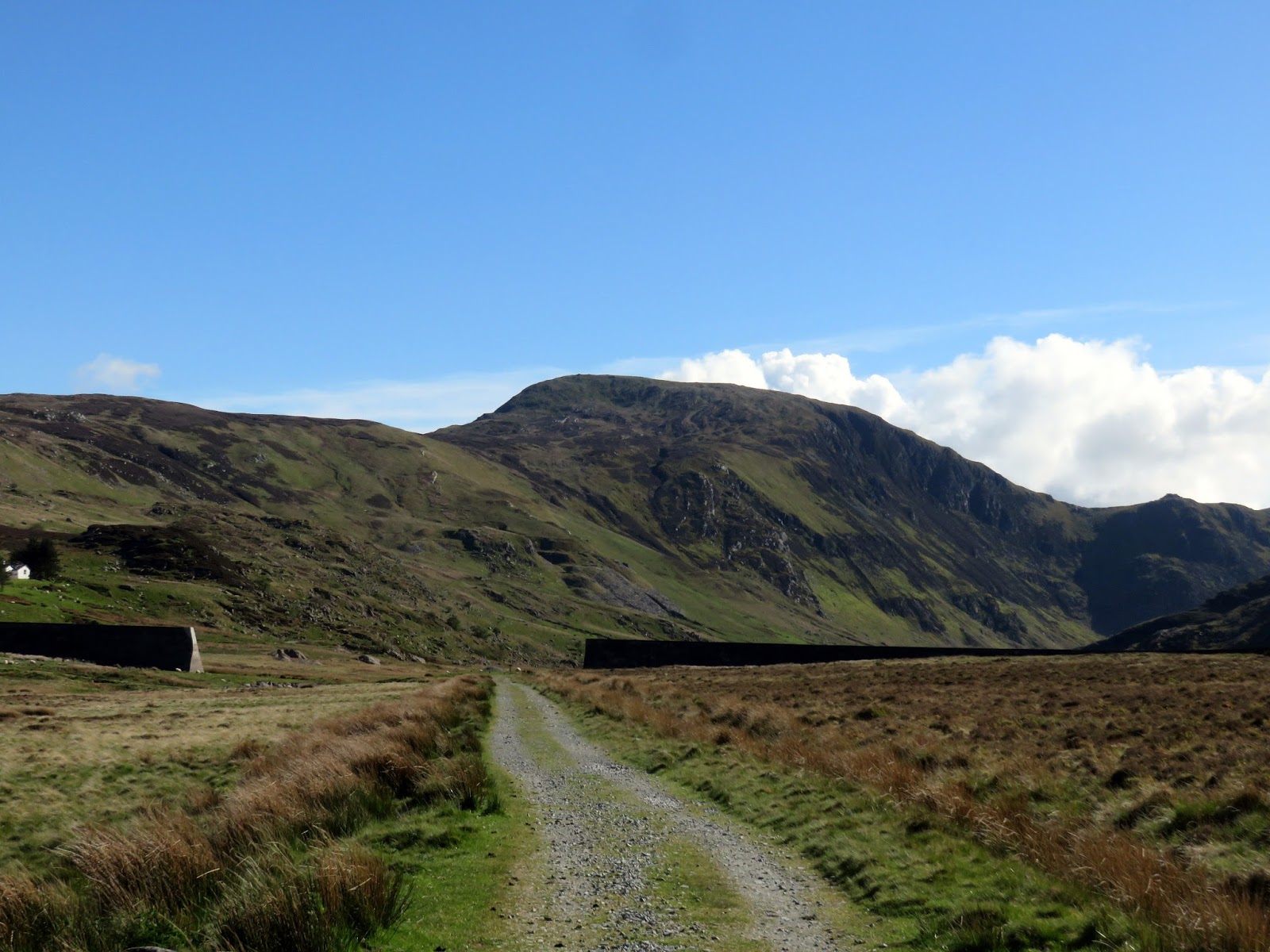 From the car park, a straight track leads towards Clogwynyreyr, the termination of the ridge of Craig Eigiau, the first peak of the day. The track (the remains of the route to the Melynllyn Hone Quarry) leads around the base of Clogwynyreyr into the secluded valley of Pant y Graifolen, bringing Foel Grach, Carnedd Gwenllian and Foel-fras all into view.