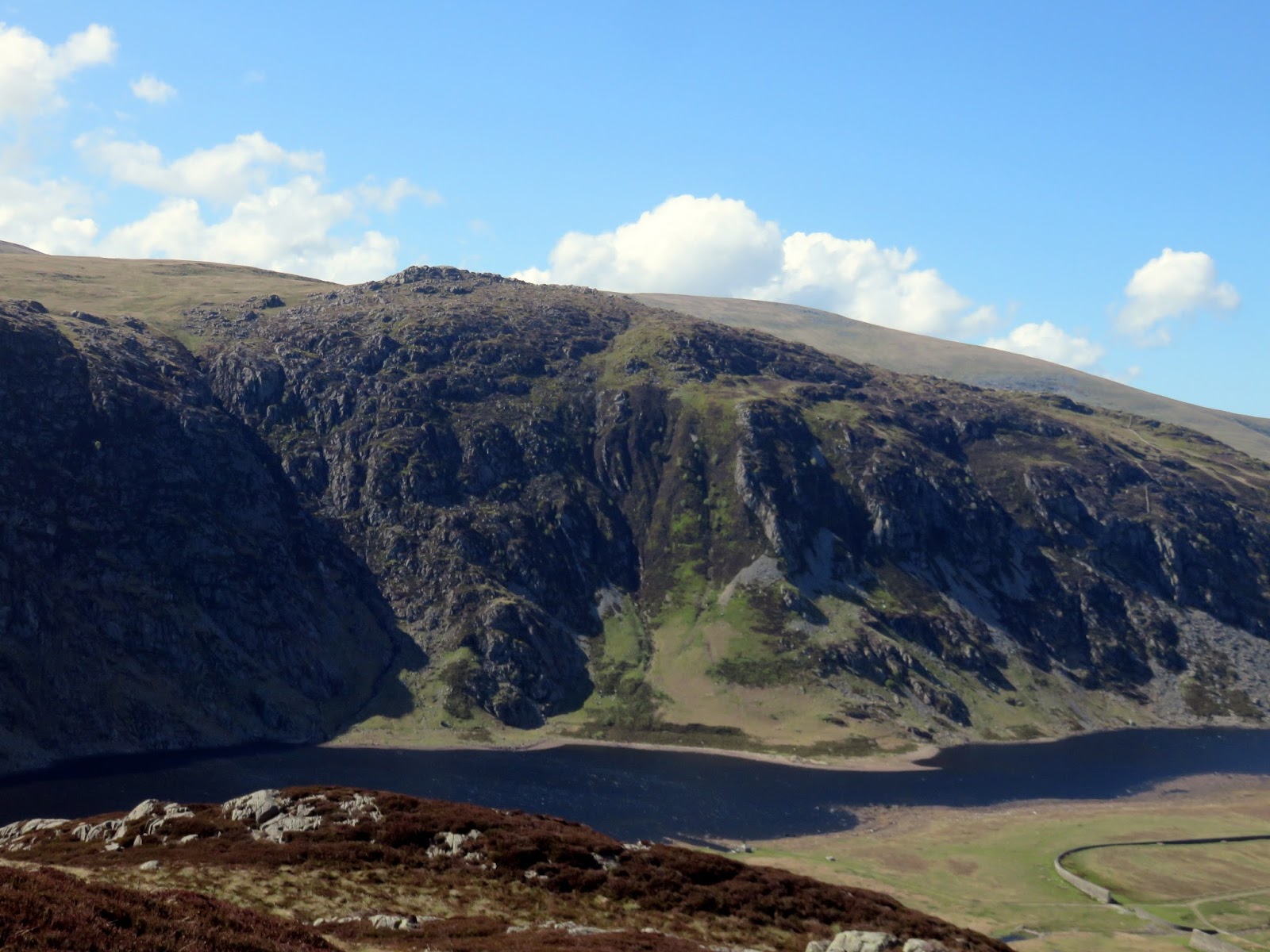 The track rises gently to a gate where I left it, heading uphill to gain the ridge of Craig Eigiau, all the while views of the Carneddau were improving. Visible now was the small lake of Dulyn Reservoir or Llyn Dulyn. Though the lake is very small it is incredibly deep, plunging to a depth of nearly 60m, almost as deep as Windermere, England’s largest lake. Its name (black lake) is derived from the towering Craig y Dulyn cliffs above which cause the lake waters to be very dark.