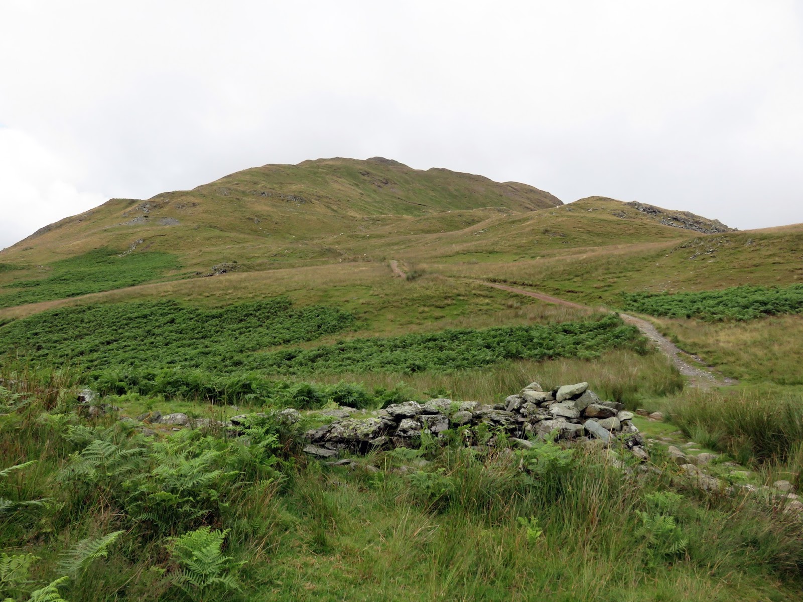 We crossed the valley of Goldrill Beck to Side Farm to find the track which slopes up the hillside to Boredale Hause, a not-too-difficult ascent of around 200m. The clouds were still painting moody scenes across parts of the eastern, the Kirkstone Pass looking particularly ominous.