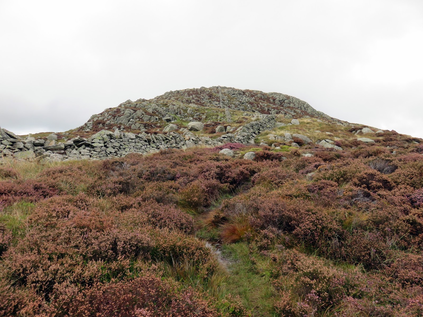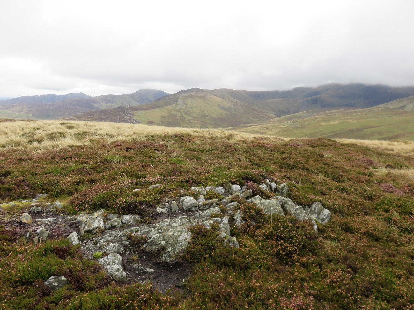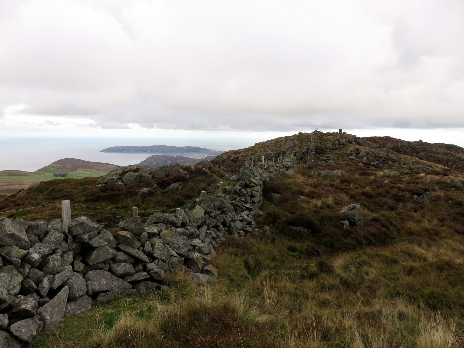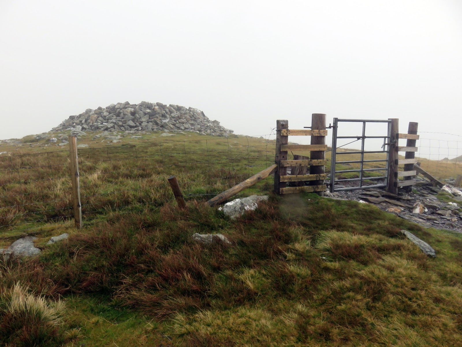 Drum, only a short climb further along the ridge, is the highest point of the day though the clouds had closed in and it had started raining when I reached the summit. Like Carnedd y Ddelw previously, the summit is capped by a large cairn, probably from the Bronze Age.