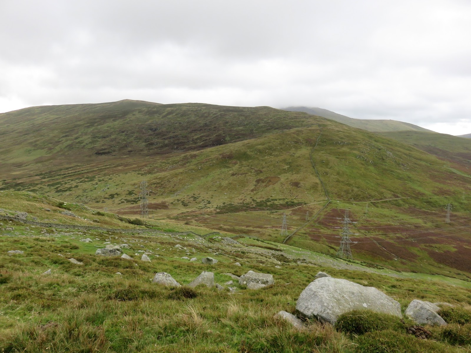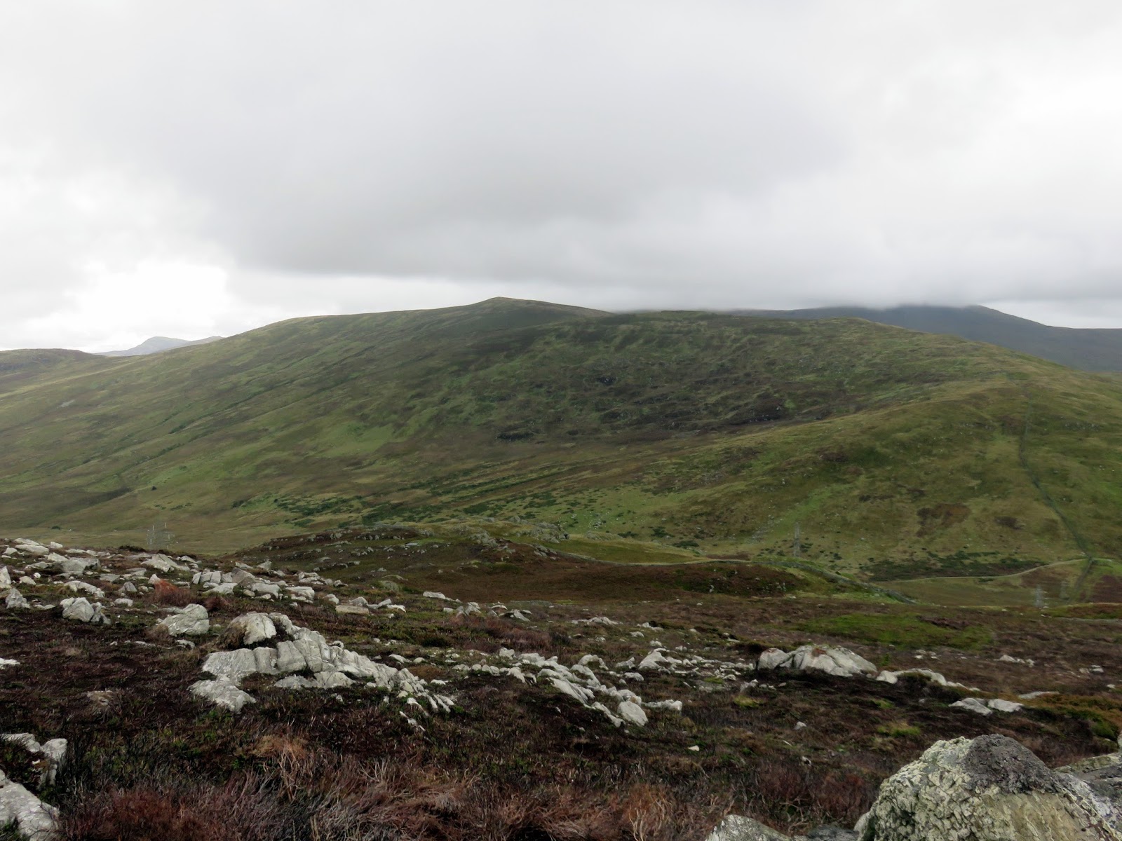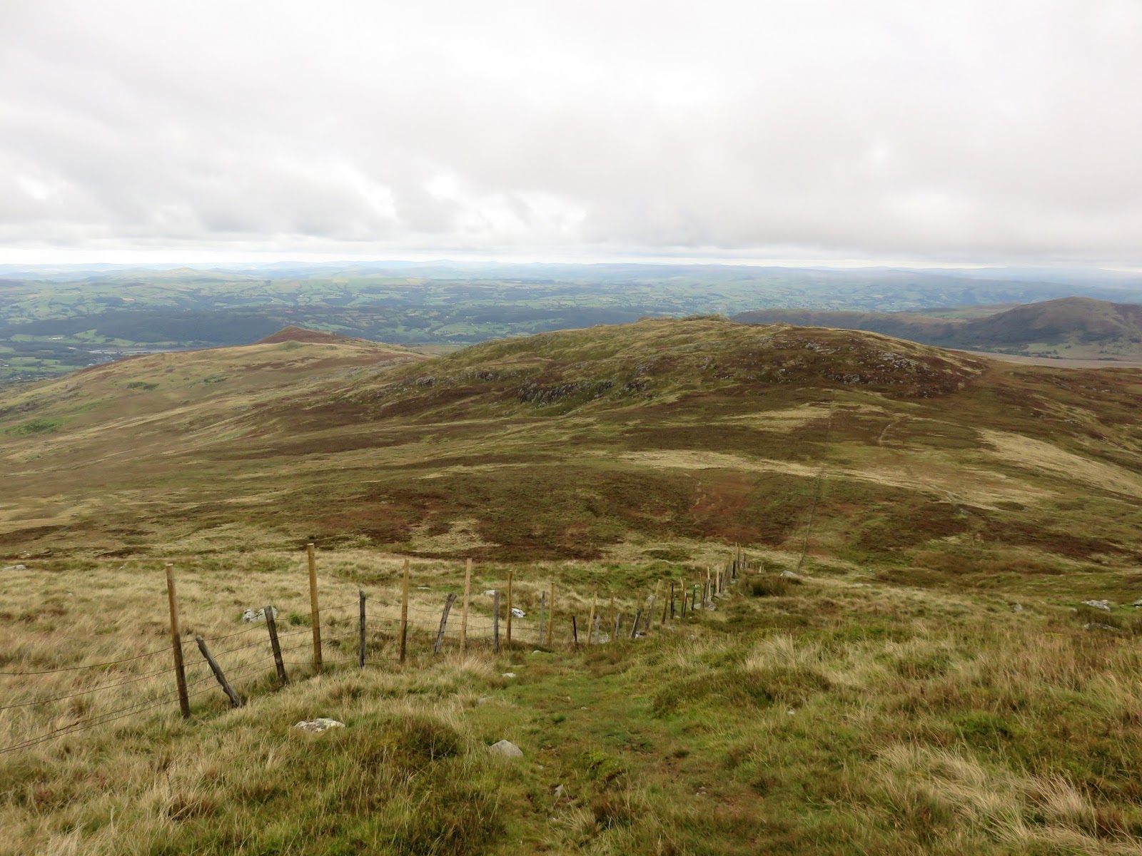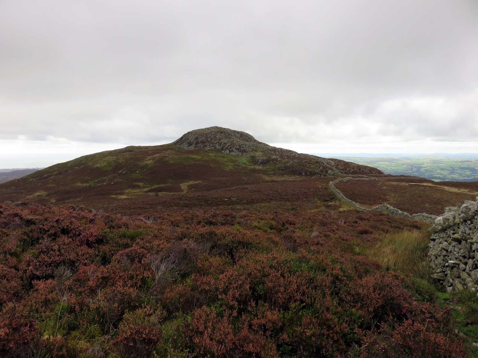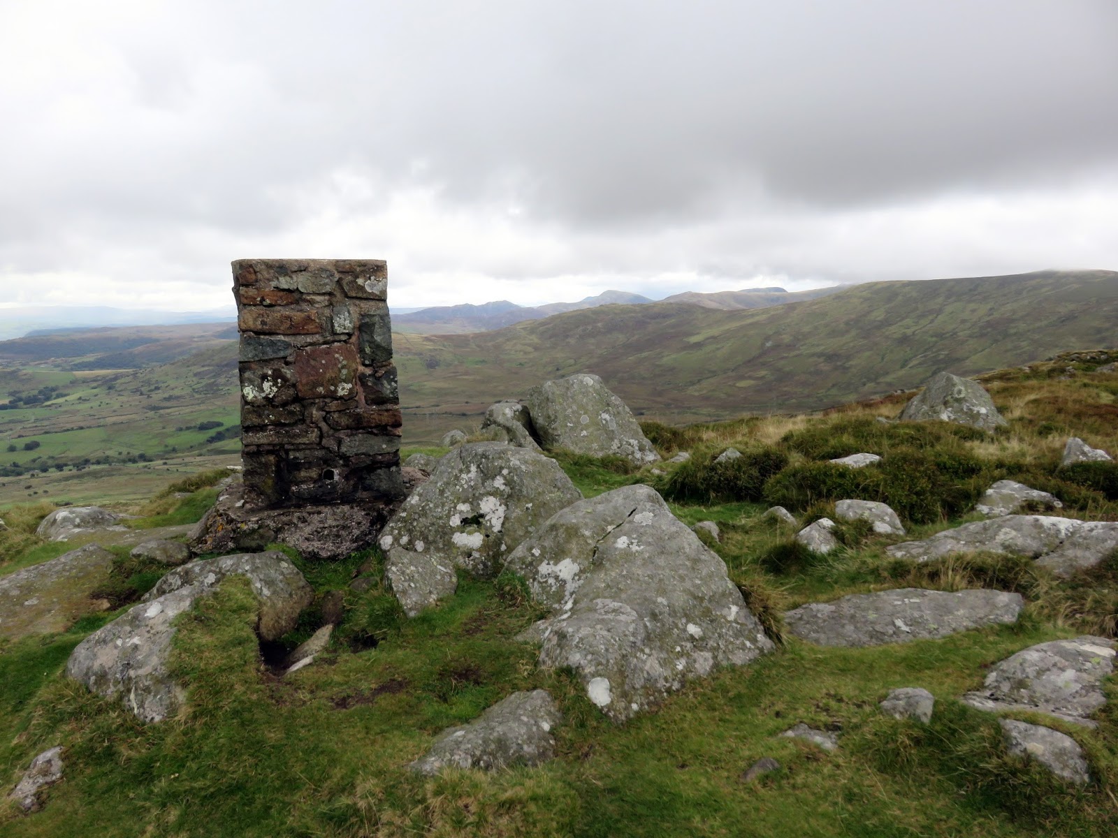 Drum, only a short climb further along the ridge, is the highest point of the day though the clouds had closed in and it had started raining when I reached the summit. Like Carnedd y Ddelw previously, the summit is capped by a large cairn, probably from the Bronze Age.