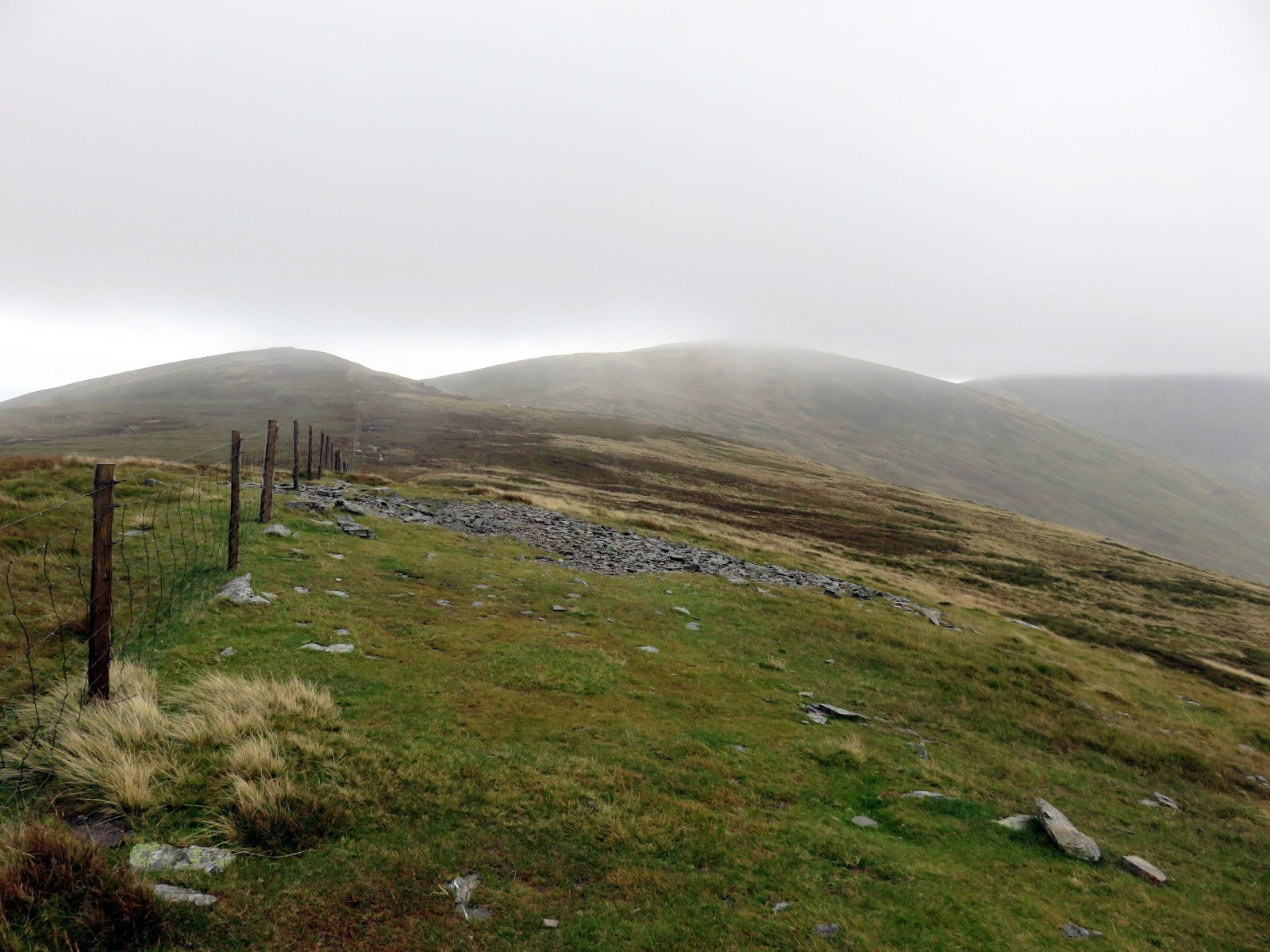In the cloud, the next short section needed some careful navigation to make sure I began my descent towards Pen y Castell heading in the right direction. Fortunately, a fence runs in much the same direction so can be followed if necessary. It wasn’t long, however, before it had stopped raining and I had descended below the cloud where Pen y Castell is clearly in sight.