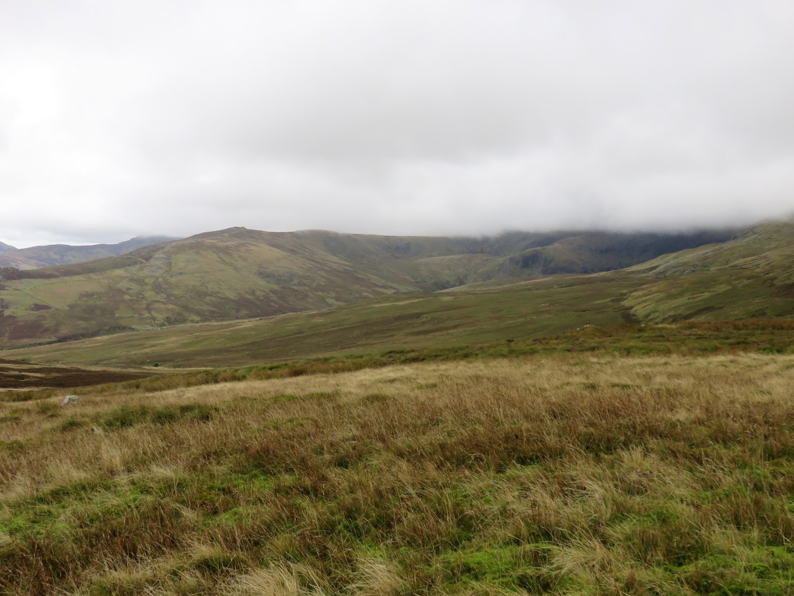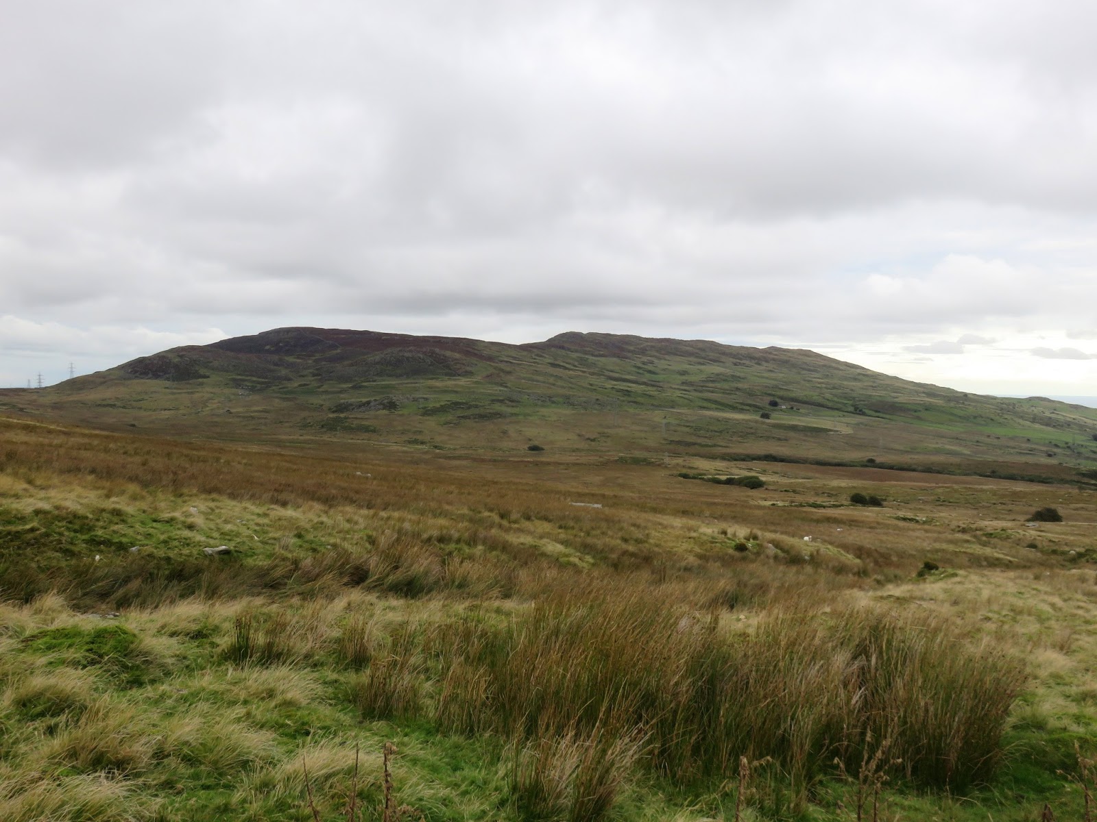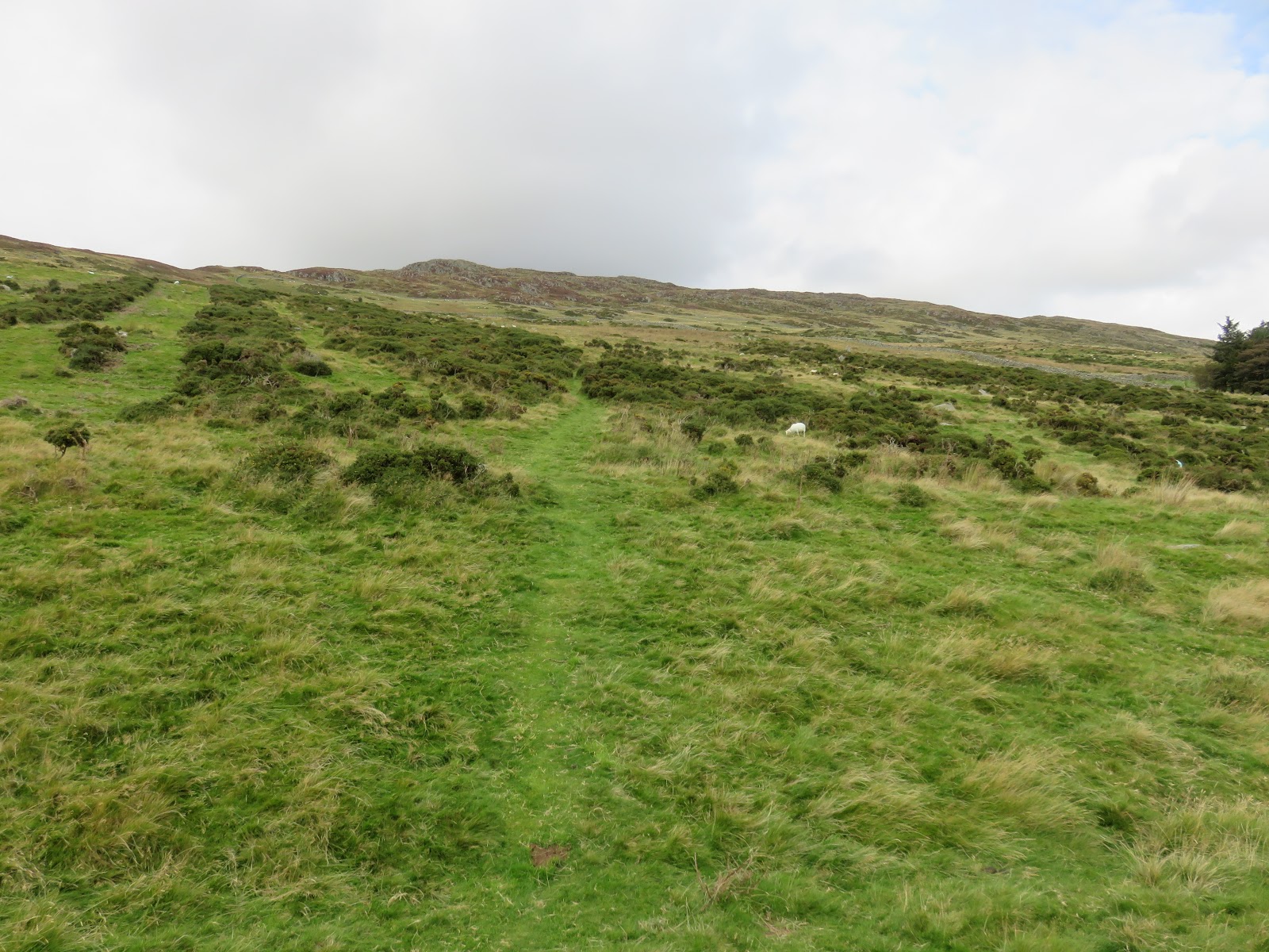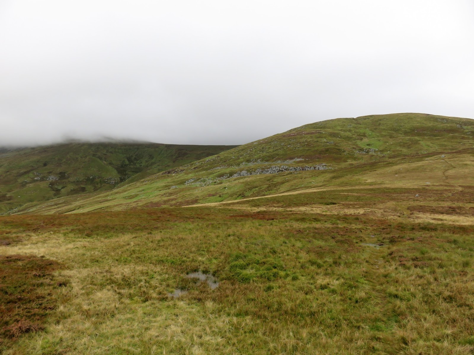 The path climbs easily up across marshy fields to a shallow depression between Tal y Fan and its other peak, Foel Lwyd. A visit to the summit of Tal y Fan is an out-and-back from this point.