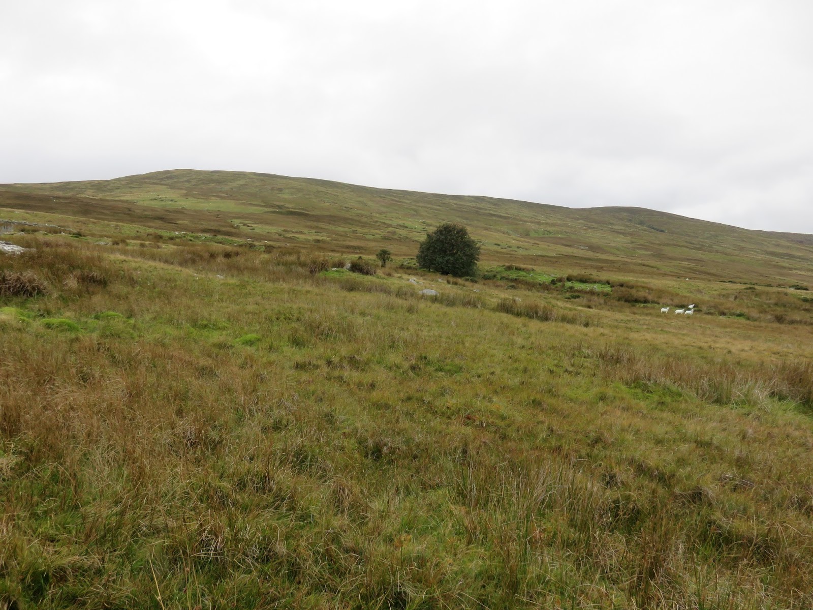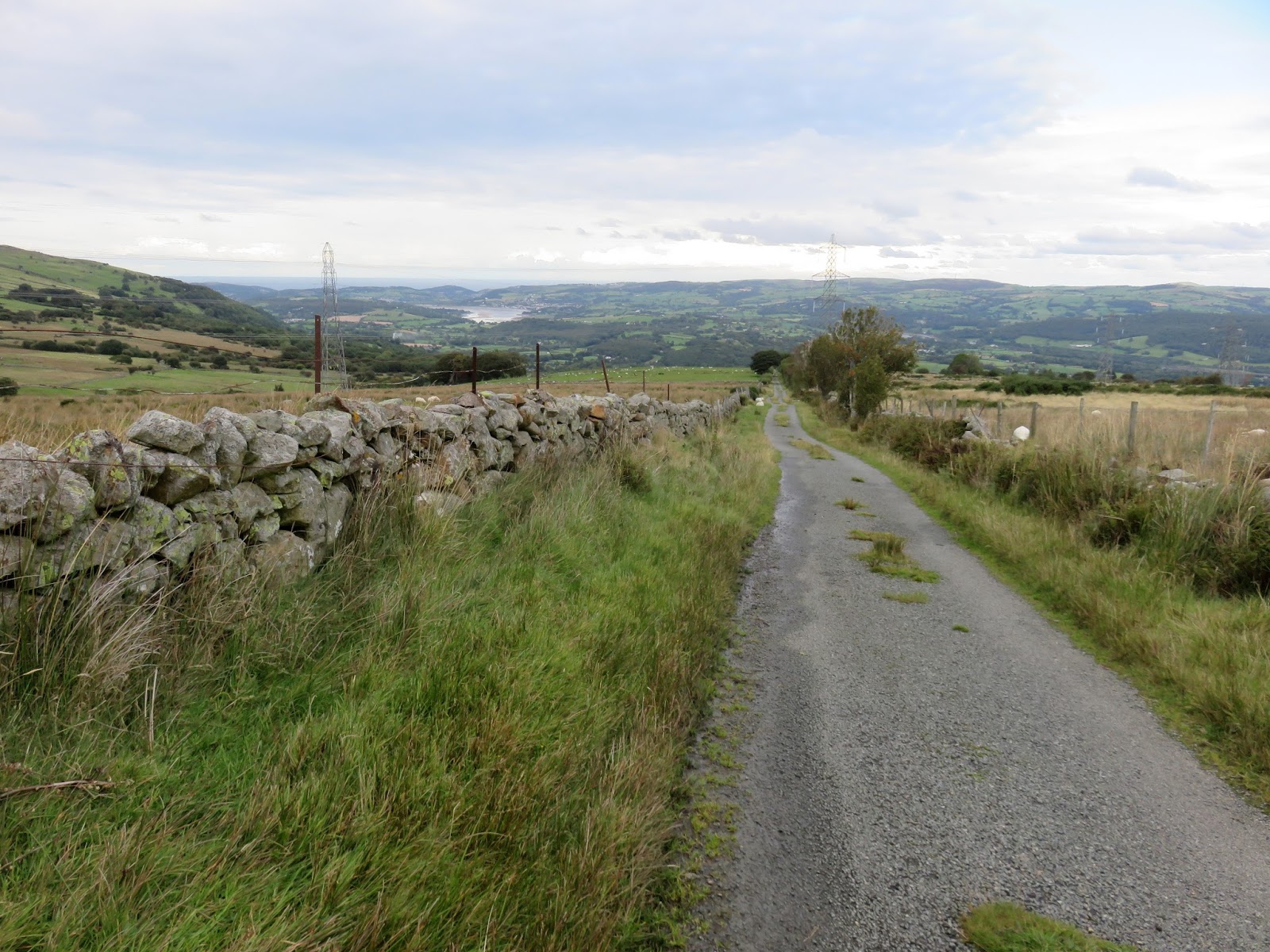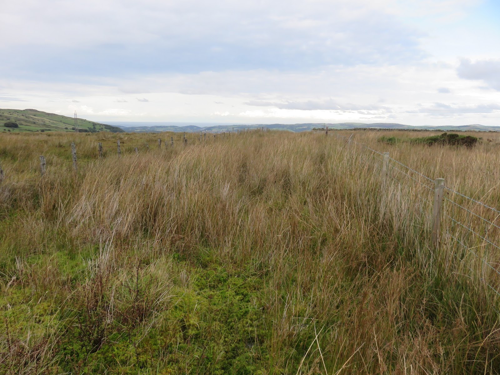 My route, though more direct than that described above, aimed northeast across the marshes of the Afon Tafolog to a sheepfold and ultimately to a marked green lane. This was hard work across rough, wet grass and the green lane was immediately extremely boggy, so much so that I ended up walking along the fence of the neighbouring field instead of wading through the water.