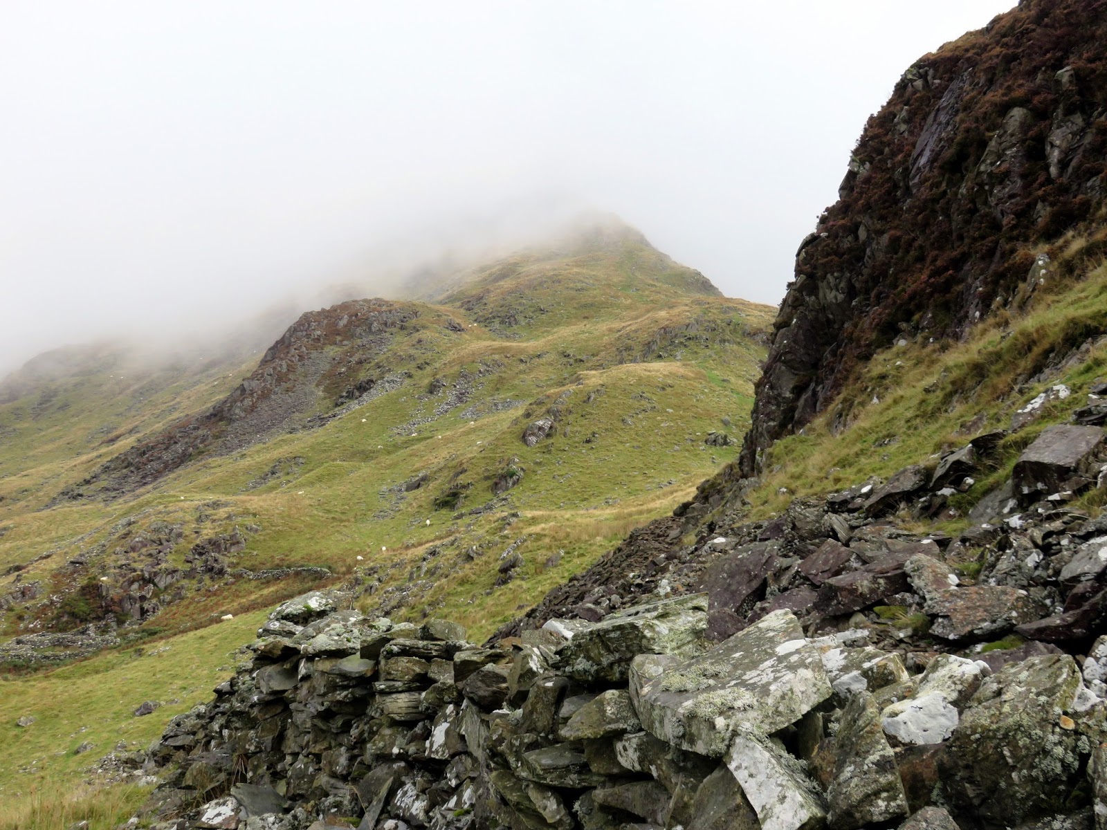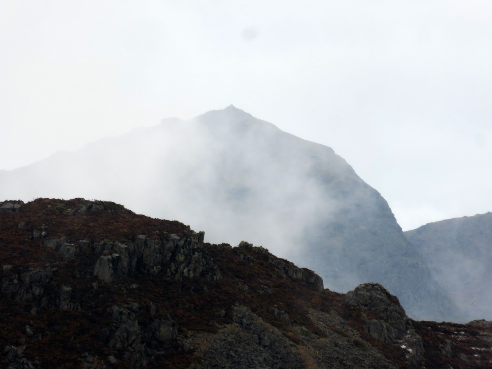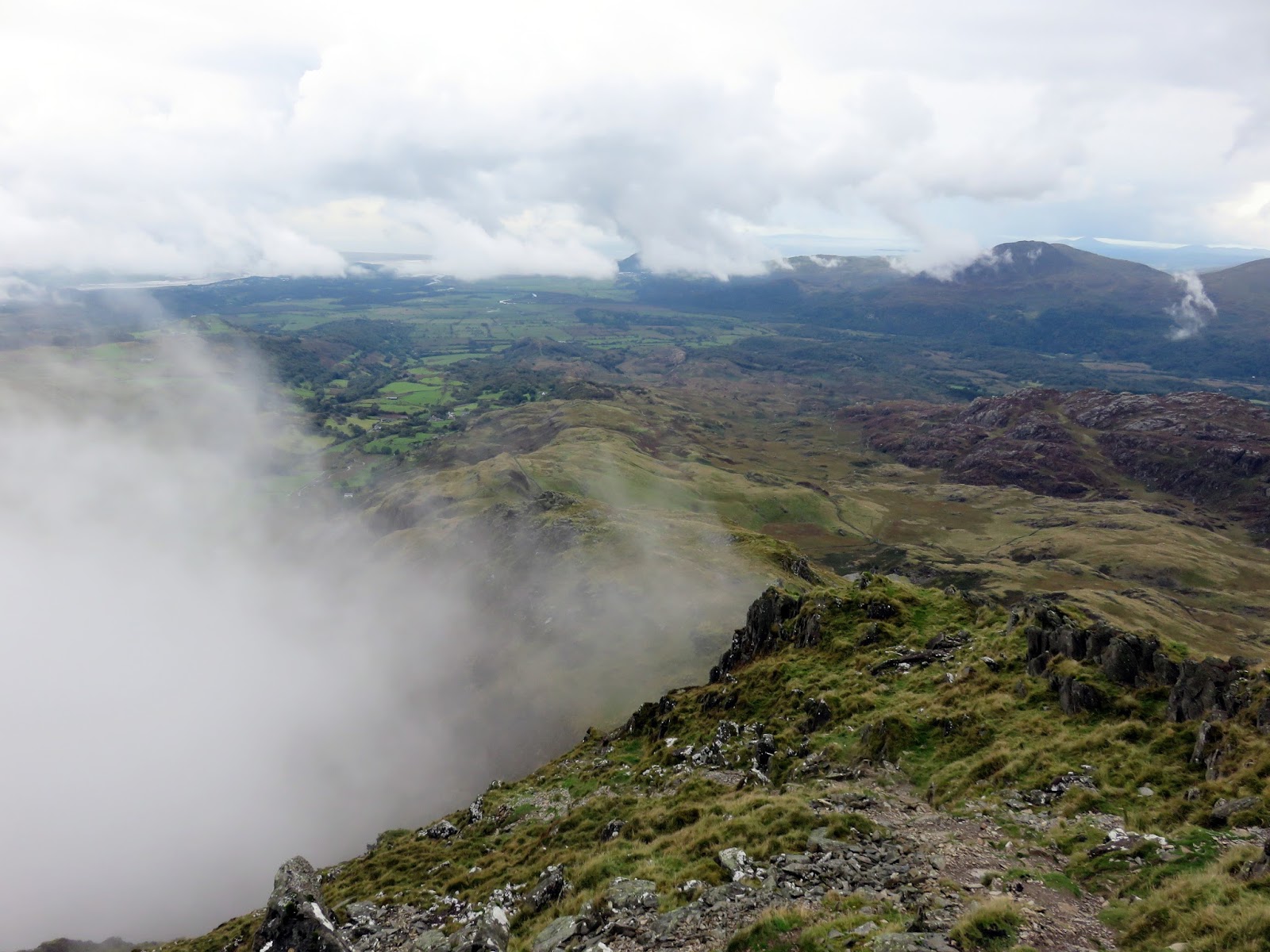 The climb up Cnicht presents no real problems other than some rockiness towards the end, nothing that would trouble even the most timid hill walkers. The summit has a fine prospect, though was shrouded in cloud by the time we arrived as another shower drifted by.