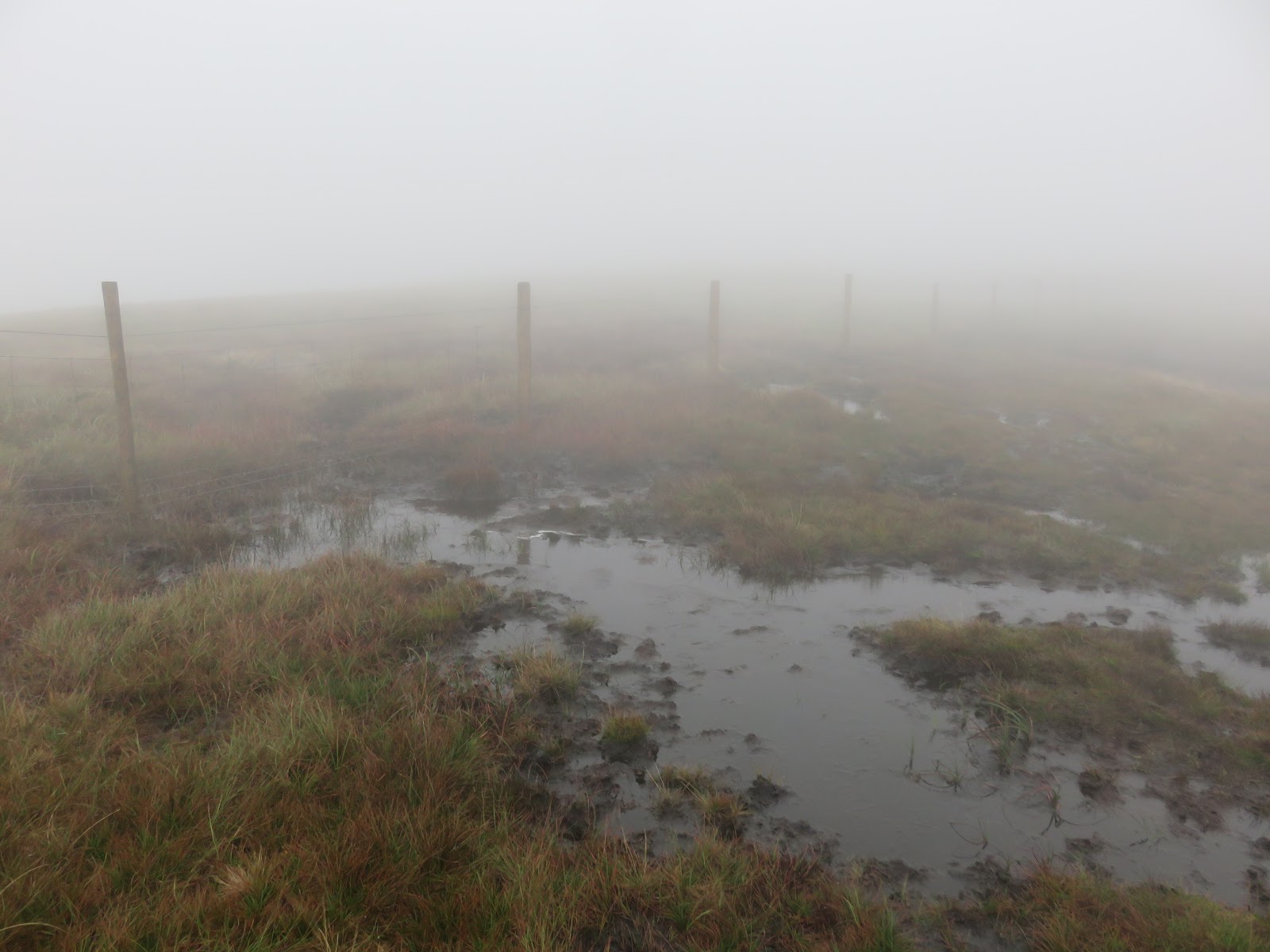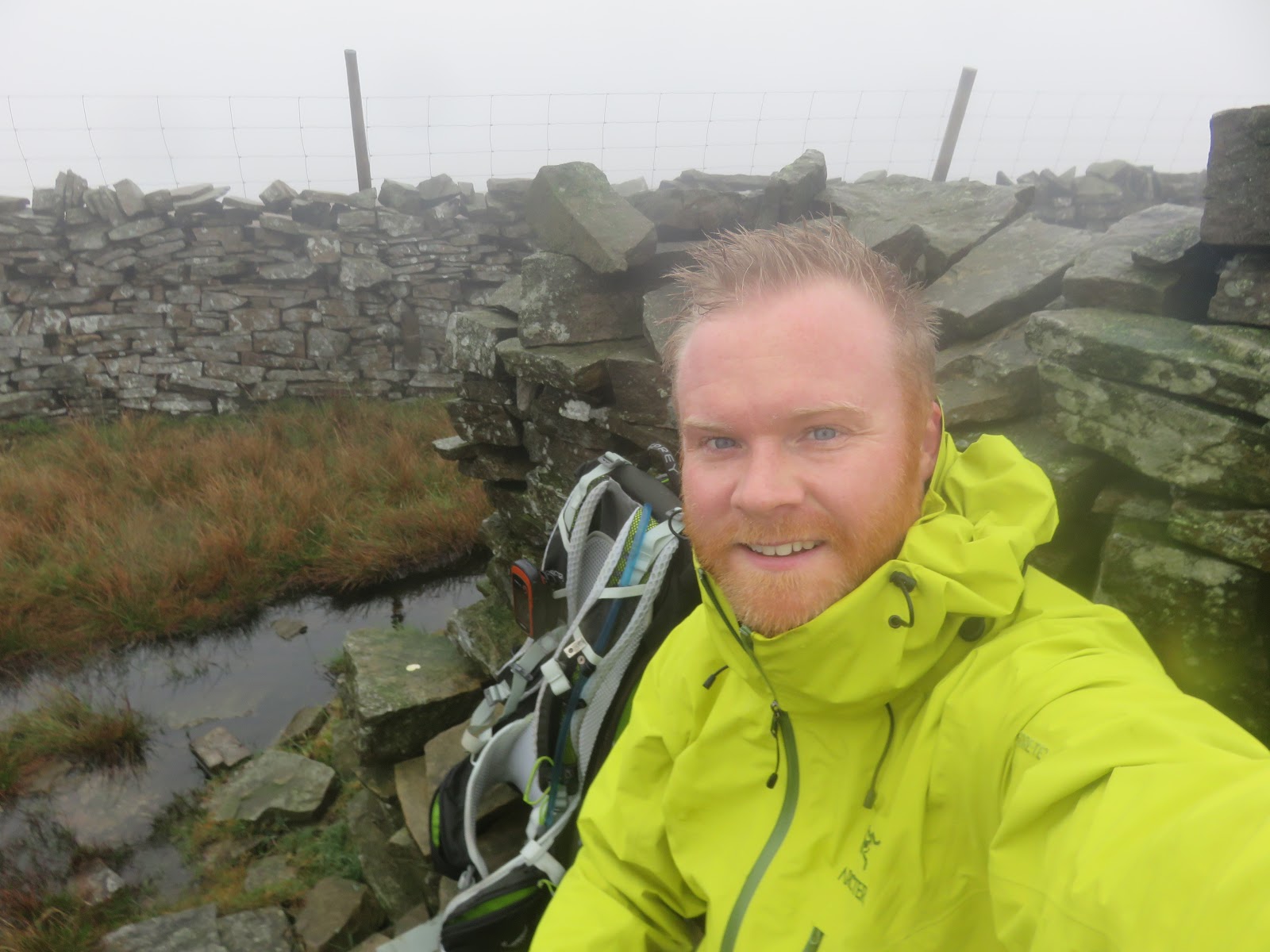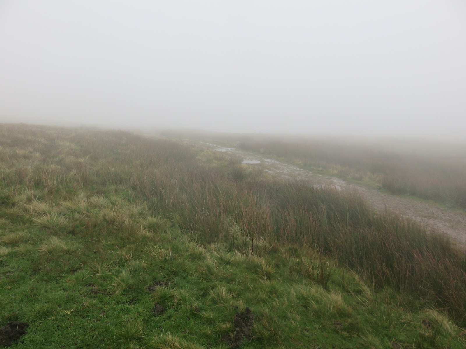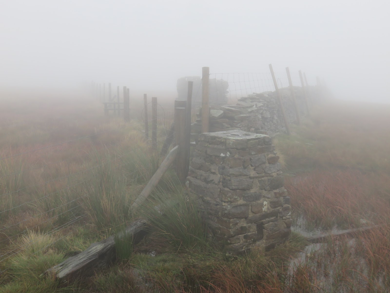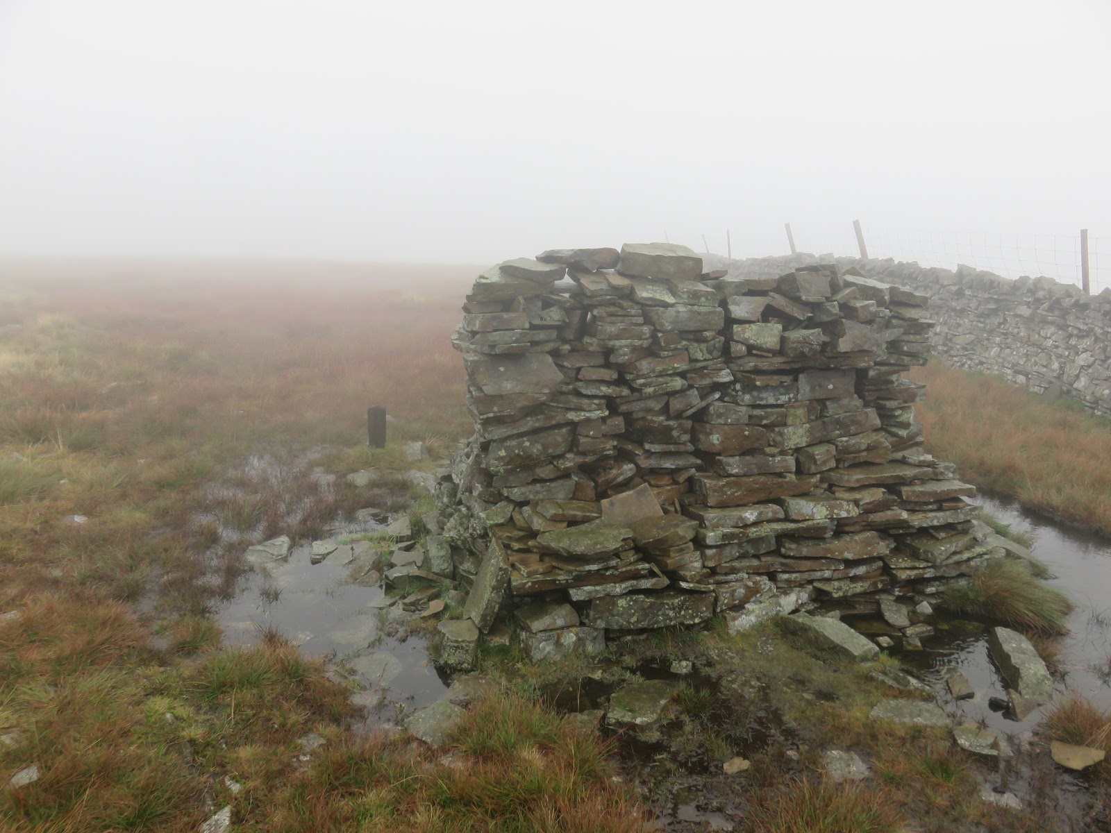 From the summit. the route continues to follow the fence the left which marks the county boundary between Cumbria and Yorkshire. The rain was becoming heavier as I descended the slopes of the hill and I was momentarily caught out by a bog resulting in a wet leg though, fortunately, I managed to keep most of the water out of my boot.