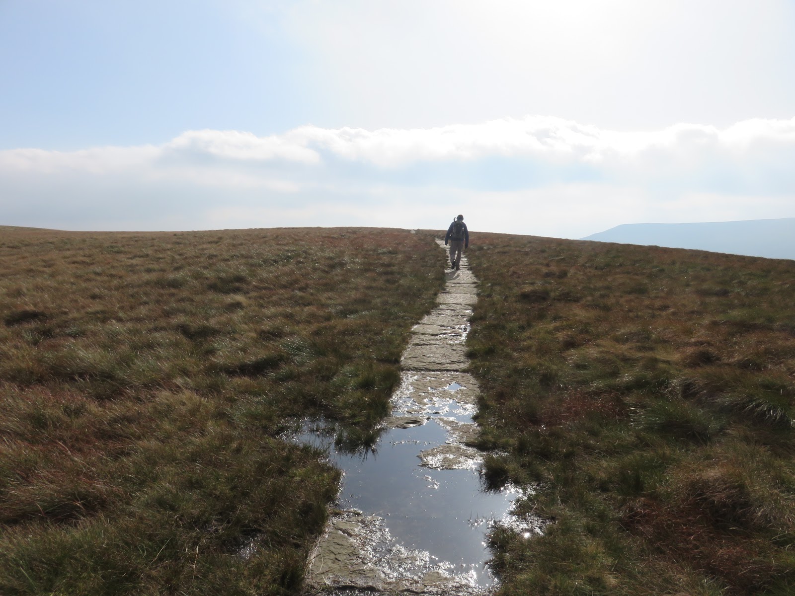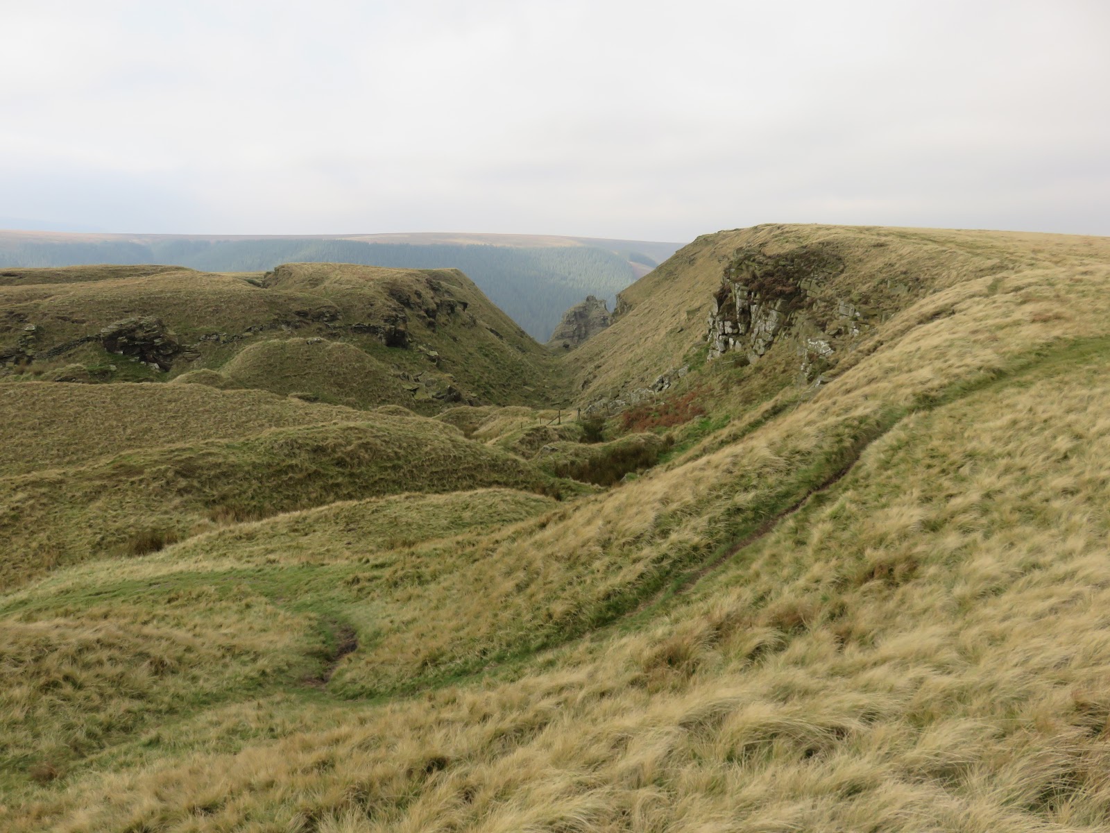 The path stops abruptly at a steep edge that falls a number of metres down into the valley, marking the beginning of the large landslip that forms the remarkable Alport Castles.