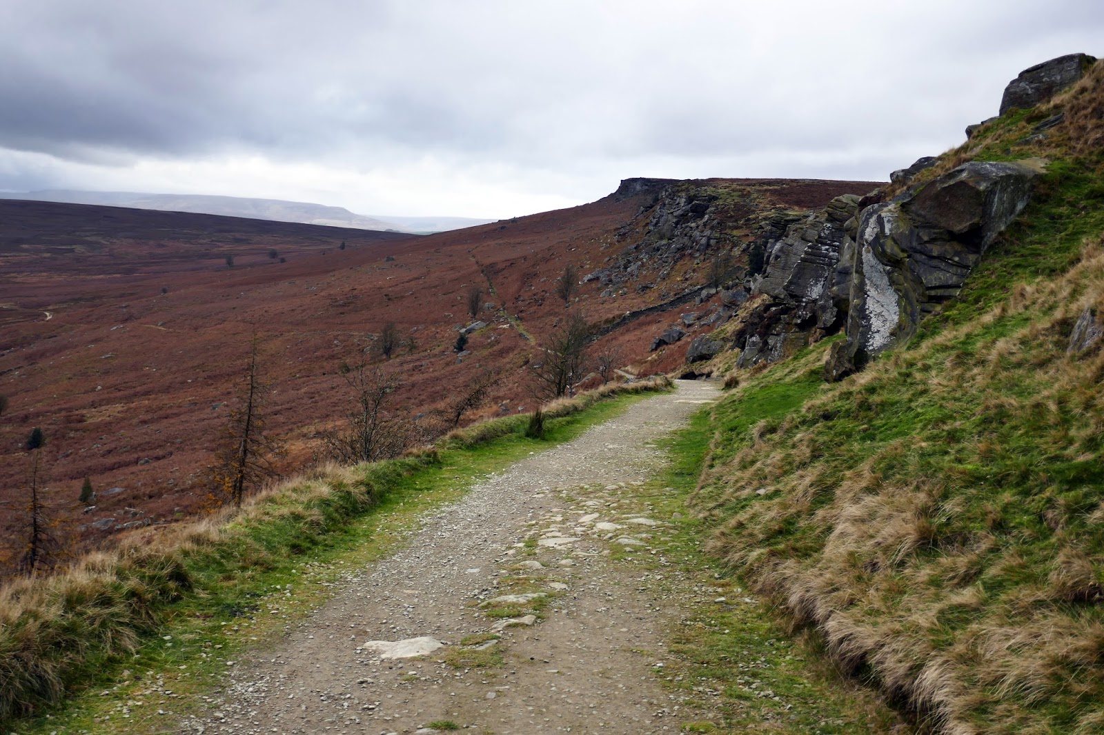 Below Crow Chin, the prominent bend in Stanage Edge, we picked up a rough path heading north beneath the crags to a Stanage End where we climbed up to the edge itself through a breach in the rocks.