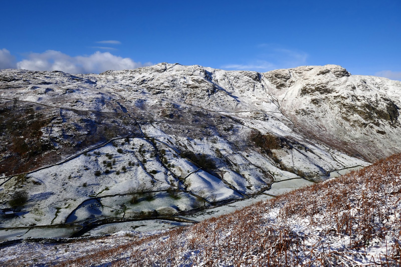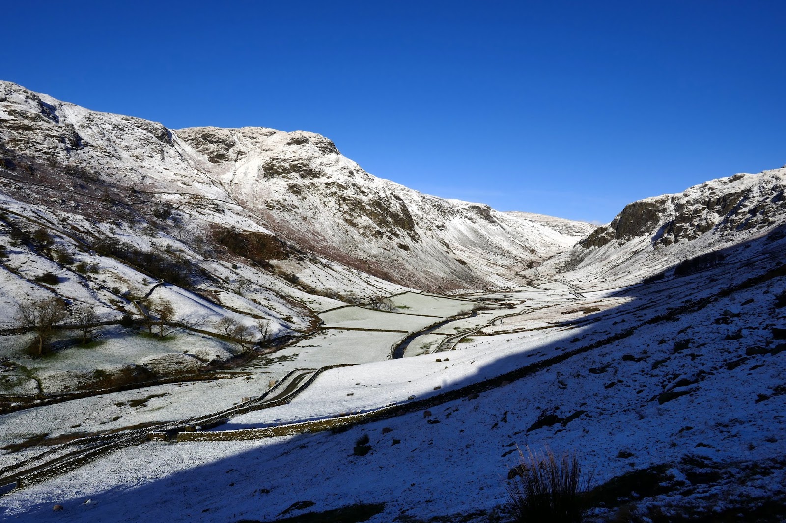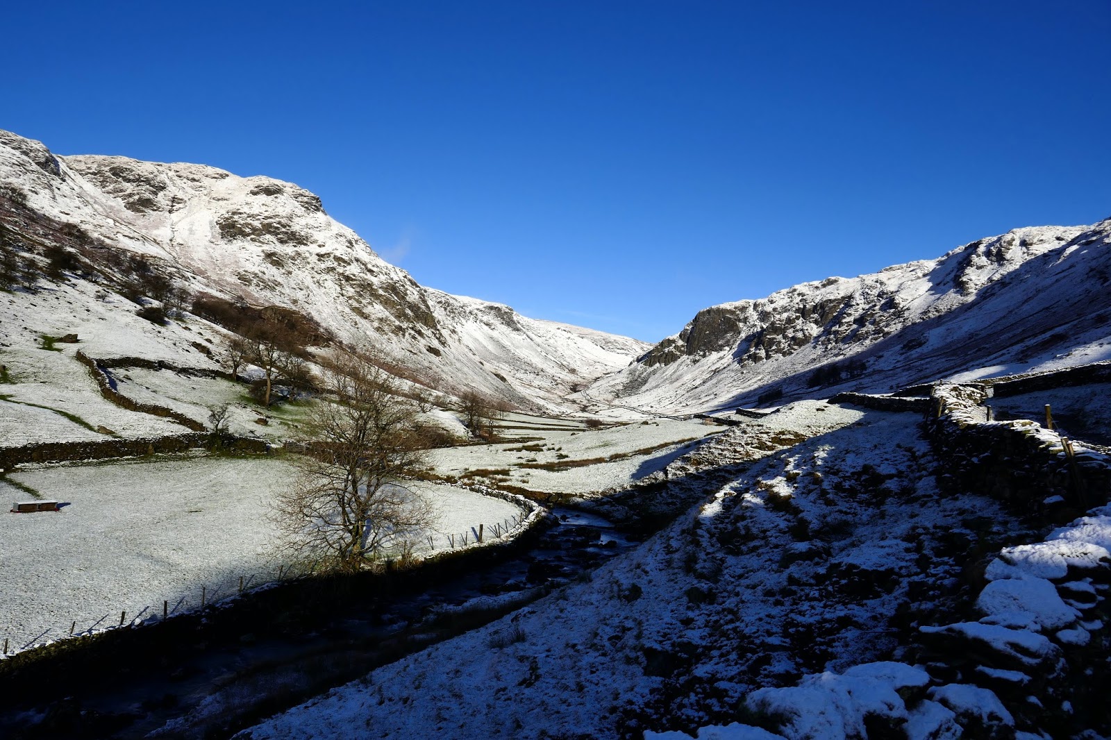 Winter has definitely arrived in the Lake District, temporarily at least. I arrived in Longsleddale to a perfect dusting of the white stuff, right down into the valley, backed up by perfect blue skies. It was cold as well, forecasts were suggesting a wind chill of around -10C.
