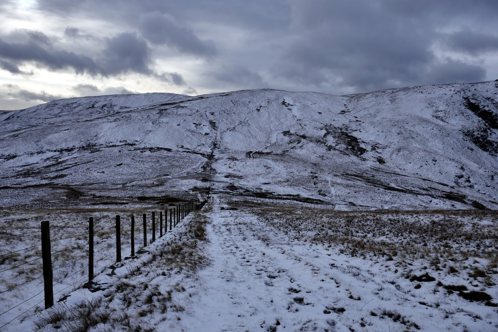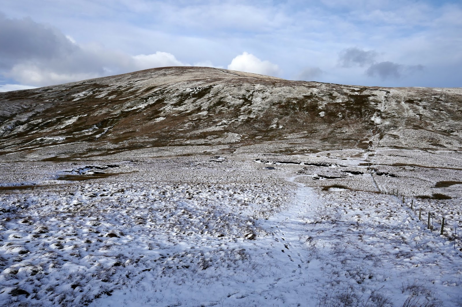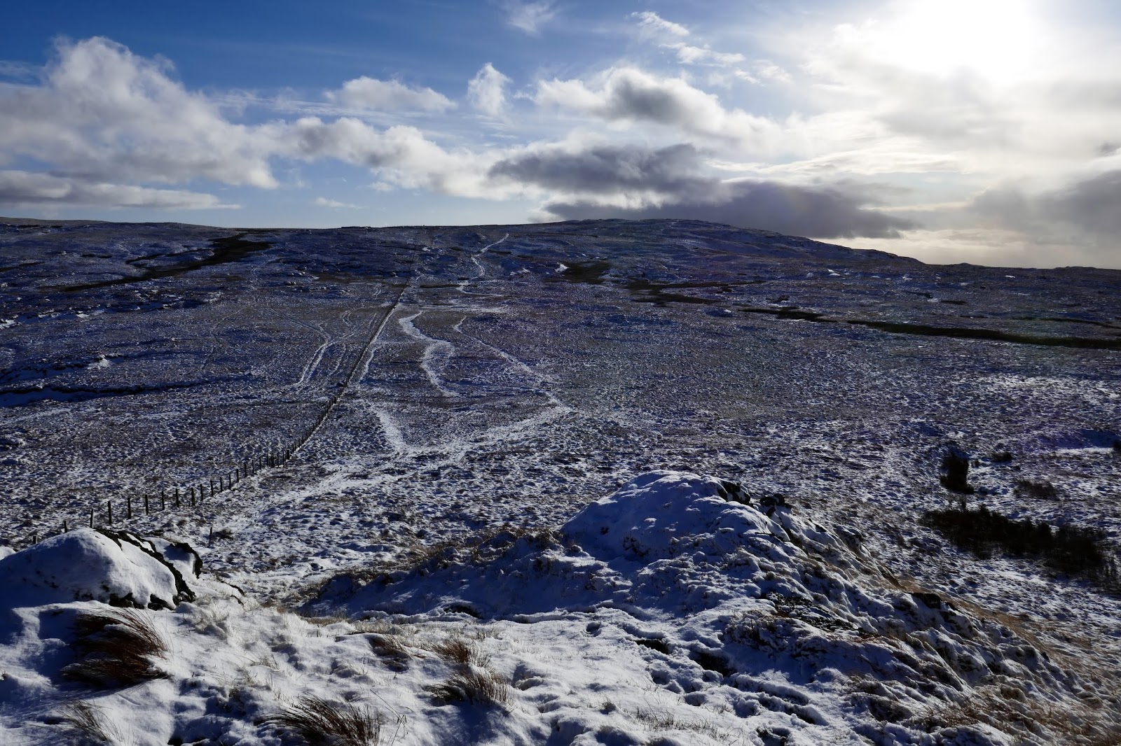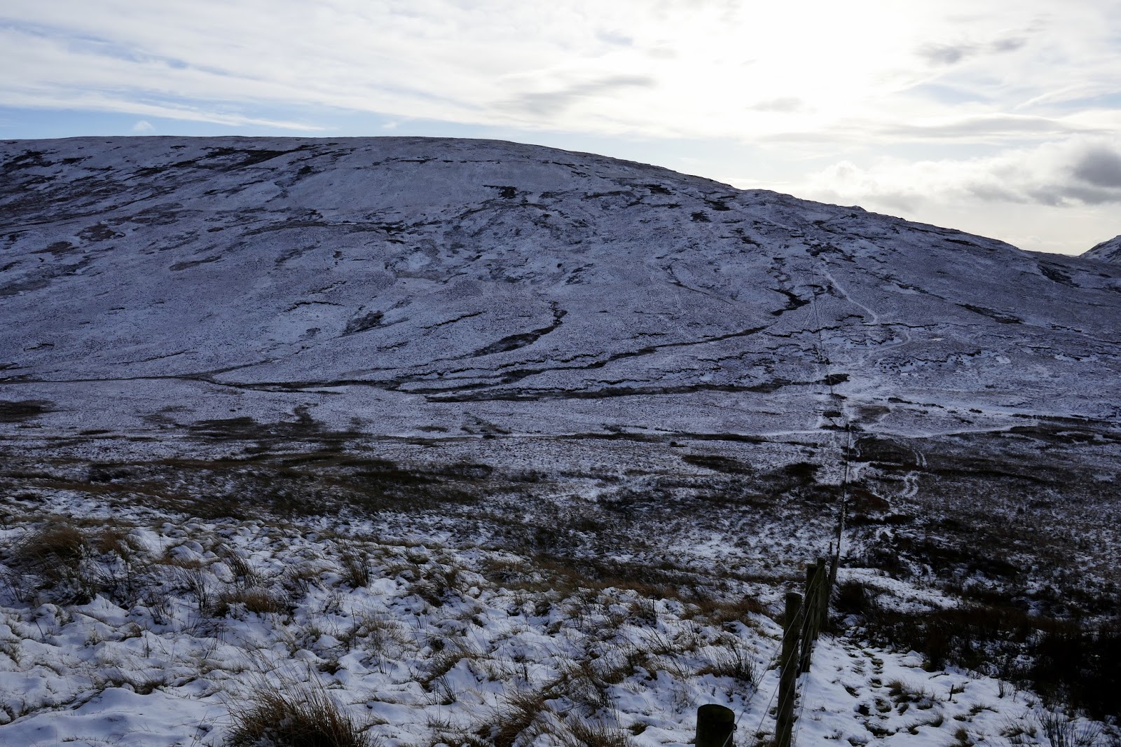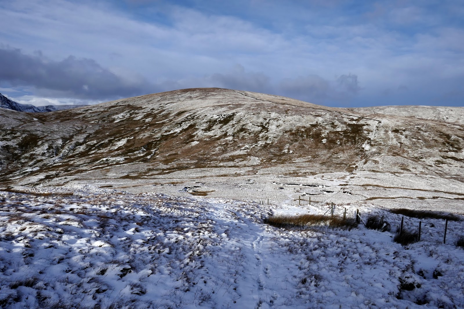 Tarn Crag is separated from the neighbouring Branstree by a boggy col above Brownhowe Bottom and Mosedale. It proved a little tricky to negotiate, particularly as the bogs were covered in a layer of concealing snow. In the end, the fence provided a suitably dry means of crossing.