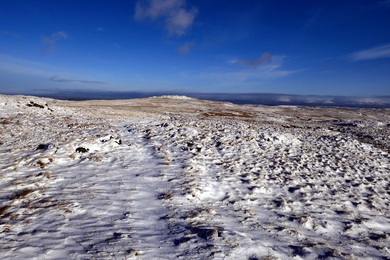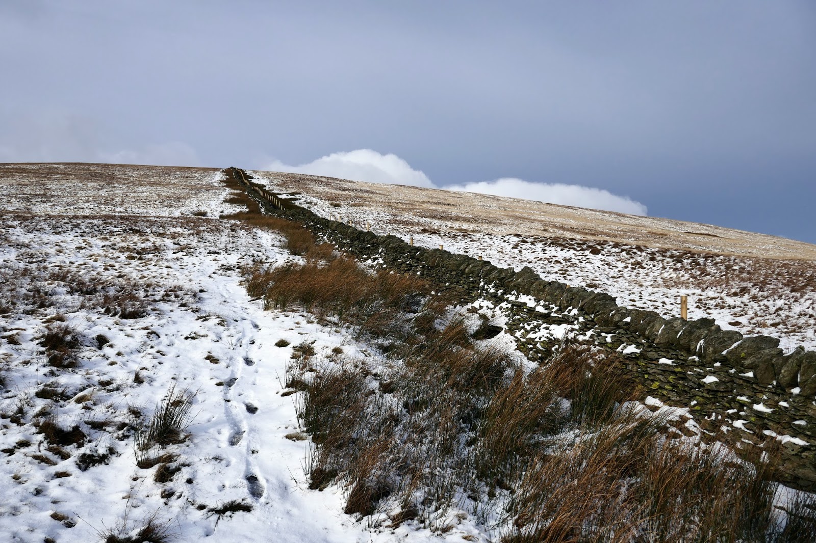 From Great Howe, the going is much easier for a while, crossing a flat area of open ground below the higher tops of Sleddale Fell and Tarn Crag. A vague path, just visible under the snow climbs up to the day’s first Wainwright – Grey Crag.