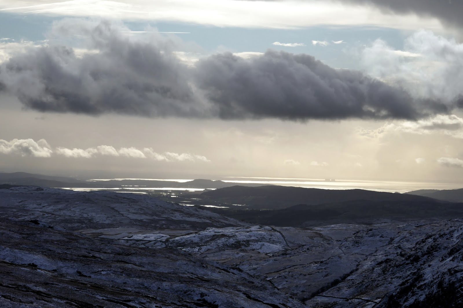| A snow shower looms over Morecambe Bay |