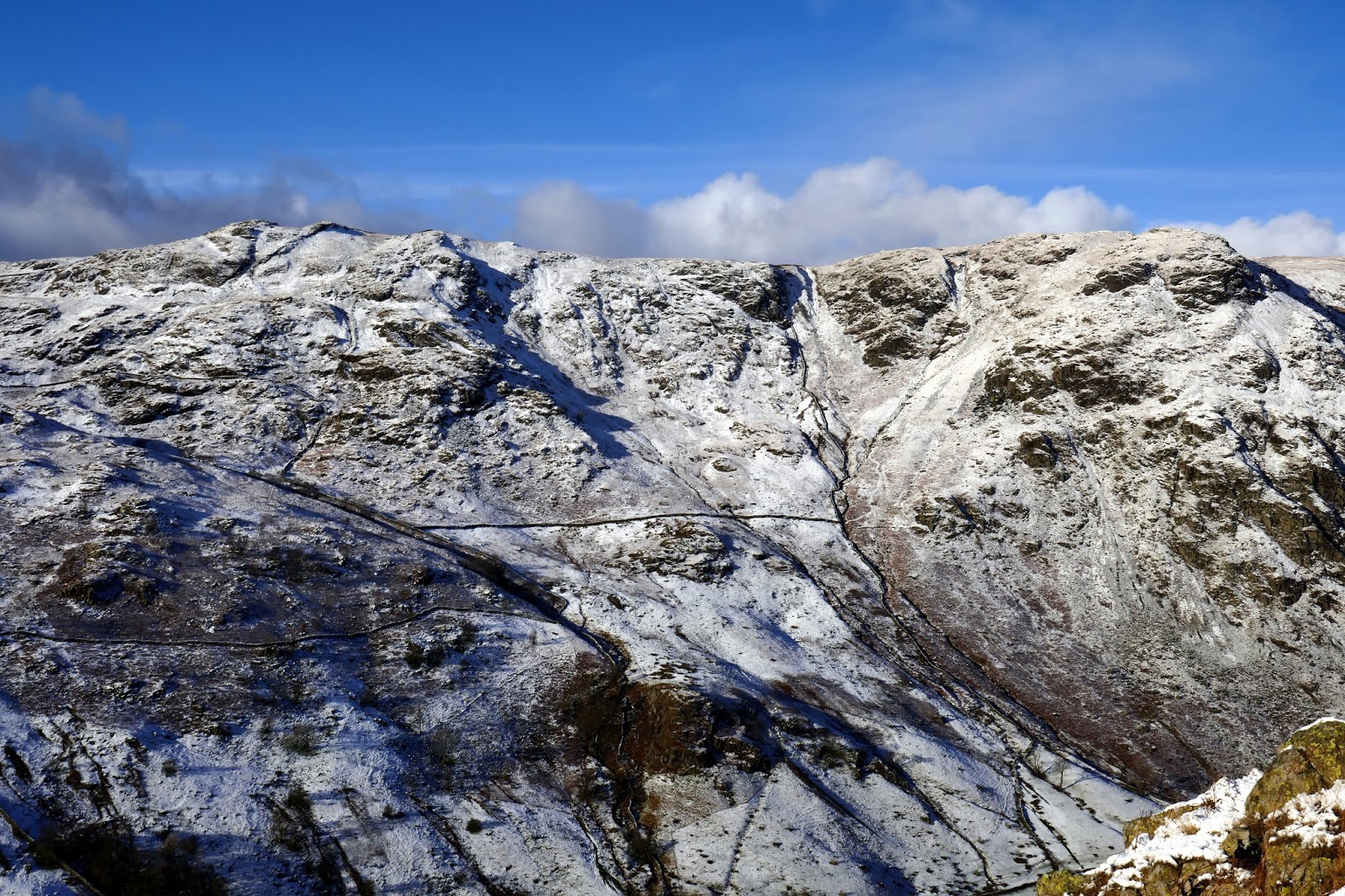 The Gatesgarth Pass would provide an obvious route back into Long Sleddale as it connects the valley to the neighbouring Haweswater. It’s a long trek back to Sadgill but it passes beneath the massive crags that ring the head of the valley. Goat Scar looks especially dominant. The valley level snow had all but gone by now if you compare photos you could be fooled into thinking it was two separate days.