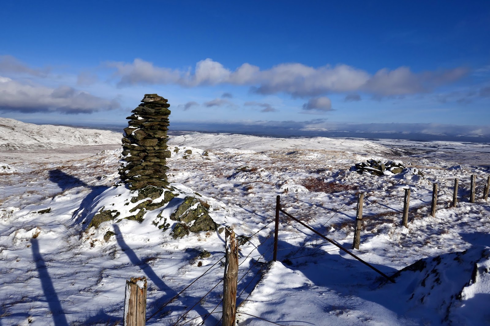 Half a mile to the northeast is a second top, Harrop Pike, only marginally lower than Grey Crag. A fence makes for Harrop Pike from the summit. Despite being slightly lower, Harrop Pike sports a more impressive columnar beacon and boasts expansive views east and south.