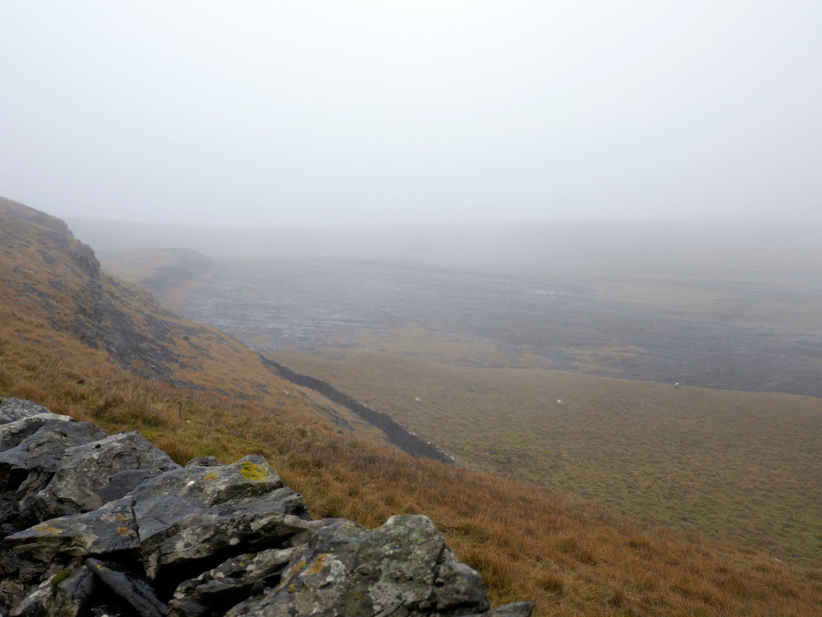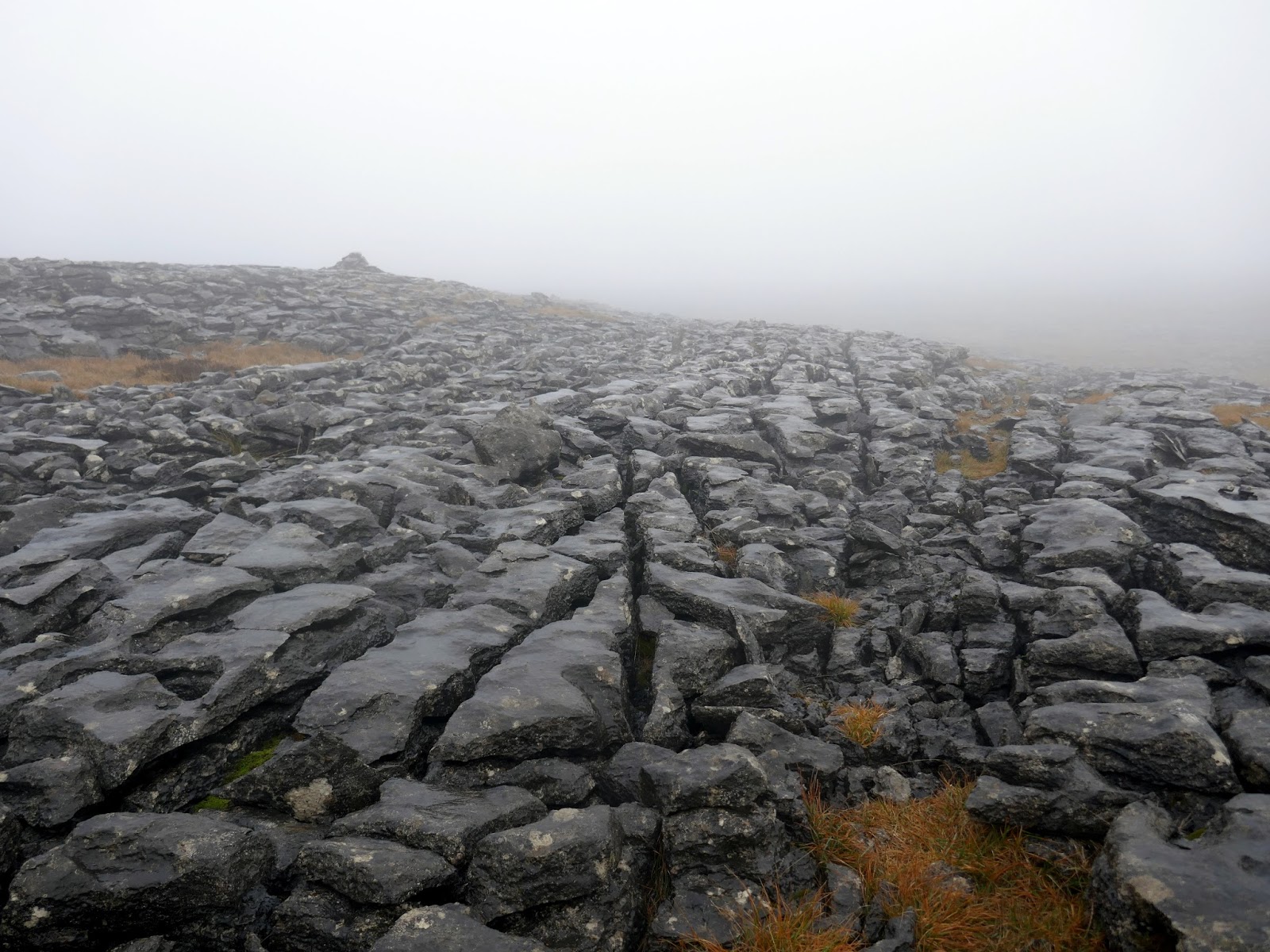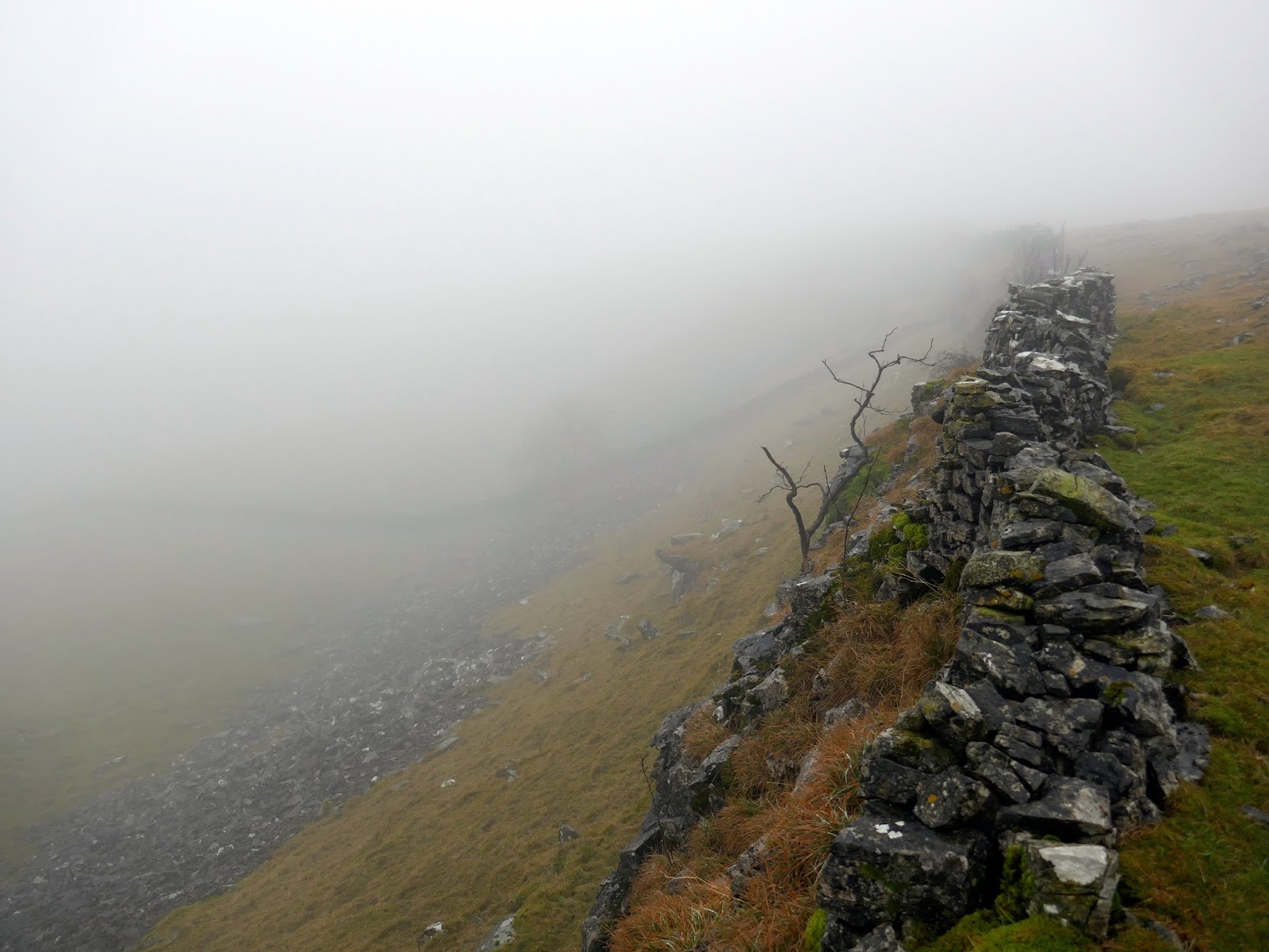 After a while, the path reaches a breach in the ramparts of Moughton Scars at Capple Bank and offers an easy way down into Crummack Dale. It’s possible to extend the walk up to the trig point further south but, with zero visibility and the ever-increasing sensation of wet feet, I decided that I’d begin my return to Austwick.