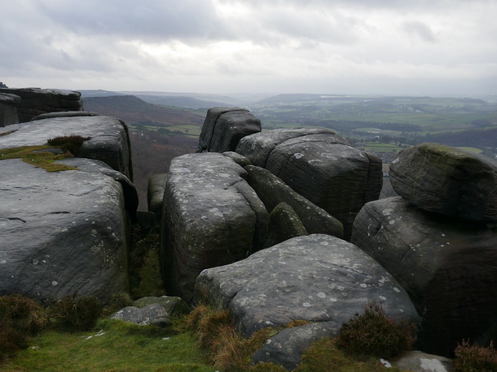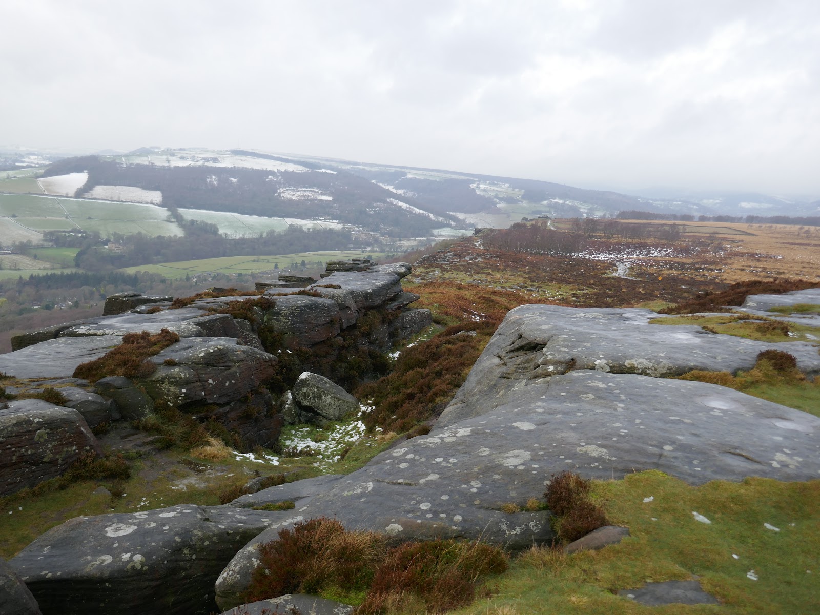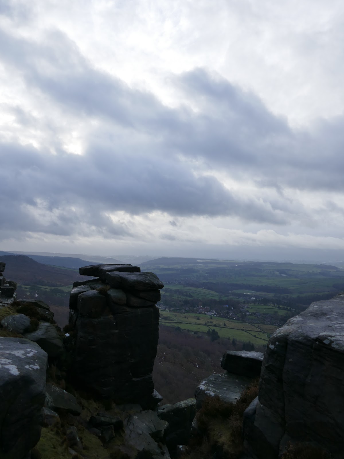 From Wellington’s Monument, the path swings round past the Eagle Stone and joins the southern end of Baslow Edge. The views south from the edge are superb, right along the valley of the River Derwent which was shining in the low sun. That said, the wind had really picked up and taking a steady photo was starting to get tricky.