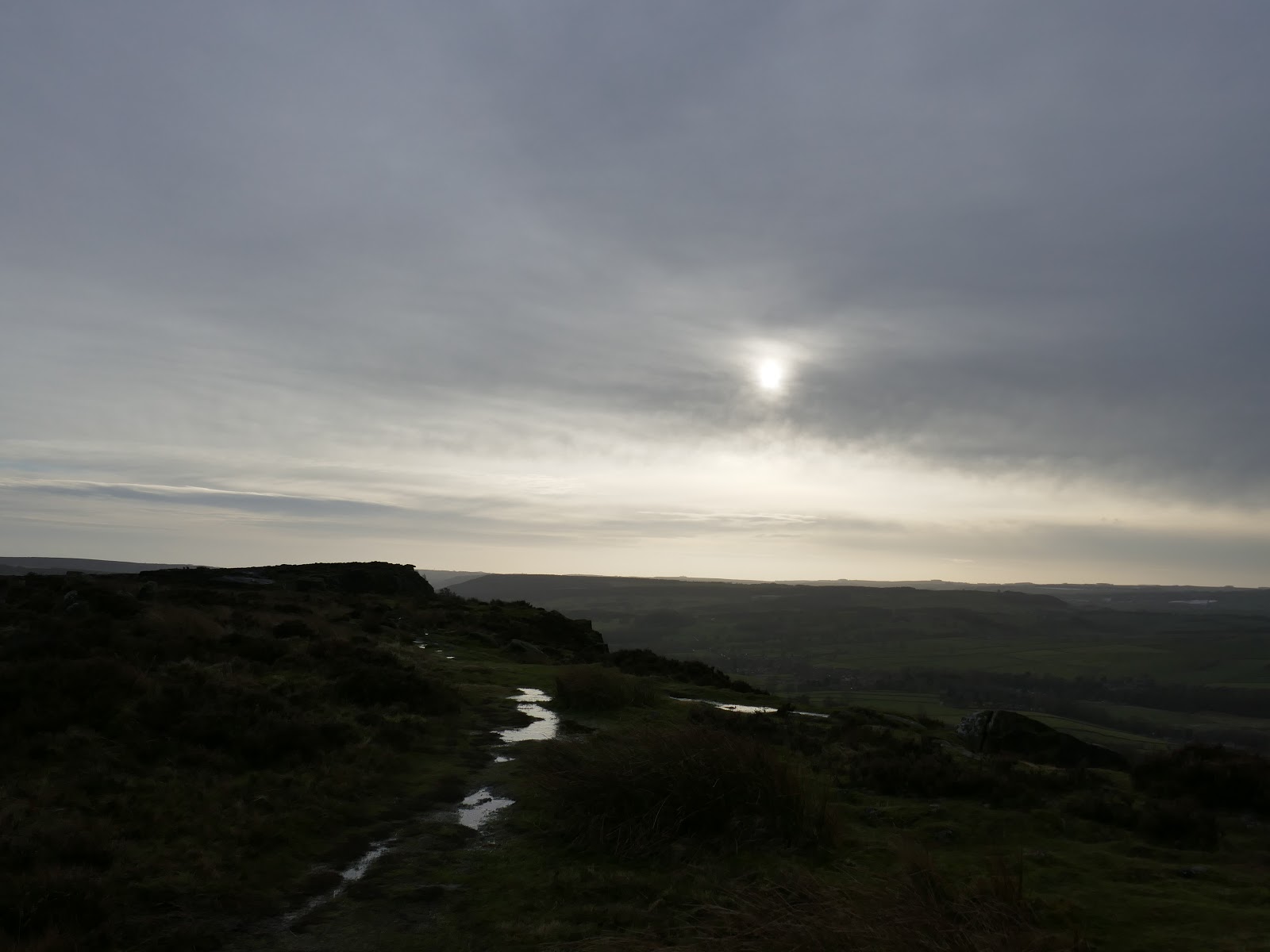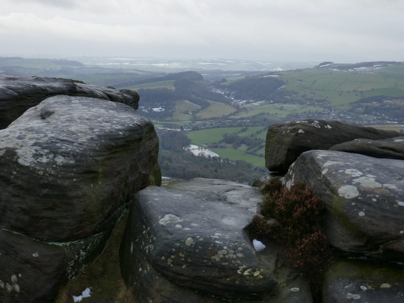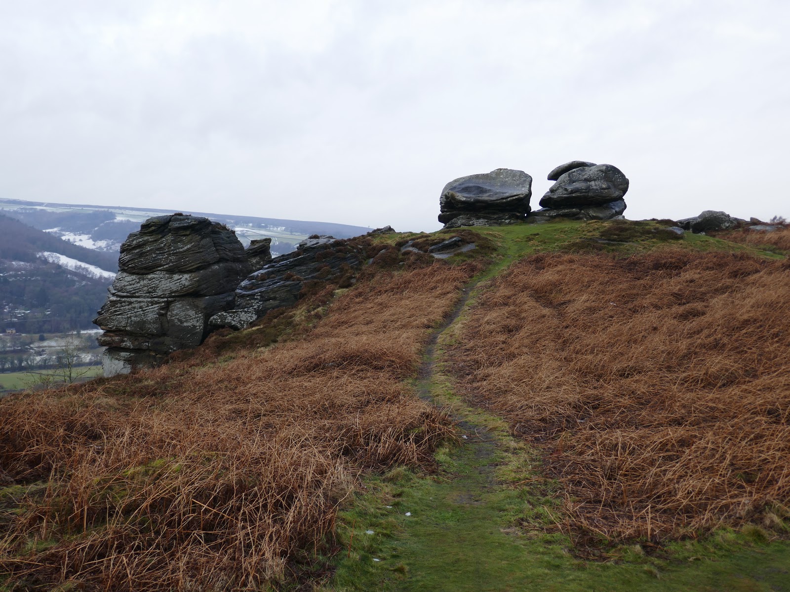 From Wellington’s Monument, the path swings round past the Eagle Stone and joins the southern end of Baslow Edge. The views south from the edge are superb, right along the valley of the River Derwent which was shining in the low sun. That said, the wind had really picked up and taking a steady photo was starting to get tricky.