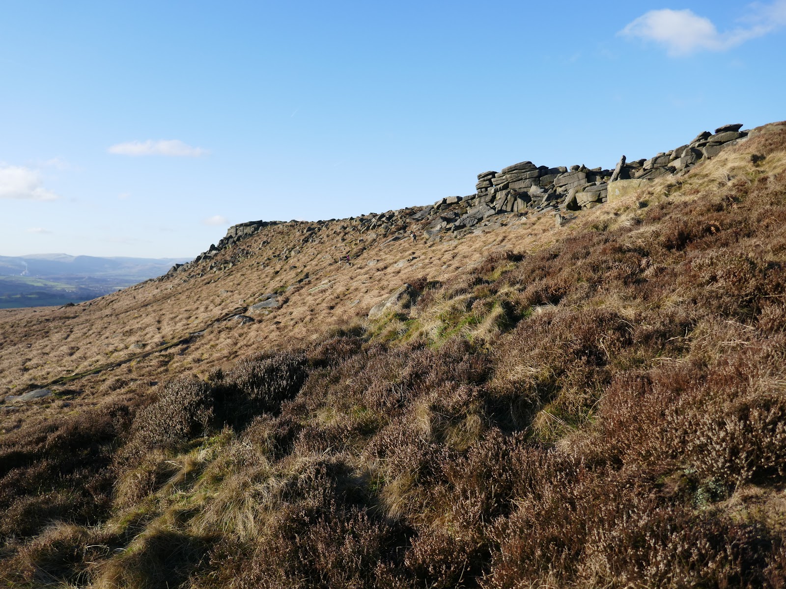 Burbage Rocks enclose the east side of the Burbage Valley, a basin that sits in the shadows of a number of scarps and edges; Burbage Rocks to the east and Carl Wark and Higger Tor to the west. Burbage Rocks, though quieter than Stanage, is still a popular spot for climbers and consists of a two-mile-long gritstone edge, though it lacks some of the drama of its larger neighbour.