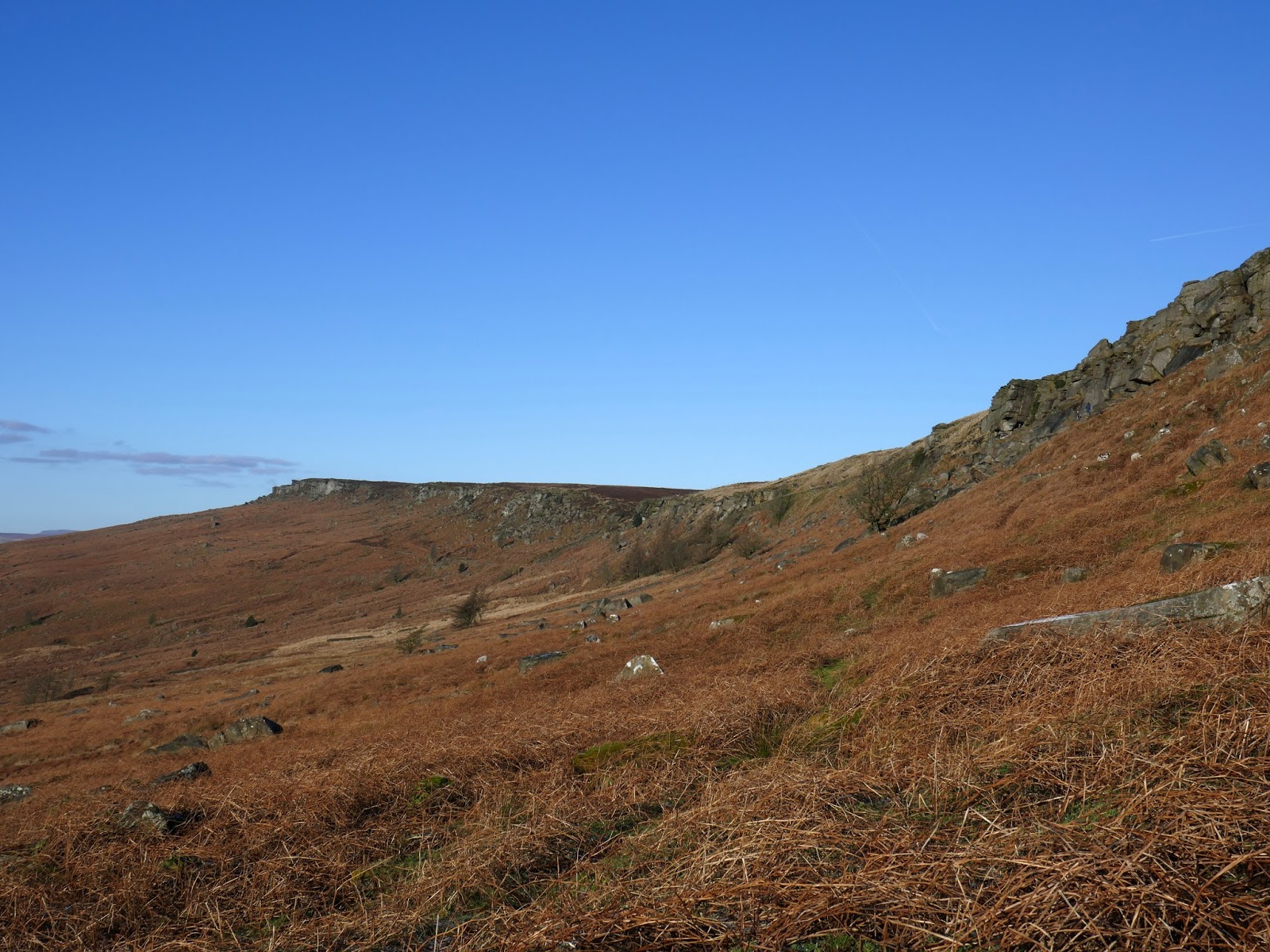 We followed the edge for a while, eventually using a path to cross the valley rather than heading to Burbage Bridge. The path crosses Burbage Brook and climbs up beneath Carl Wark.