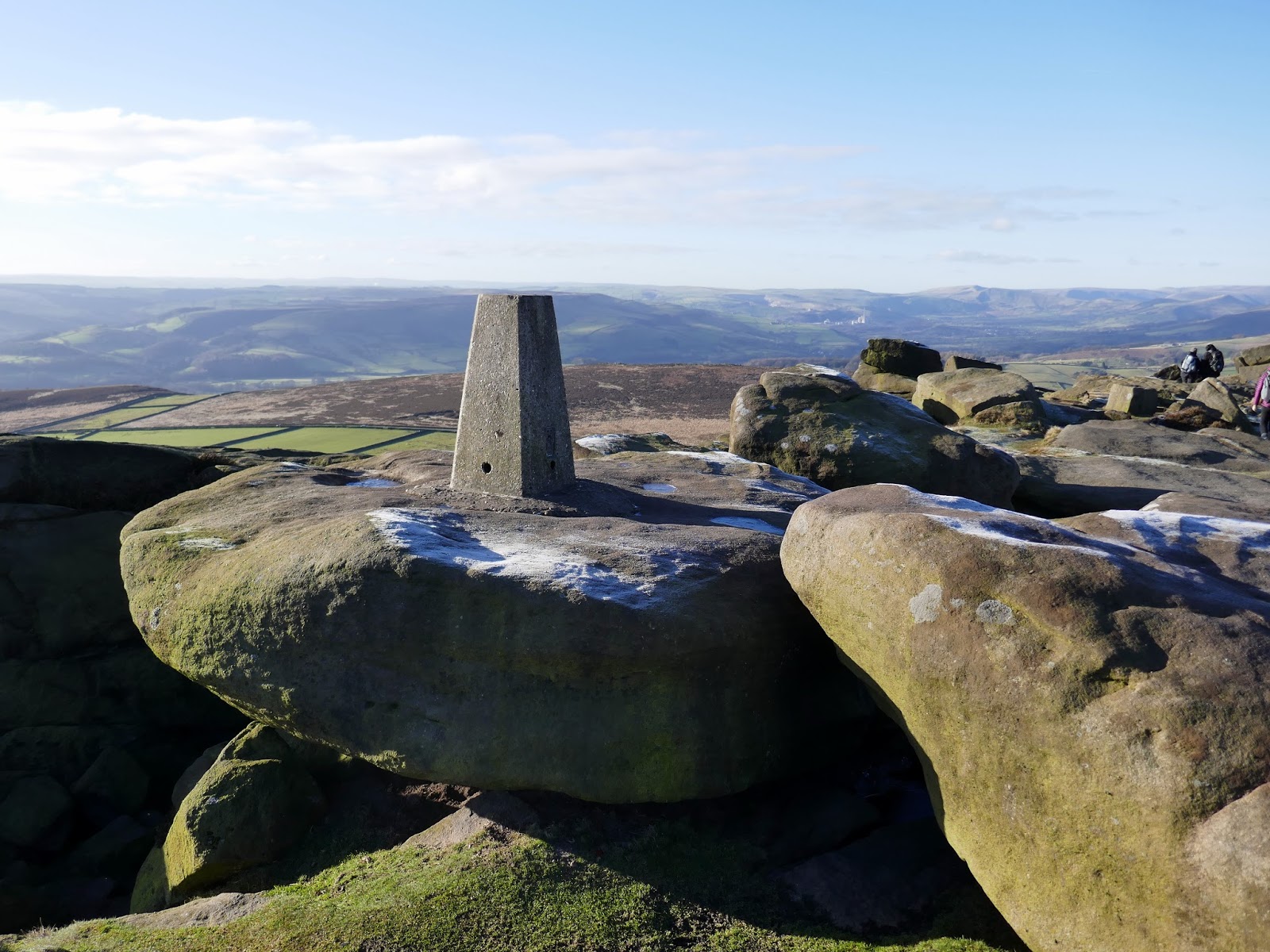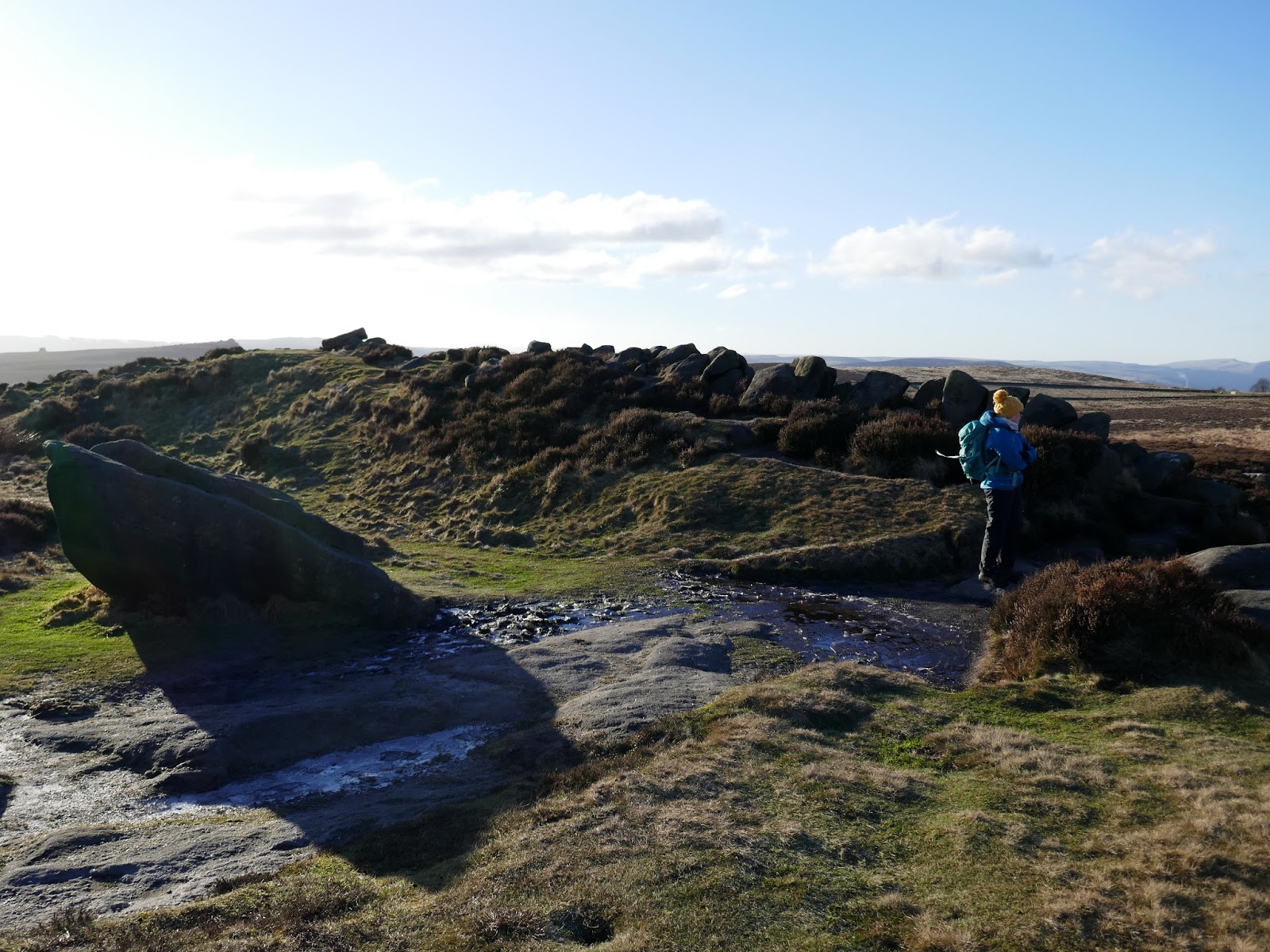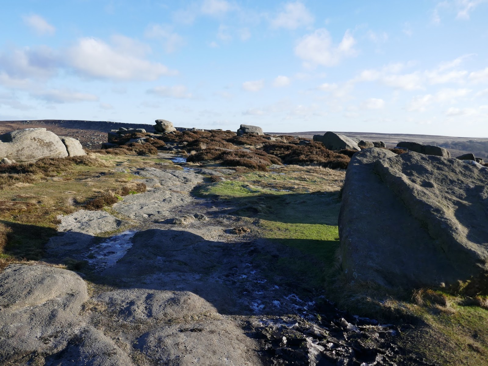 A cold wind was blowing off the moor, requiring us to wrap up warm despite the sun which was shining brightly as we made our way along the top of the edge. Reaching the trig pillar at the southern end, we continued on, passing the Cowper Stone and making our way to Upper Burbage Bridge.