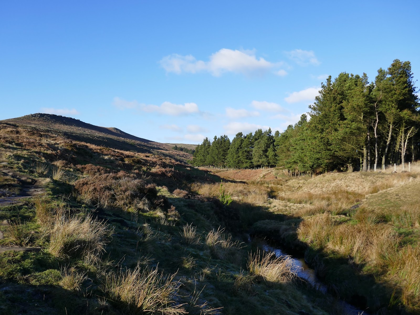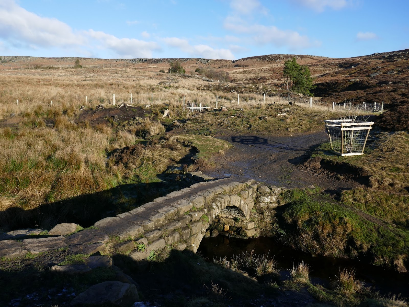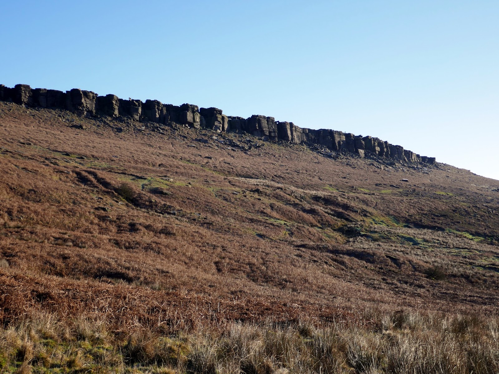 A cold wind was blowing off the moor, requiring us to wrap up warm despite the sun which was shining brightly as we made our way along the top of the edge. Reaching the trig pillar at the southern end, we continued on, passing the Cowper Stone and making our way to Upper Burbage Bridge.
