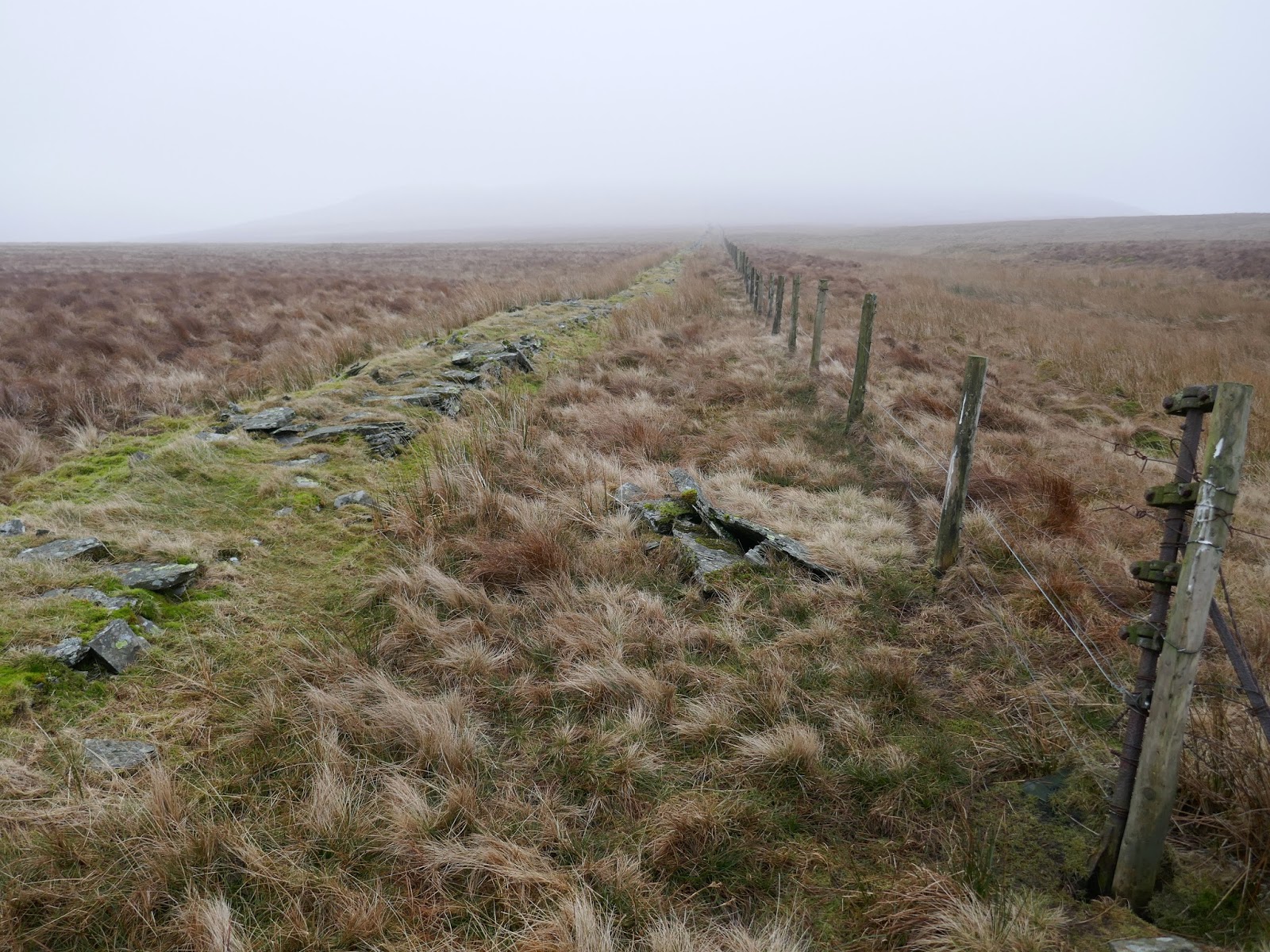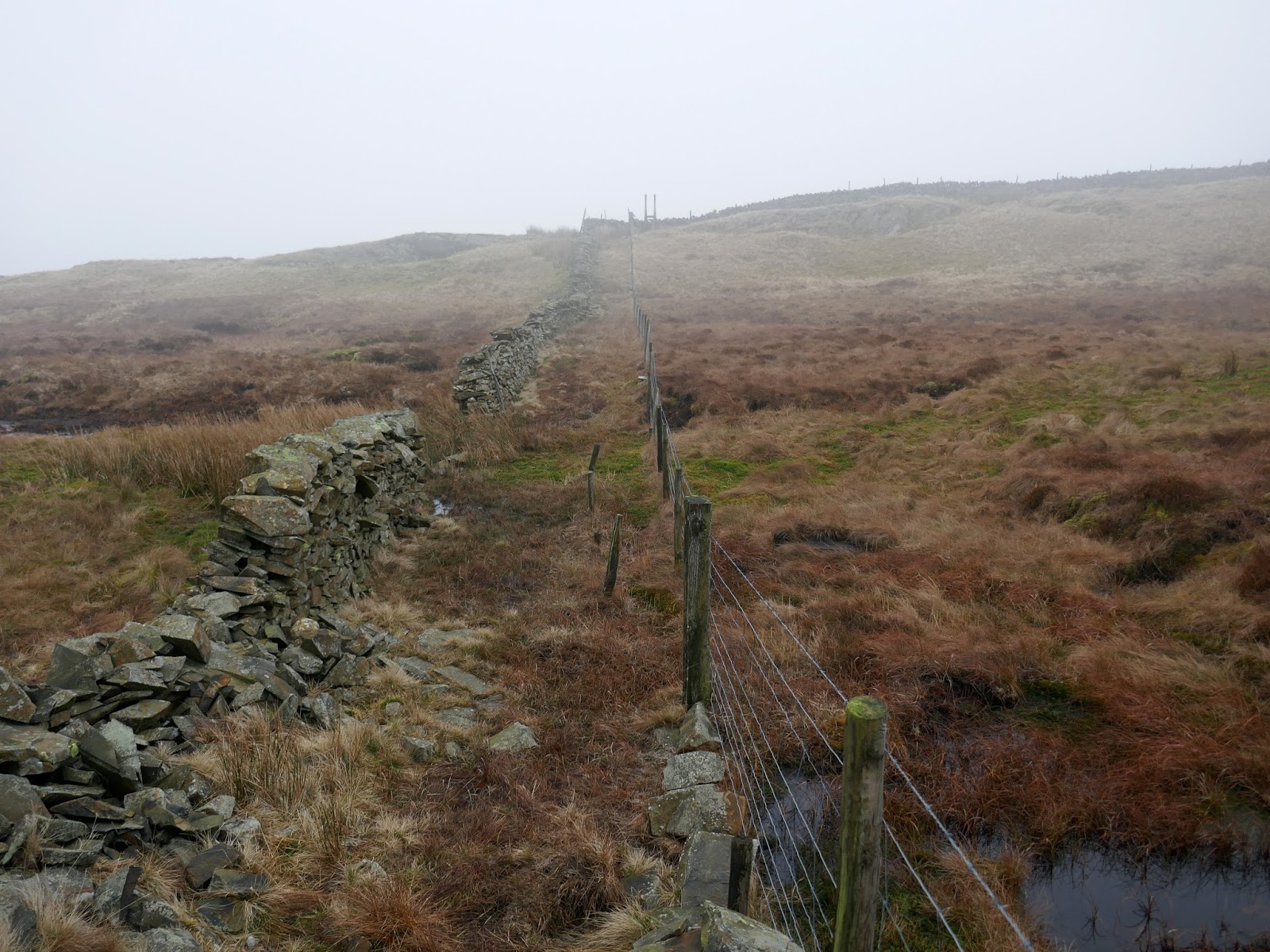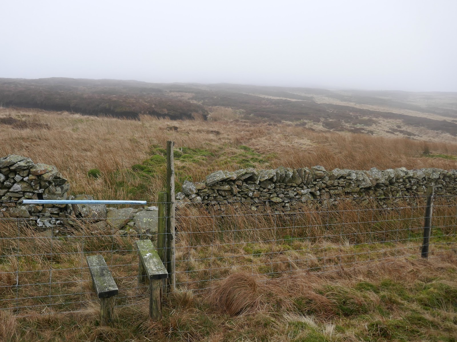 A faint path leaves Whiteside Pike, dropping into a depression before crossing a drystone wall using a ladder stile. Ahead, just visible through the mist, is Todd Fell, a small, grassy dome which favours views into Long Sleddale.
