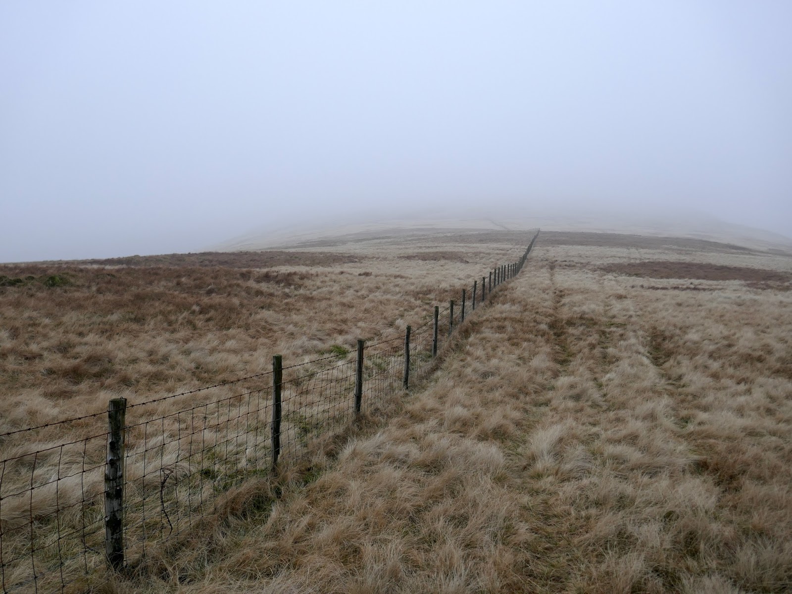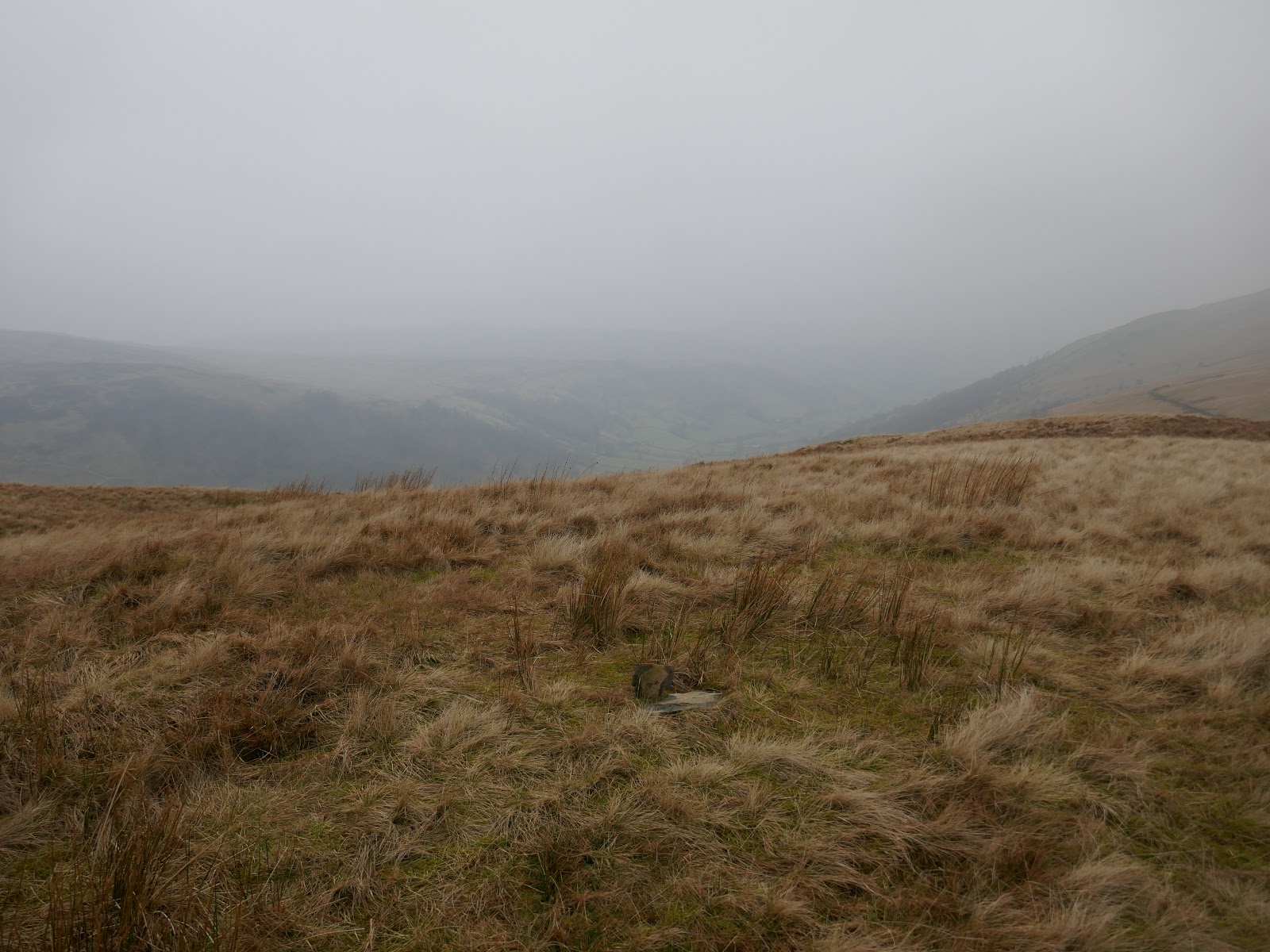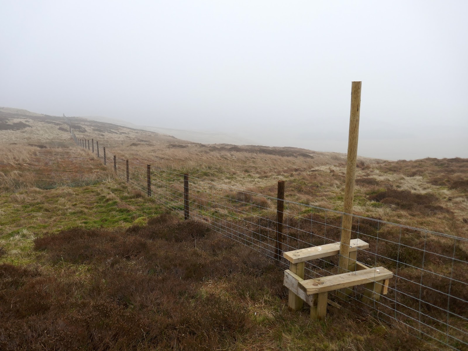 A faint path leaves Whiteside Pike, dropping into a depression before crossing a drystone wall using a ladder stile. Ahead, just visible through the mist, is Todd Fell, a small, grassy dome which favours views into Long Sleddale.