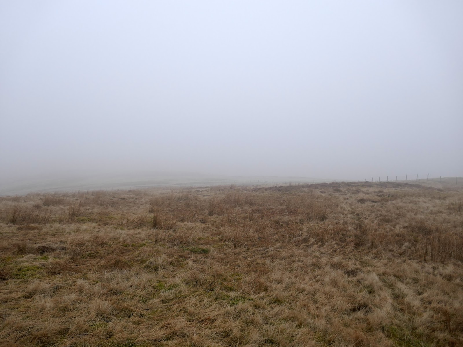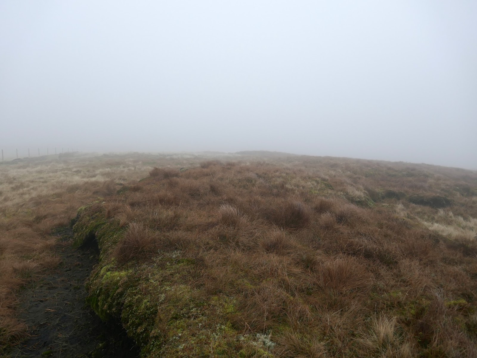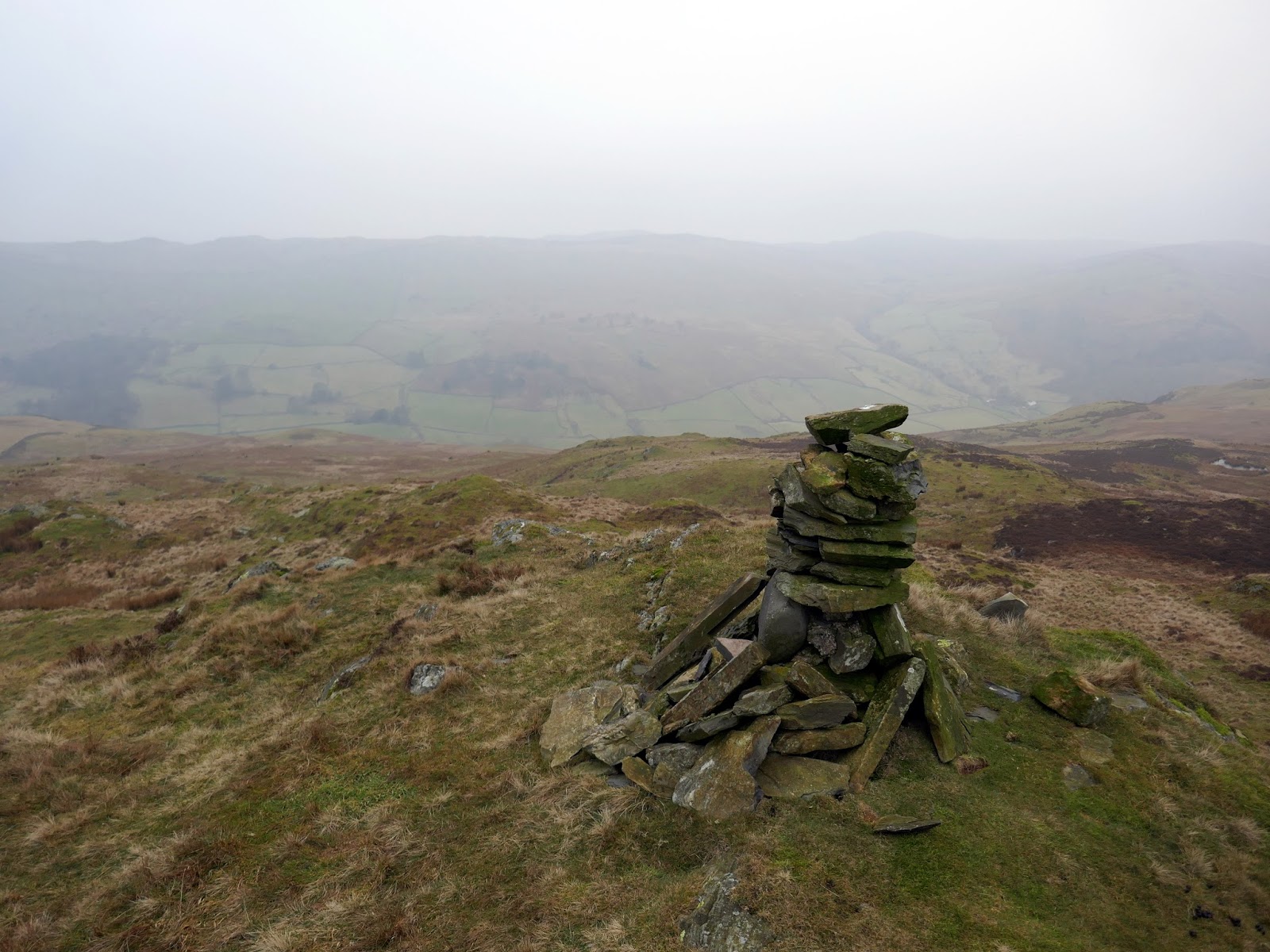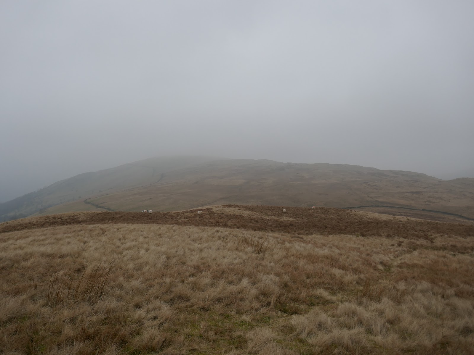 Trespassing complete, it was time to get a move on, climbing through pathless grass to reach the first and shapeliest summit of the day – Whiteside Pike. It was obvious from the climb up that my gamble had not paid off with the higher Bannisdale fells shrouded in the cloud. No views today, unfortunately. If you’re averse to grass, I’d probably stop reading now.
