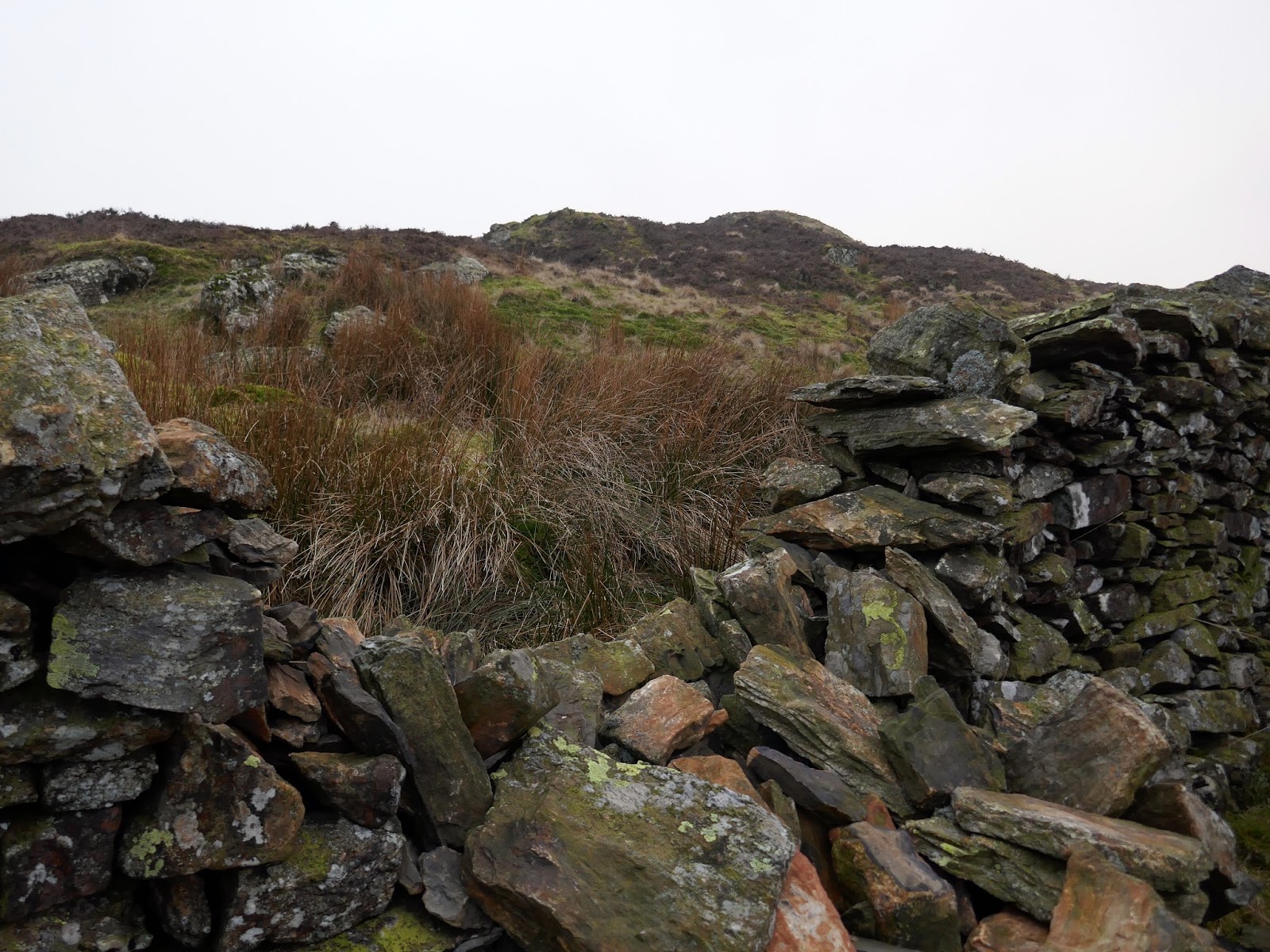 The route from Todd Fell to Capplebarrow (and for much of the rest of the walk) is straightforward enough as a fence or, in some places, drystone wall encircles the valley. A faint path follows the fence, crossing Cappelbarrow before a reaching a trio of small humps along the ridge; Swinklebank Crag, Ancrow Brow and an unnamed height at the head of the valley – confusingly called ‘Ancrow Brow’ in the Outlying Fells.