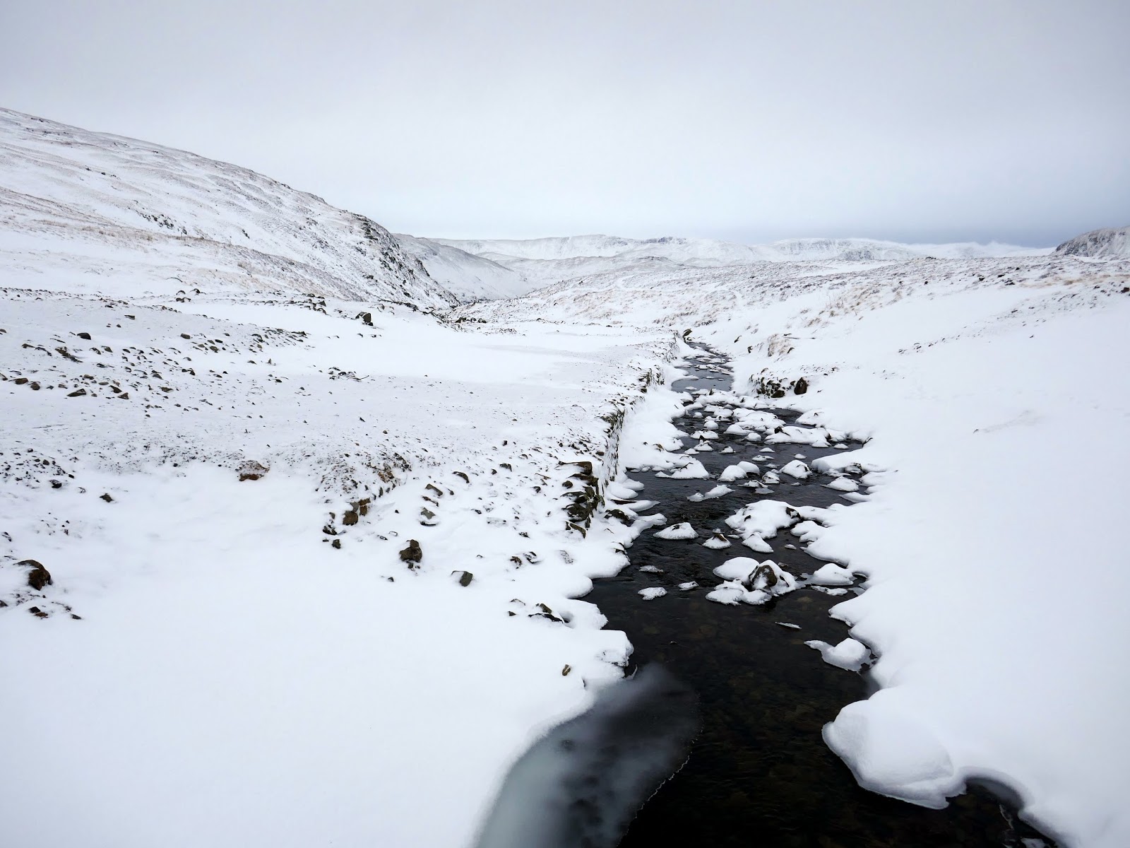 It’s a steady walk back downhill to the hut which would be our ending point, eliminating the long, tedious walk back to Glenridding. This was a super day, made all the more satisfying by the fact I almost didn’t turn up at all. The ‘snow socks’ really were a last minute purchase and I wouldn’t have travelled had I not ended up buying them – another, unusual piece of gear added to the inventory. It was disappointing not to do Striding Edge but it’ll be there next winter and for many after that, I just need to be patient.