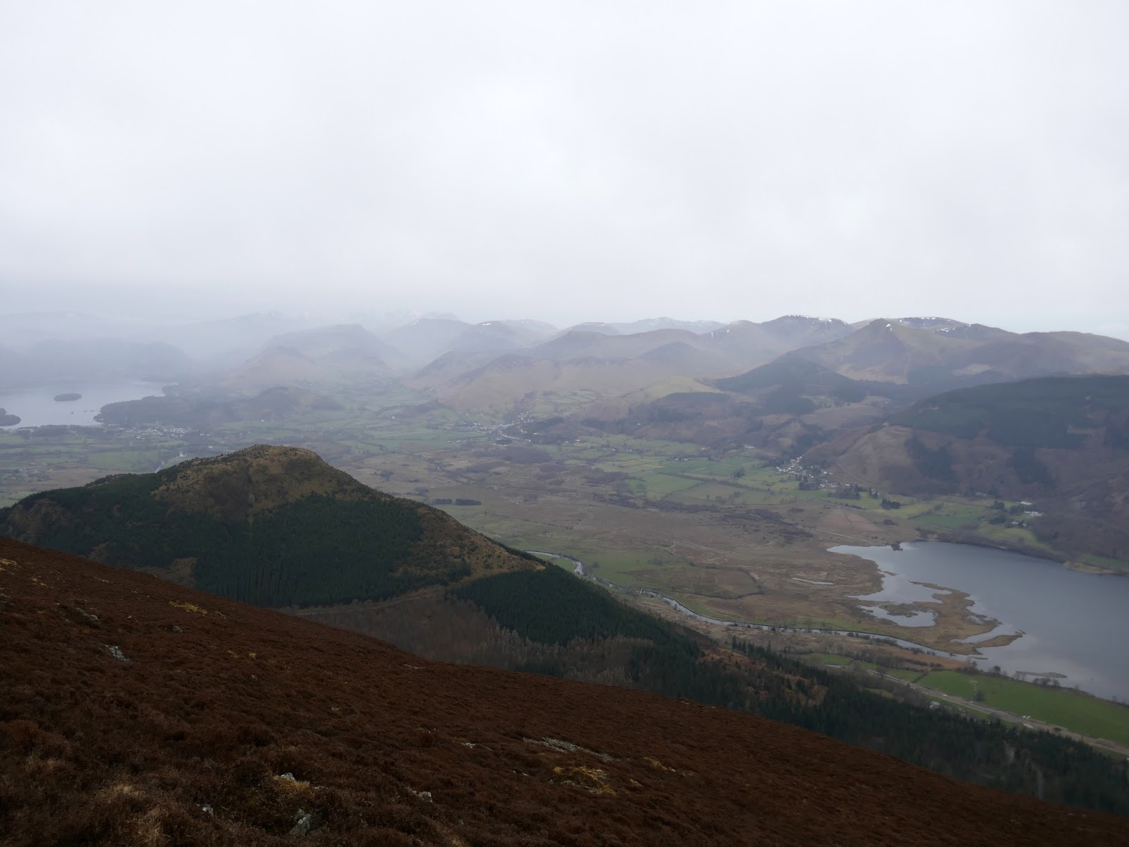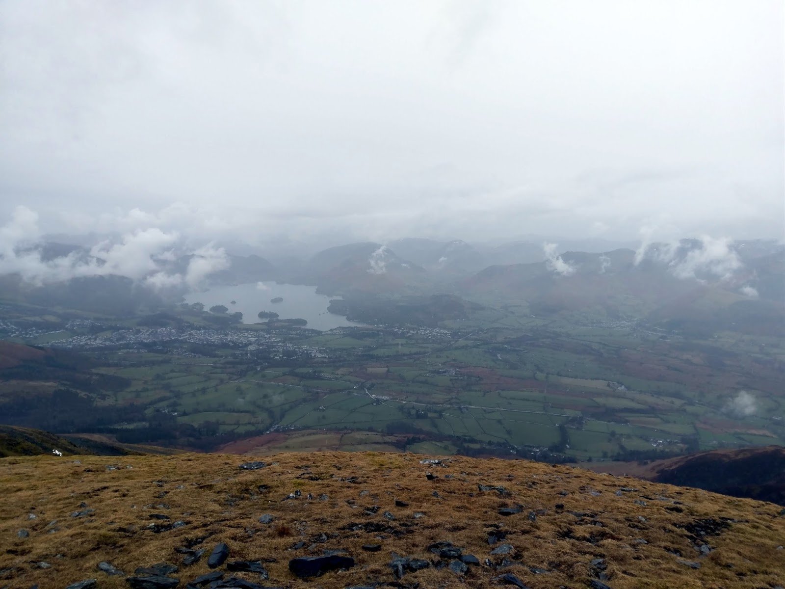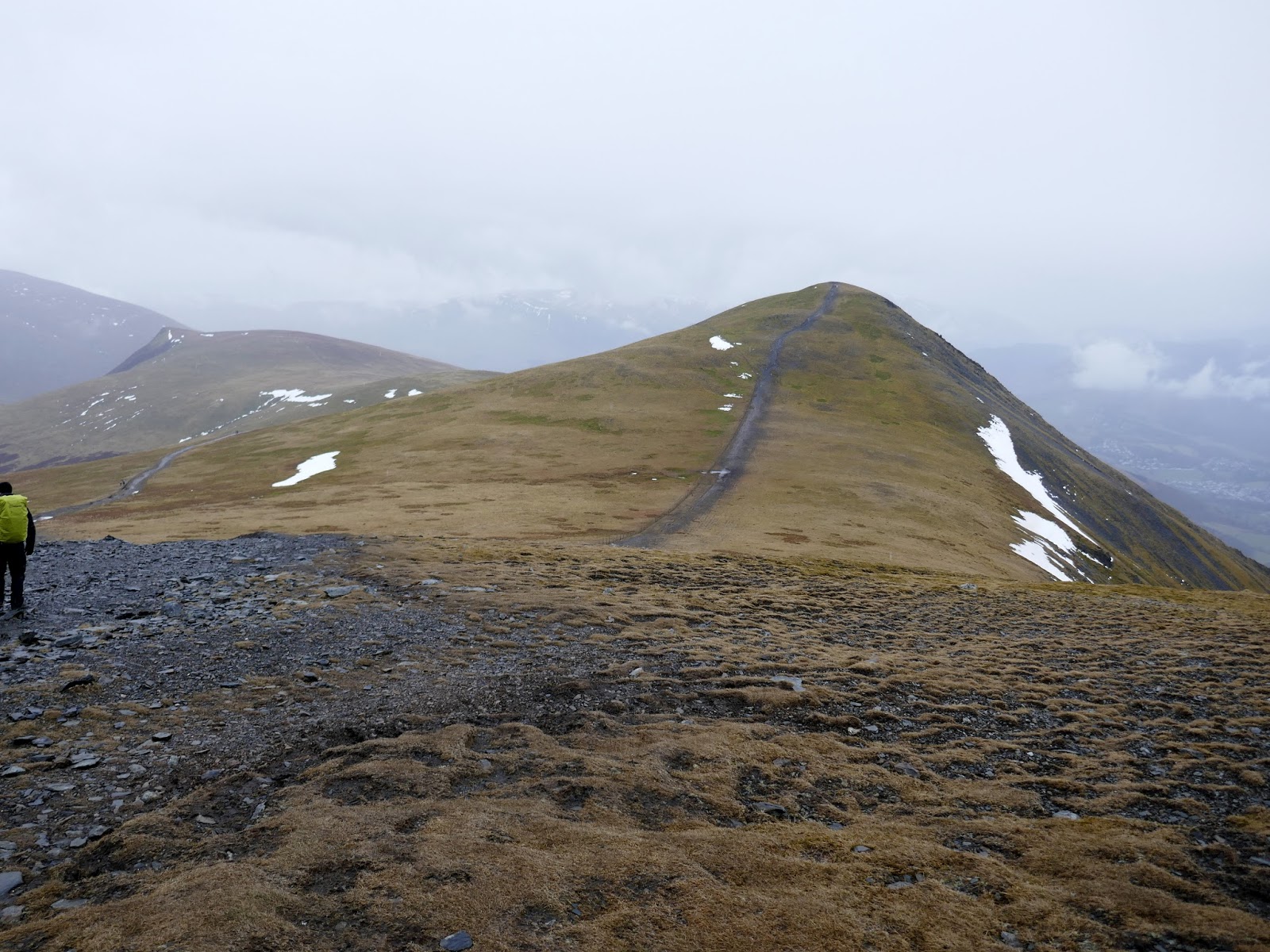 Once the summit formalities were complete (the obligatory snack-stop and photo) we were on our way again, bound for Skiddaw South Top and ultimately Skiddaw Little Man. Climbing the clear path reminded us that there was still a fair bit of walking to be done before we’d reach the car again and the legs were feeling a bit stiff after the punishment they suffered on their way up Skiddaw. Still, any climb seems a breeze after the slog up Skiddaw and before long, we were at the summit gazing down through the murk into Keswick and beyond towards Lonscale Fell.
