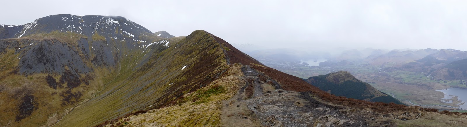 After crossing Ullock Pike and gazing down into the isolated valley of Southerndale, we continued on our way across Longside Edge to the fell Longside, a fell named for obvious reasons. Once again, the views of Bassenthwaite and the appearing Derwent Water are very good, with a new dimension added in our case by the hazy cloud that was starting to drift in, bringing with it the forecast rain. The path up the scree to the summit of Skiddaw was looking unpleasantly steep.