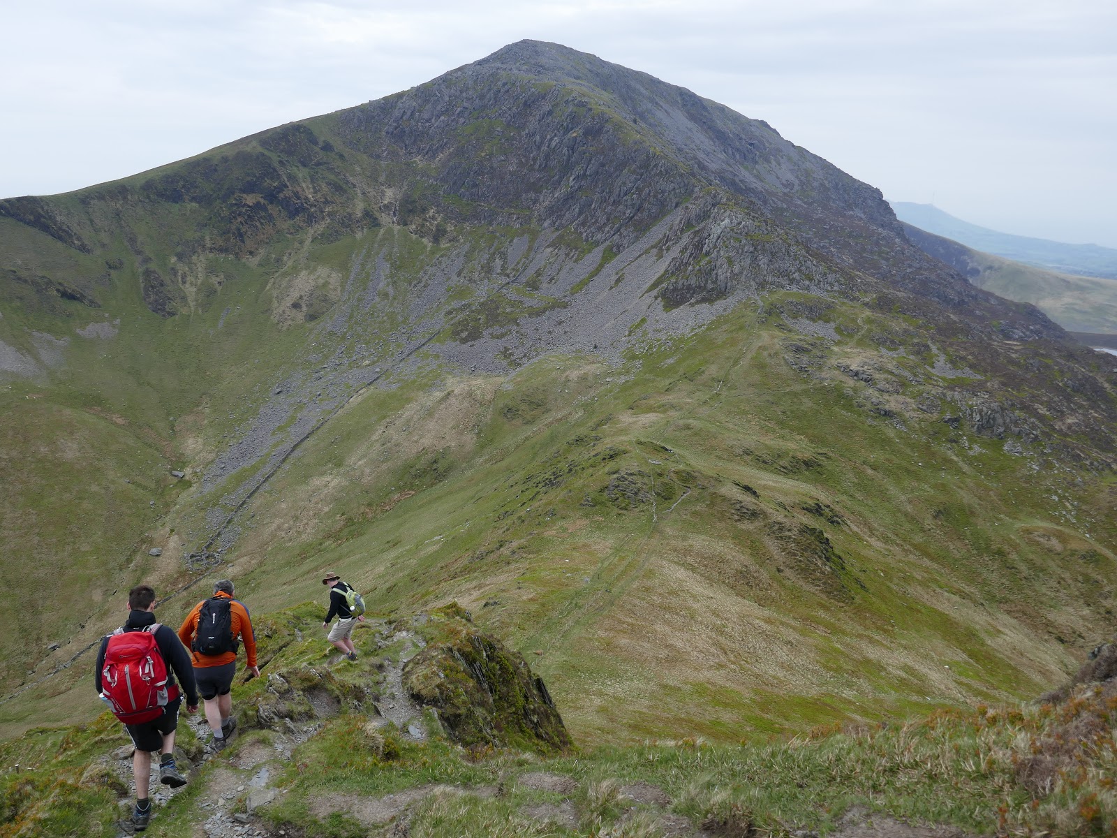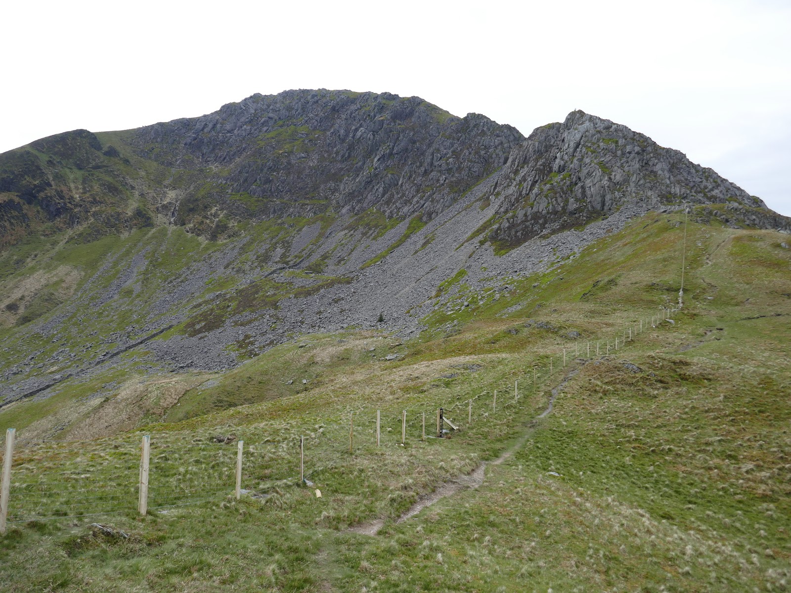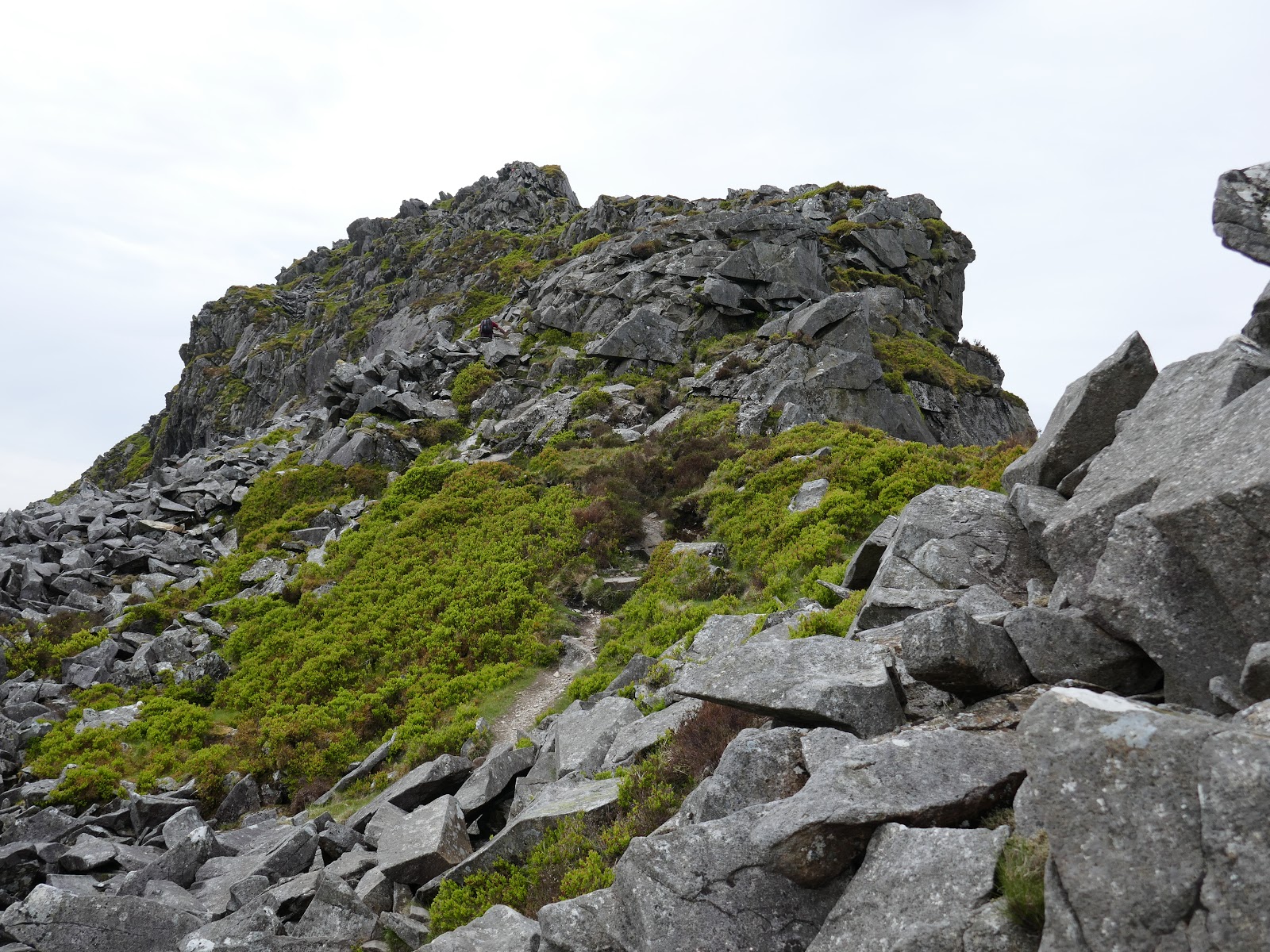 We set off underneath cloudy skies heading for Y Garn, the first peak of the ridge. Leaving Rhyd-Ddu, we followed the B4418 a short distance before joining the bridleway at Drwsycoed Uchaf and heading towards the mountain. Unmarked on the map is a path that makes a direct ascent of Y Garn’s eastern slopes. It’s a steep, uninspiring climb.