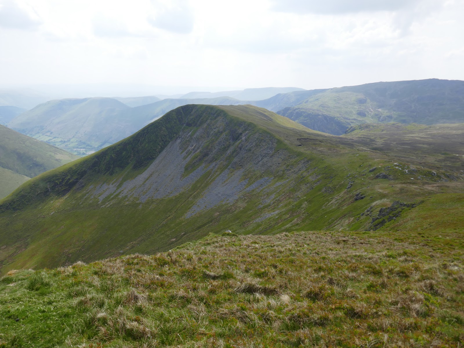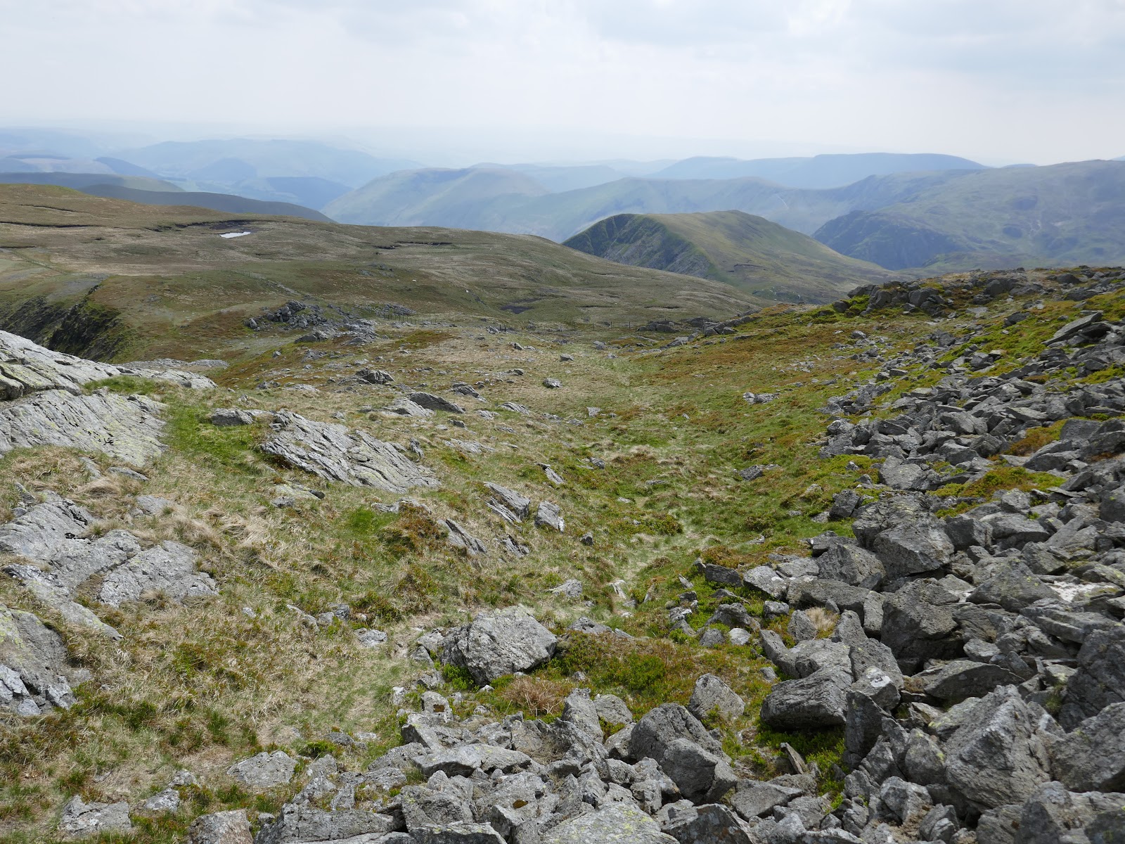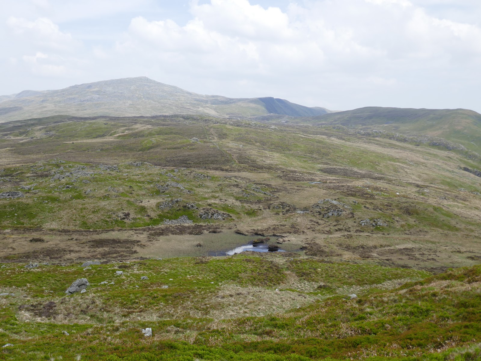 From Glasgwm’s summit, the path heads steeply downhill to a col. Here the ground is quite wet but it was easy enough finding a dry route across given the lack of rain we’ve had recently. In fact, the upcoming stretch between the col and Aran Fawddy is known to be very wet and boggy – the next peak is a testament to it.