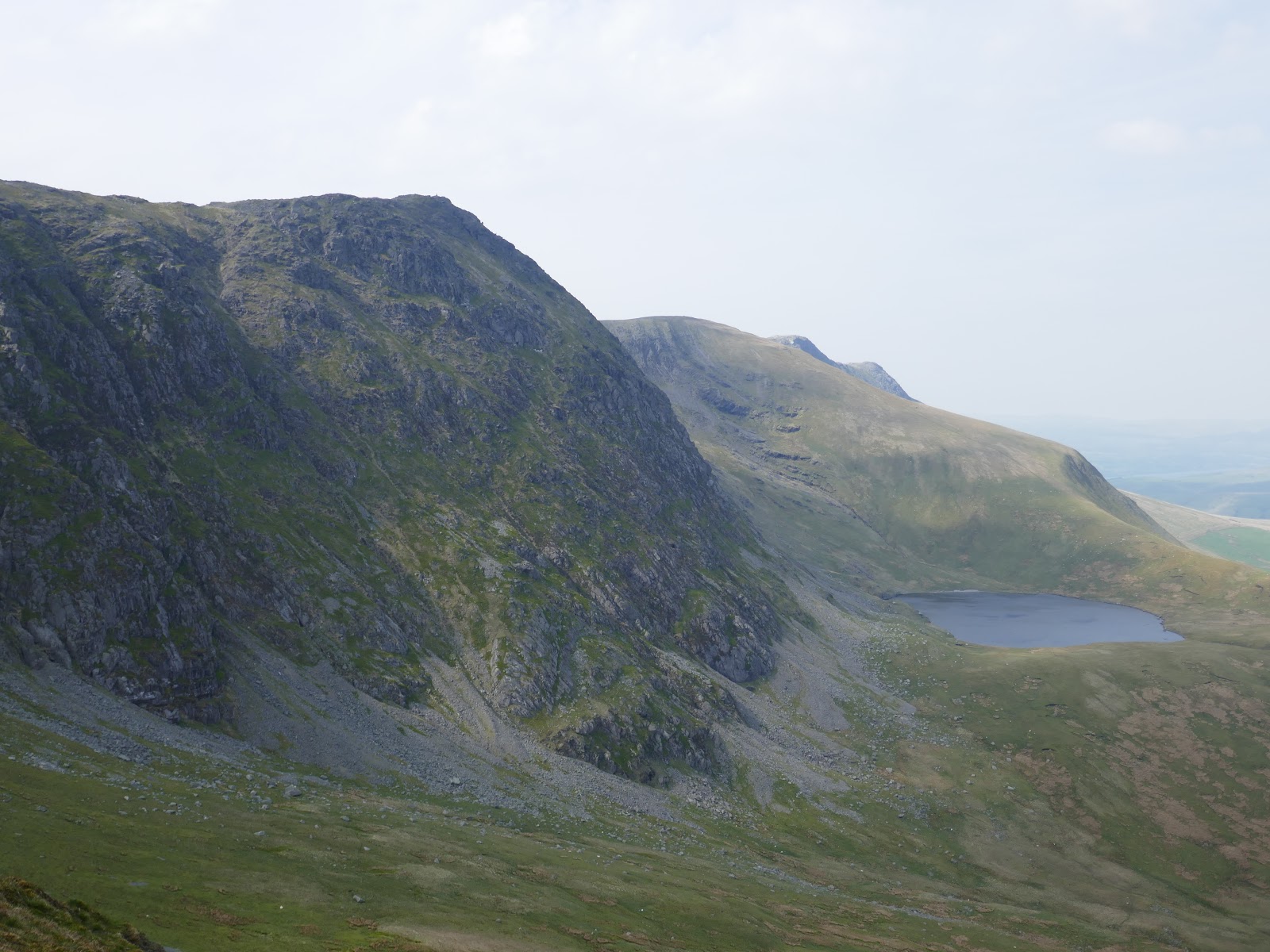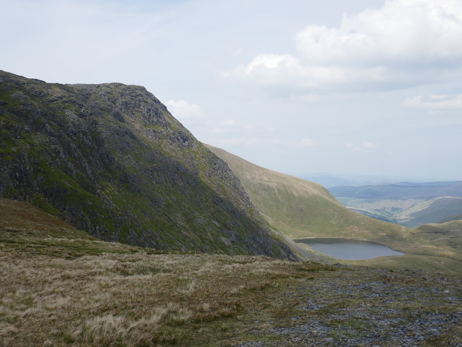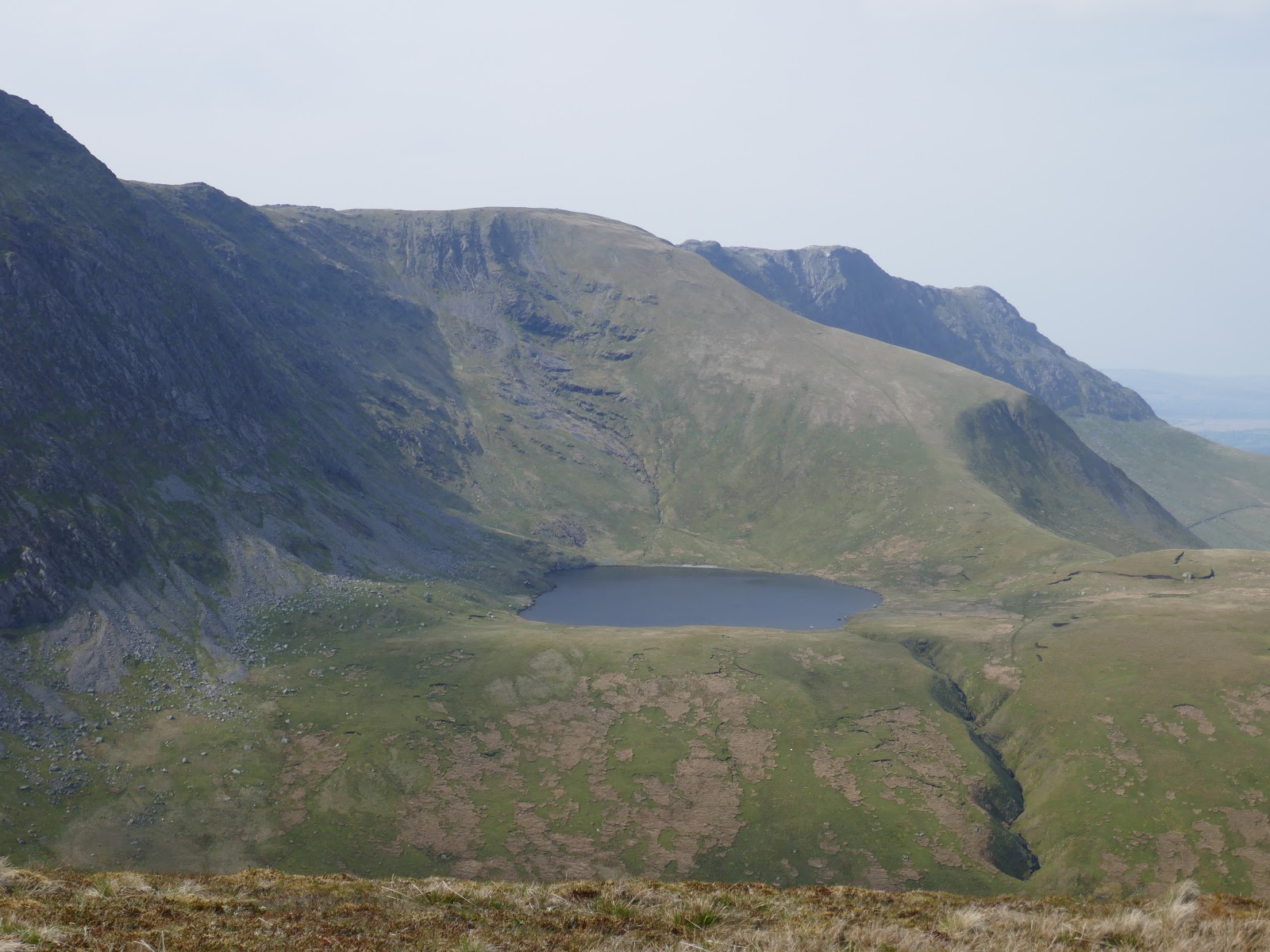 After two previous days walking I was starting to flag a little at this point. Ahead is a short descent before more climbing along the rim of Hengwm towards Drws Bach – a top I’d visit later on. Here, the craggy face of Aran Fawddy finally comes into view with the impressive 1,000ft cliffs falling to the small lake of Creiglyn Dyfi.