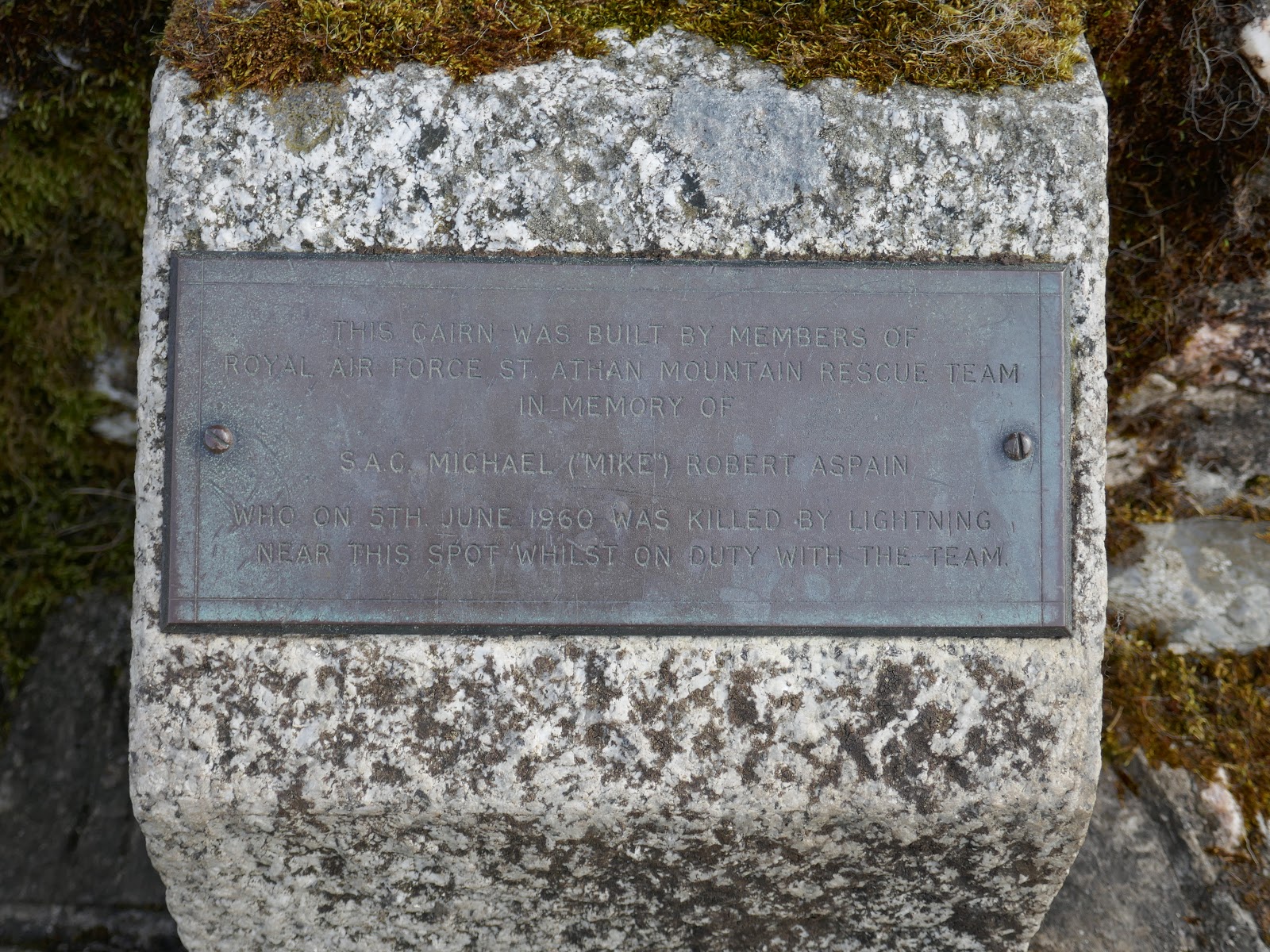 “This cairn was built by members of the Royal Air Force St. Athan mountain rescue team in memory of S.A.C. Michael (“Mike”) Robert Aspain who on 6th June 1960 was killed by lightning near this spot whilst on duty with the team.”