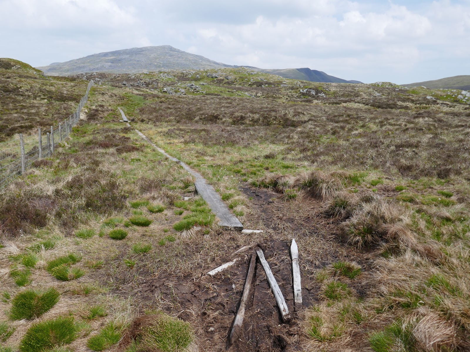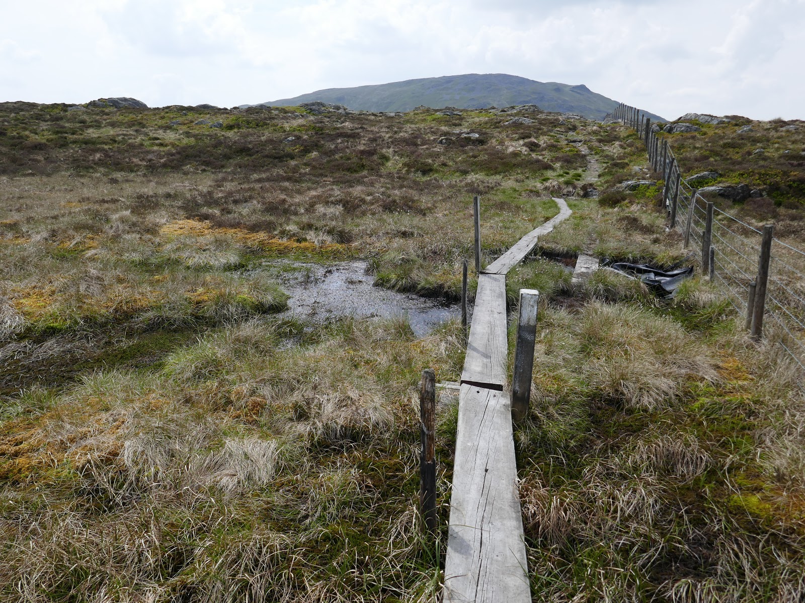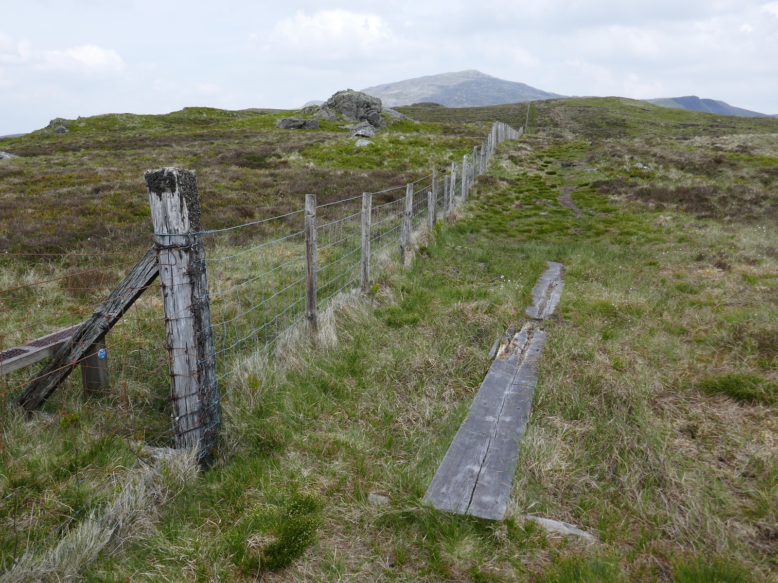 Waun Camddwr translates as ‘Moor of the Crooked Stream‘ and is the source of several streams which make thier way in various directions. Route finding between the col and the summit is easy thanks to a wire fence that links the two. There are numerous long, wooden boards laid down against the fence, an aid in crossing the area when the bogs are present. Fortunately for me, they were largely dry and it was a quick, easy stroll to the top.