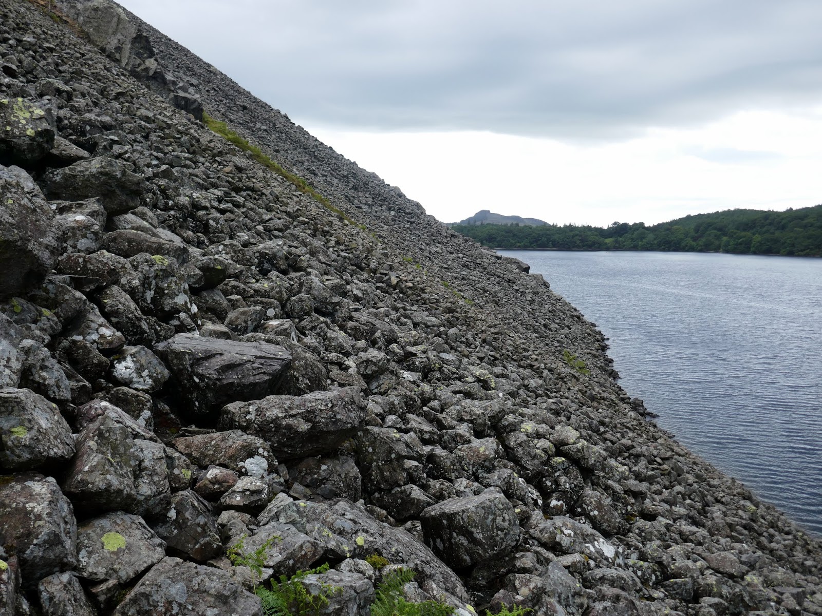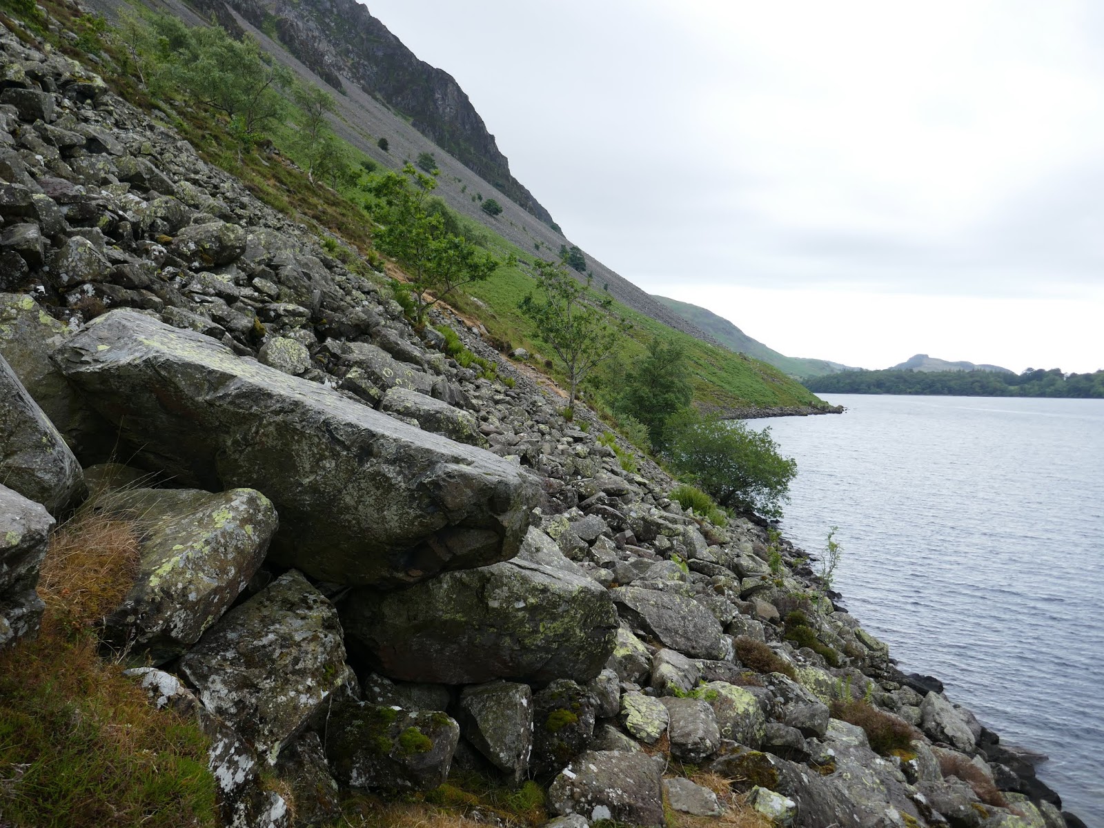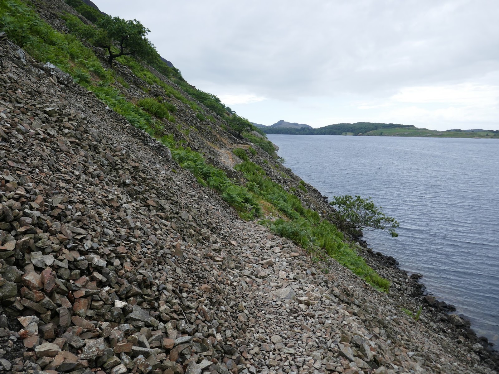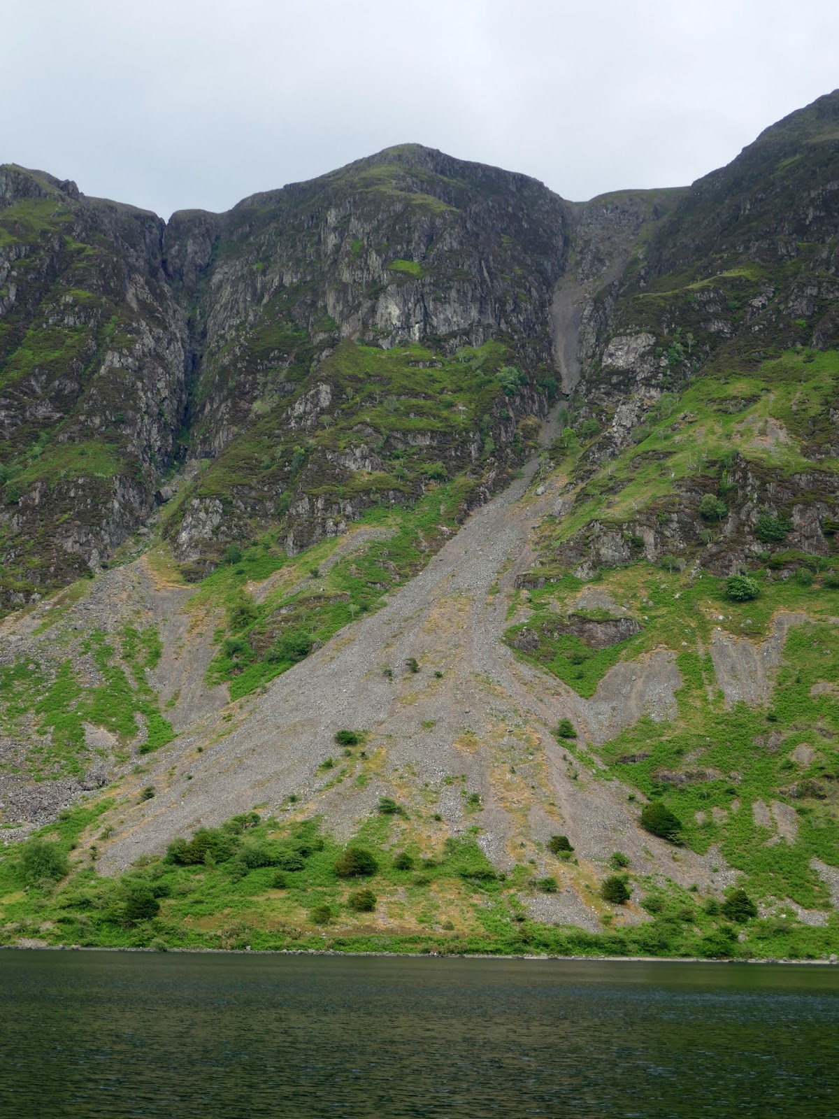 After an undulating section of narrow path, reminiscent of a low-level climbers traverse, the path crosses the first area of fallen stone. For the most part, the route is fairly distinct and the fact that the path is guarded on either side by the steep scree and a short tumble in the water prevents any travelling ‘off piste’. The screes actually extend below the surface of the water for another 60m before they come to an end.