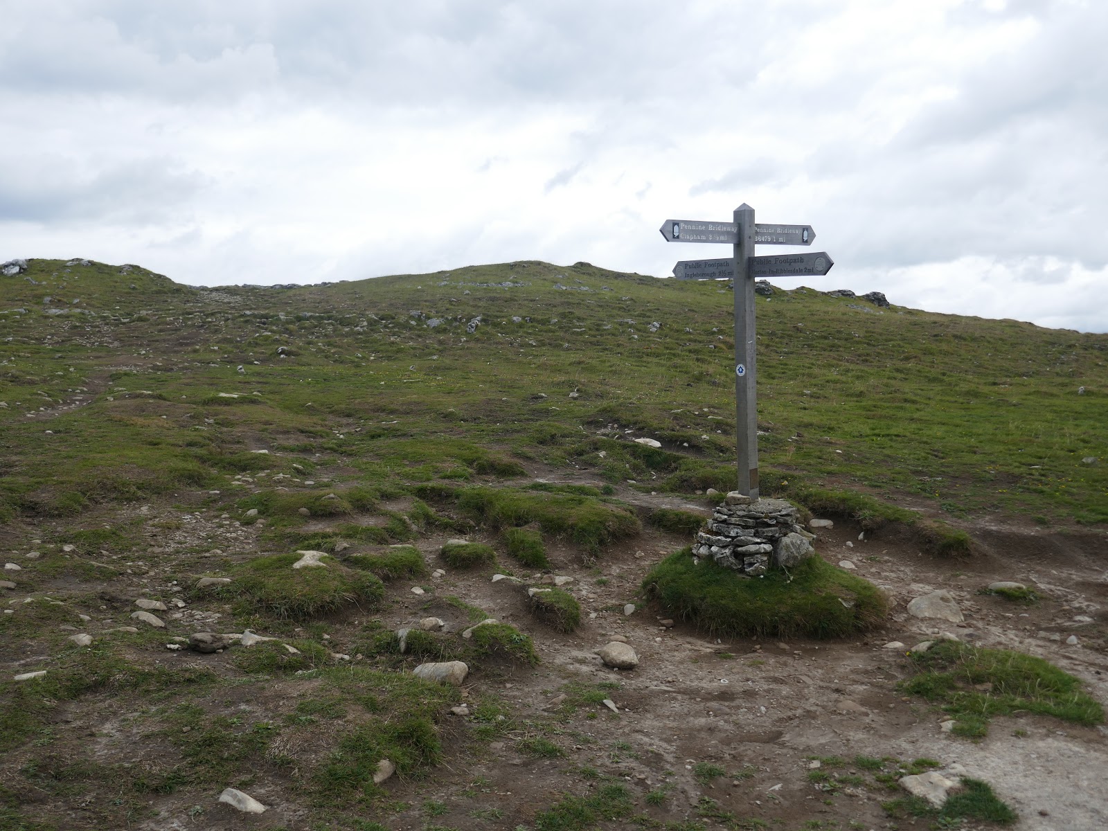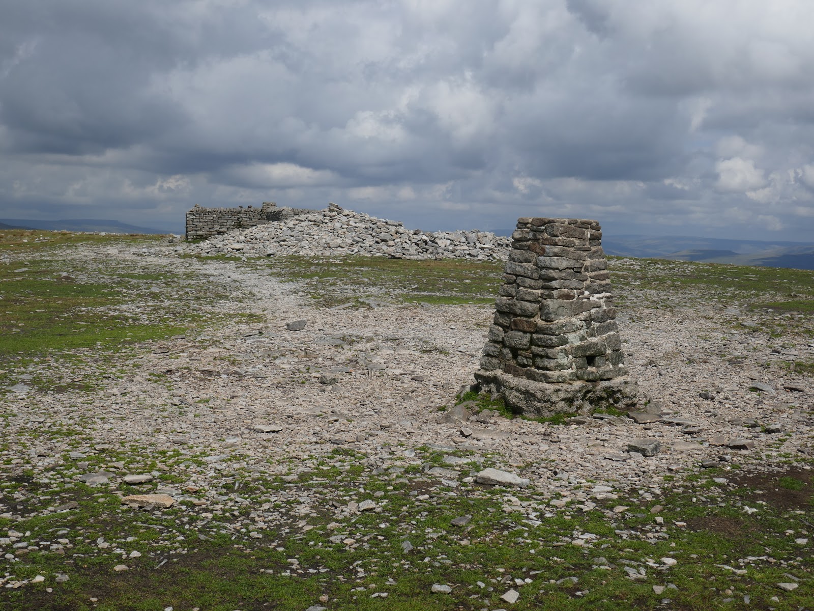 The summit is adorned with that most characteristic of objects, the OS trig pillar, along with a substantial cross shelter and a few large piles of stones. The views from around the summit are spectacular. On a clear day, they stretch away in all directions and are especially good viewed to the north and the west.