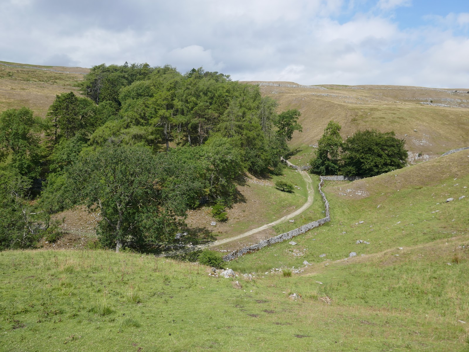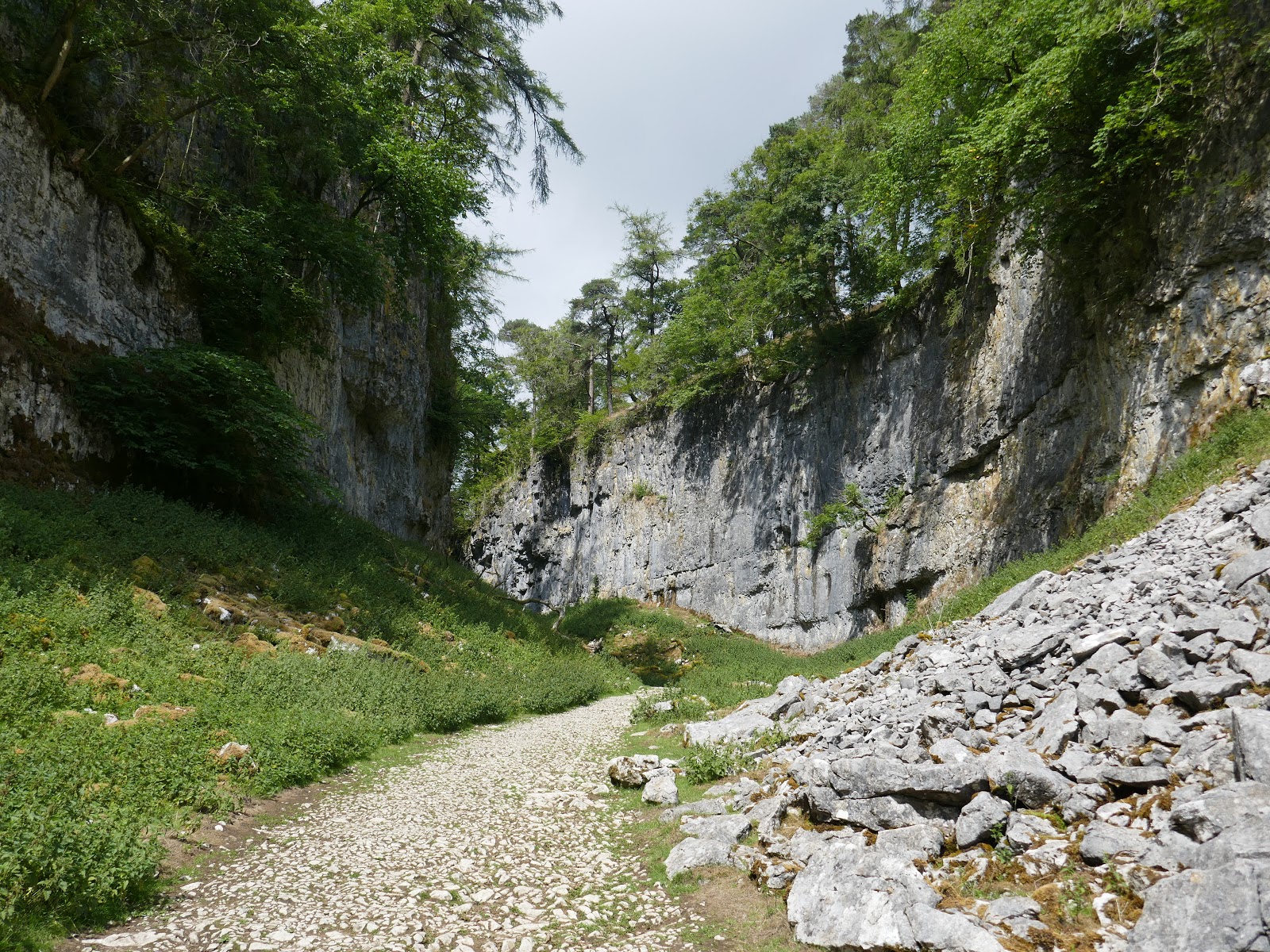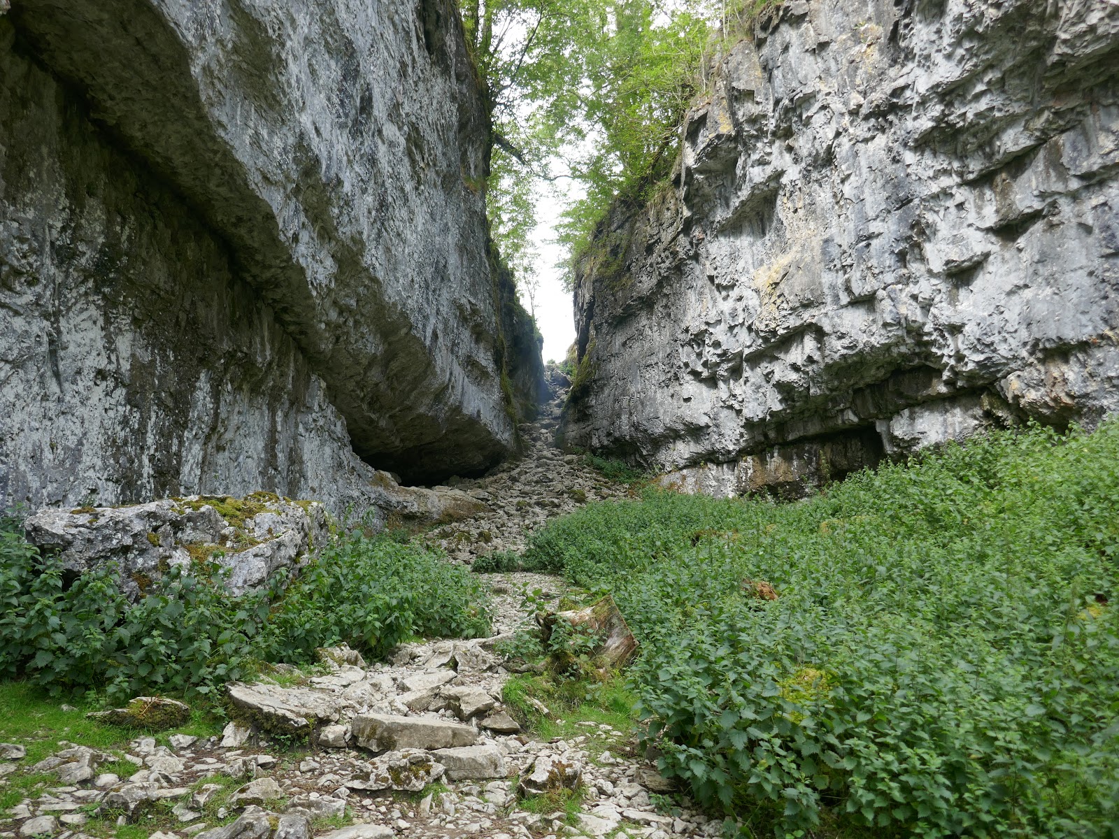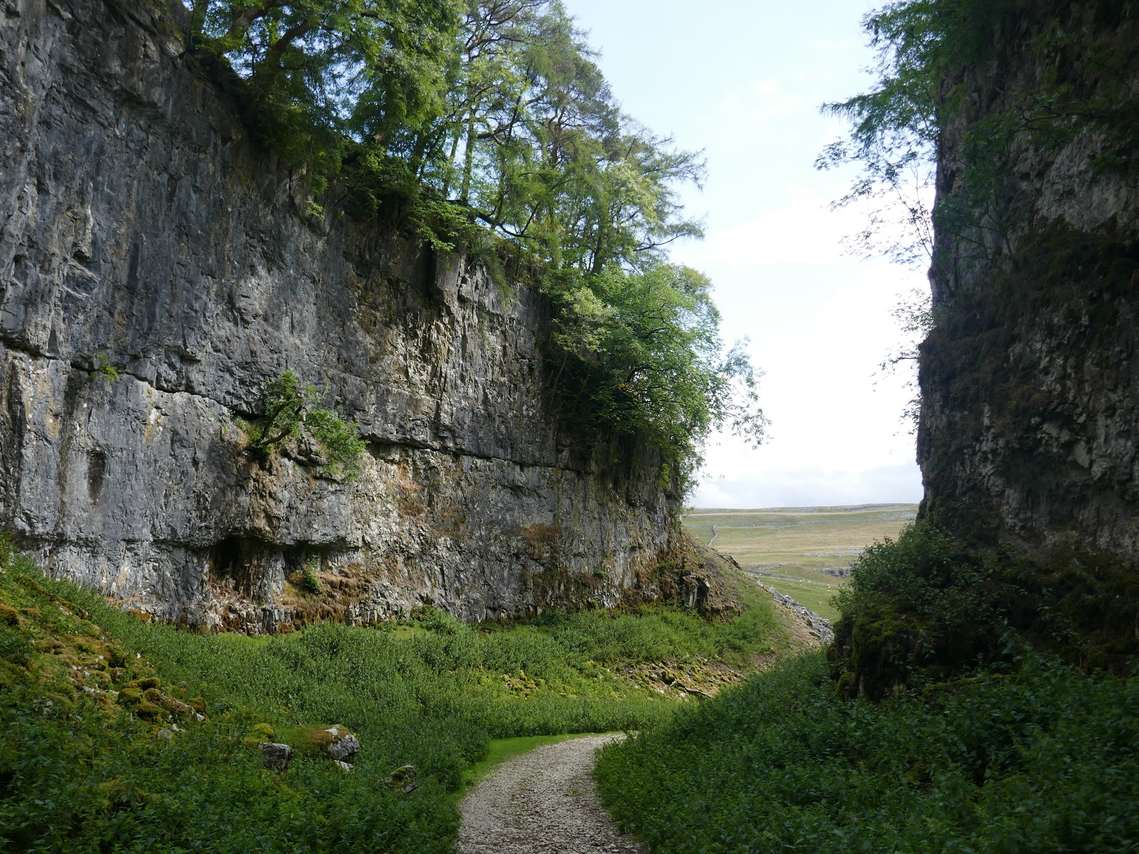 A short distance beyond the cave are the jaws of Trow Gill, an impressive limestone ravine. Trow Gill was possibly once an underground cavern formed by waters which now take an alternative route through the Ingleborough Cave / Gaping Gill system. At some point in time, the roof of this cavern is believed to have collapsed – Trow Gill being the suggested result (though other theories have the ravine as a glacial meltwater channel, such as Watlowes).