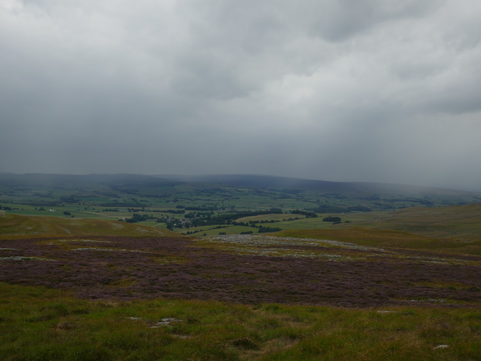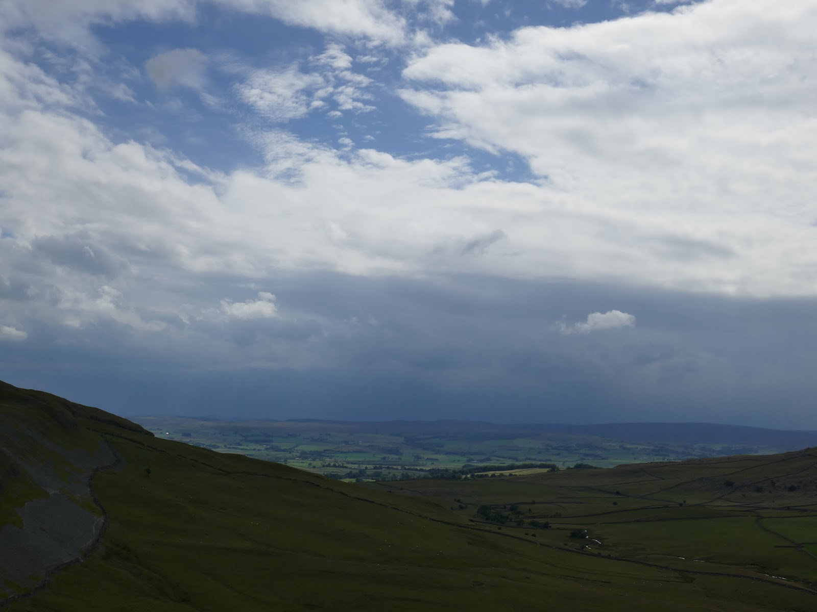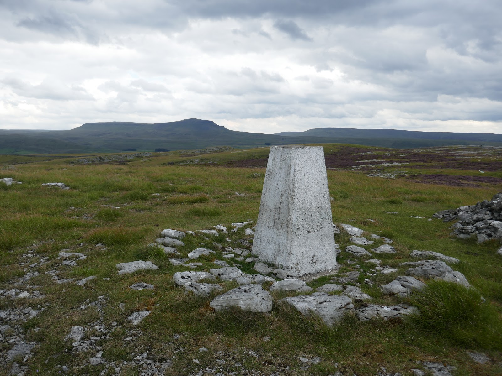Ignoring Beggar’s Stile, a path, at times indistinct, follows the edge of Moughton Scars, sometimes passing between the limestone blocks, other times heading straight across. After a while, the path reaches a breach in the ramparts of Moughton Scars at Capple Bank, which offers an easy way down into Crummack Dale. Instead of following the path down, I remained up on the escarpment, finding my way to the Moughton trig pillar, just before the arrival of threatening looking showers.