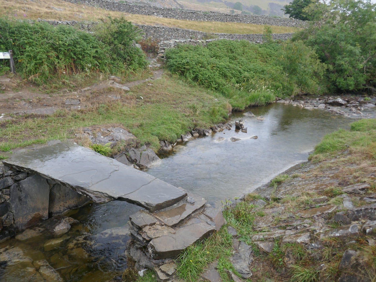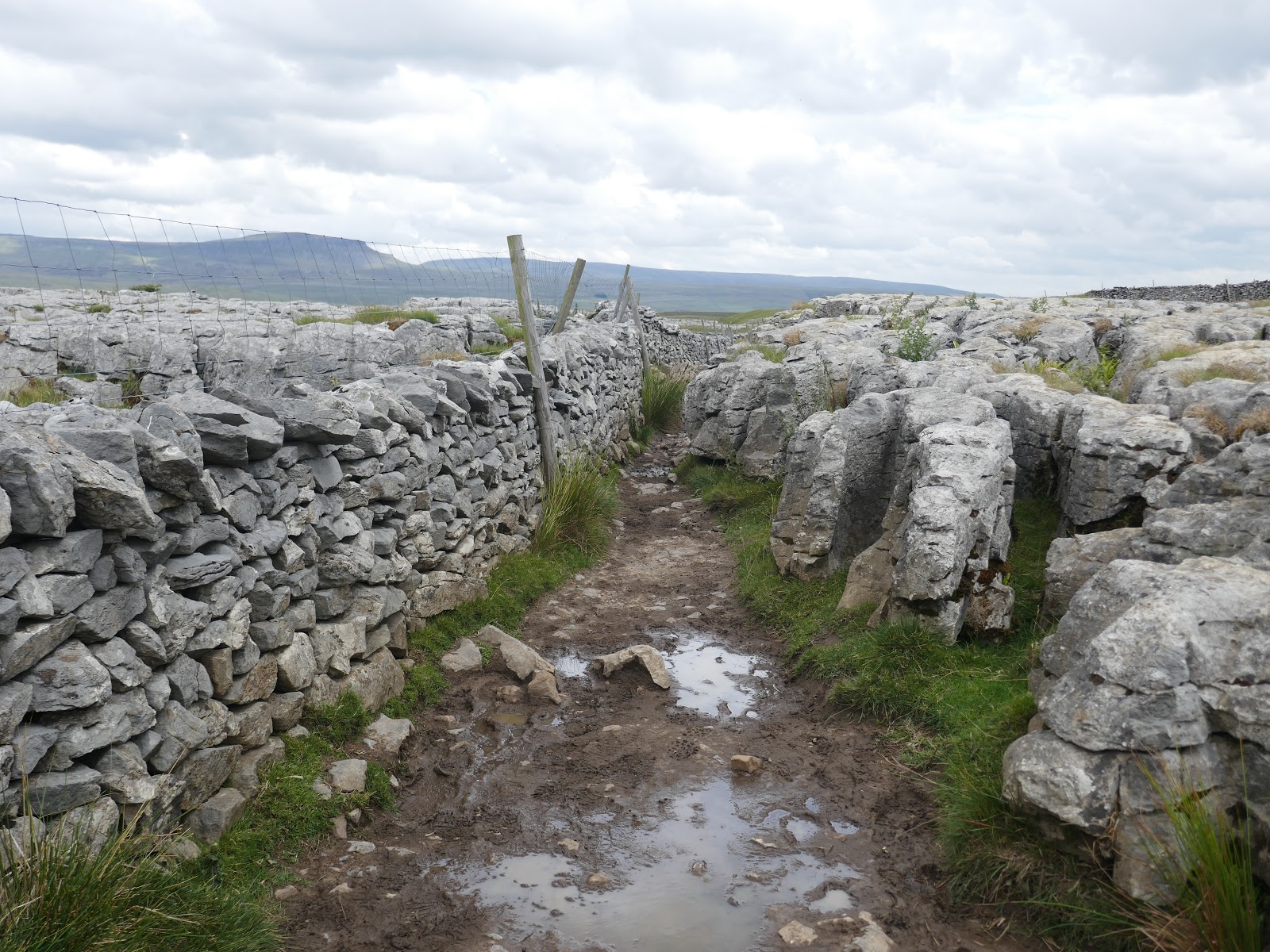 By the time I reached the walled lanes of Crummack Dale, it was raining heavily. The path led me to Austwick Beck and Wash Dub. Shepherds used to dam Austwick Beck in at spring and autumn to create a pool, within which sheep were washed to remove parasites. This went on until the 1930s. The clapper bridge was restored by the Yorkshire Dales Millennium Trust.