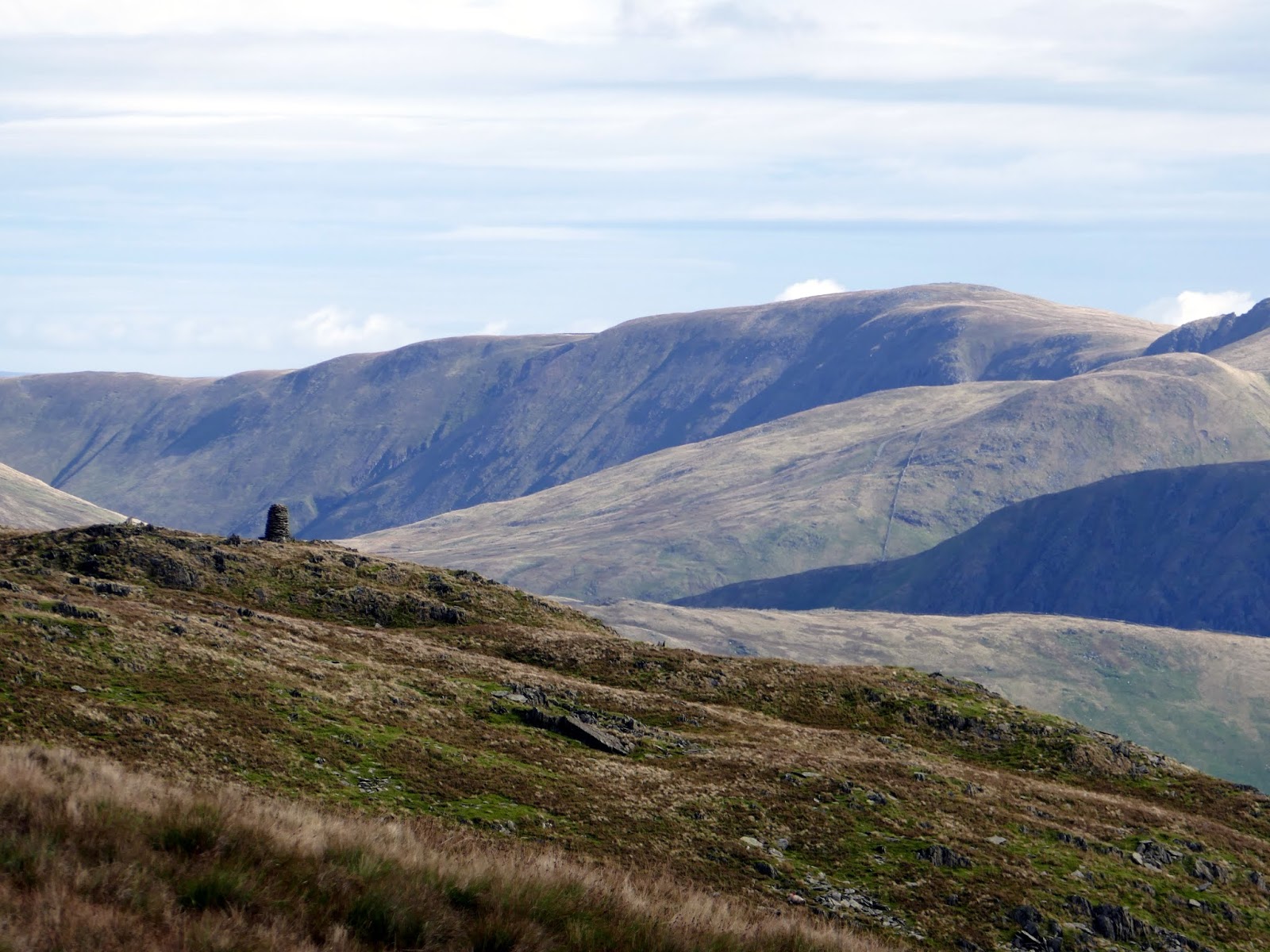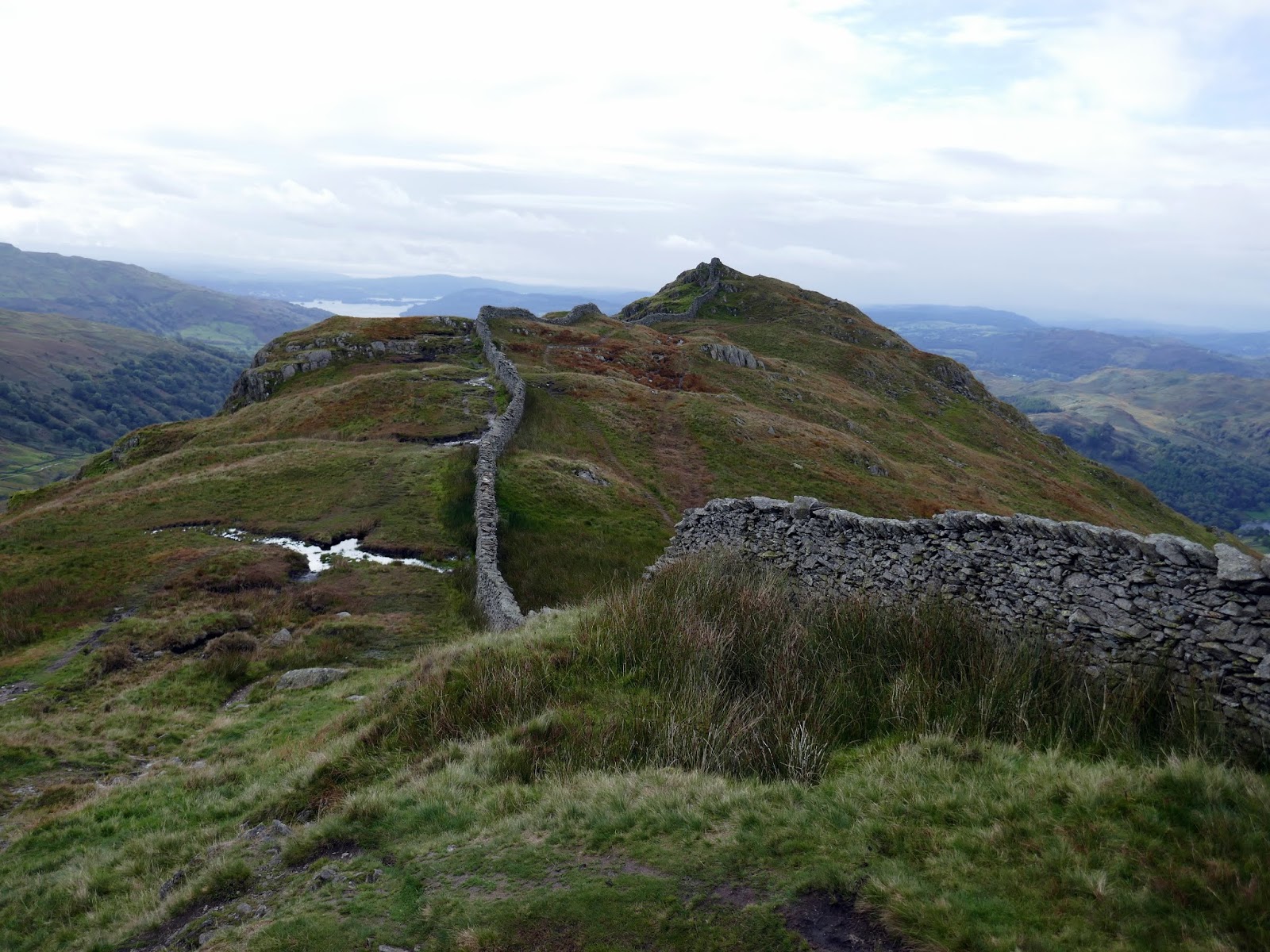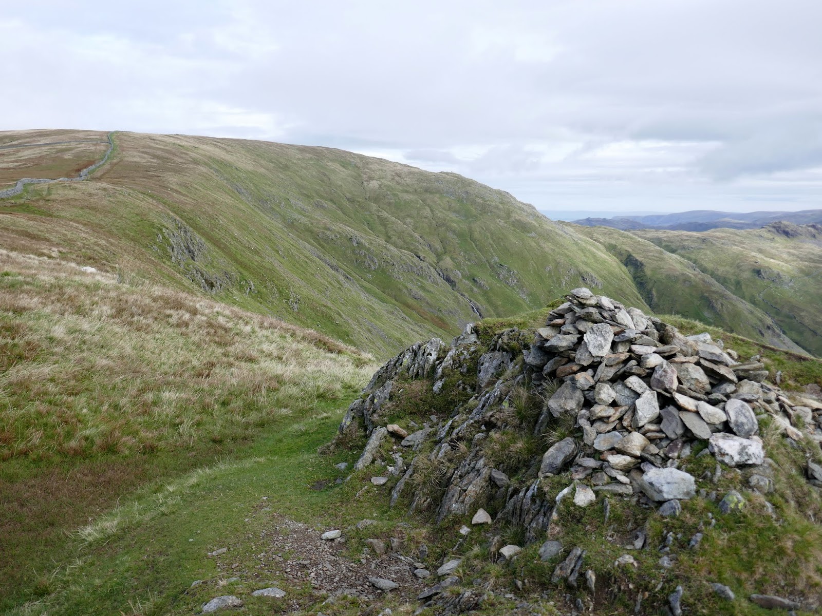 Red Screes is topped by a trig pillar and substantial shelter, which a couple of walkers were taking full advantage of. Slightly dispirited, I turned south to begin the long walk back towards Ambleside.
