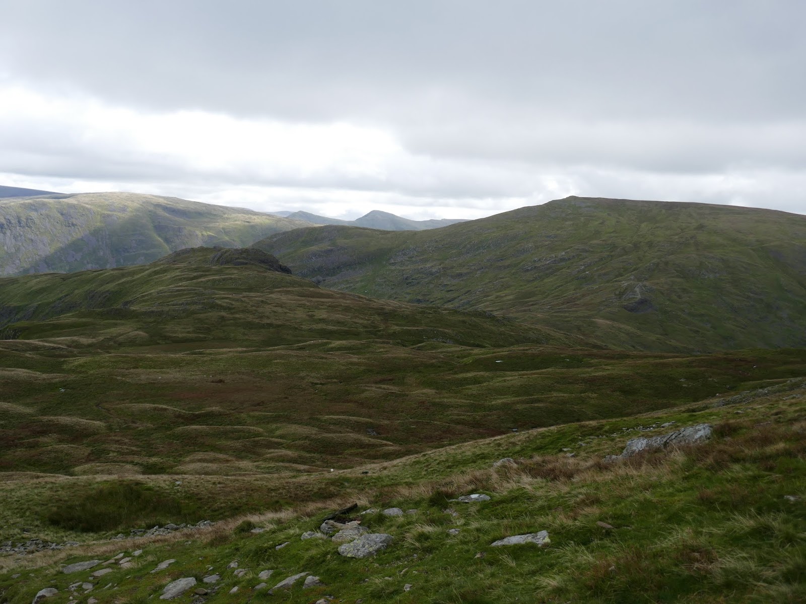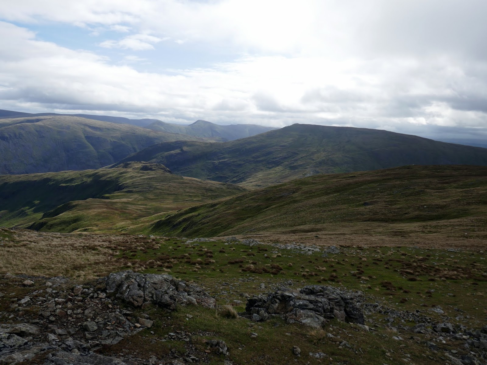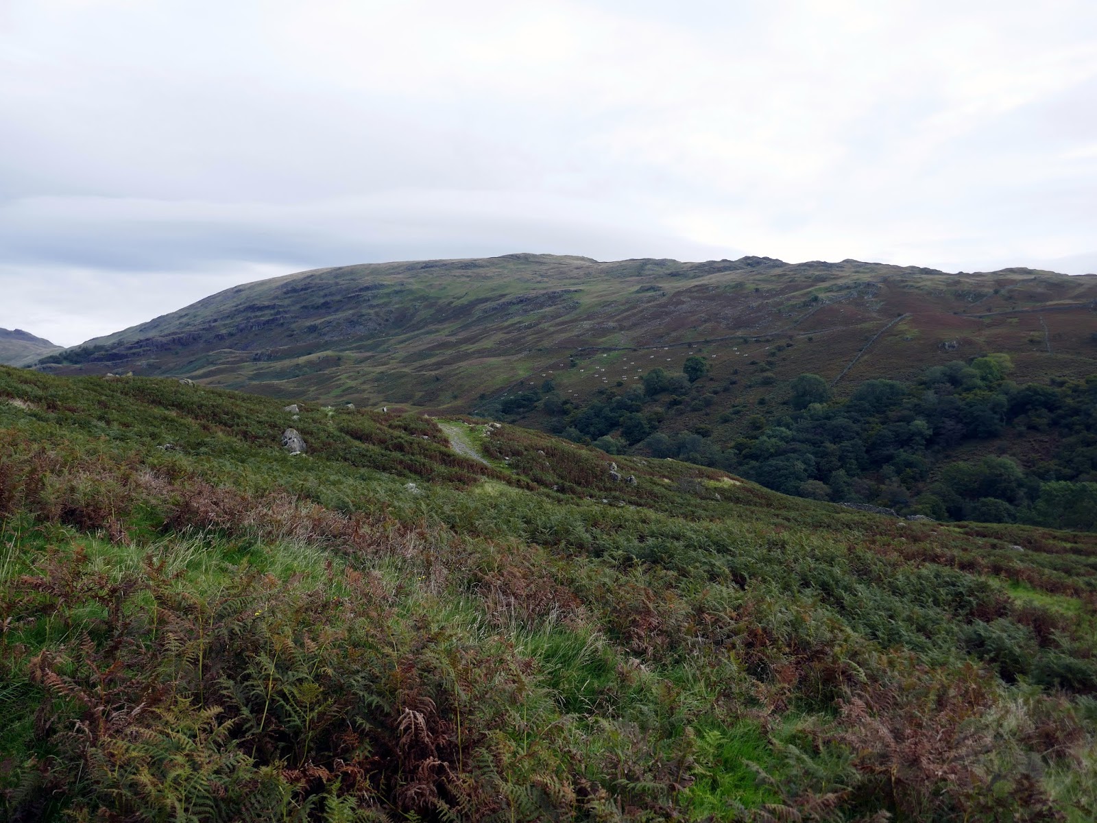 Red Screes is topped by a trig pillar and substantial shelter, which a couple of walkers were taking full advantage of. Slightly dispirited, I turned south to begin the long walk back towards Ambleside.