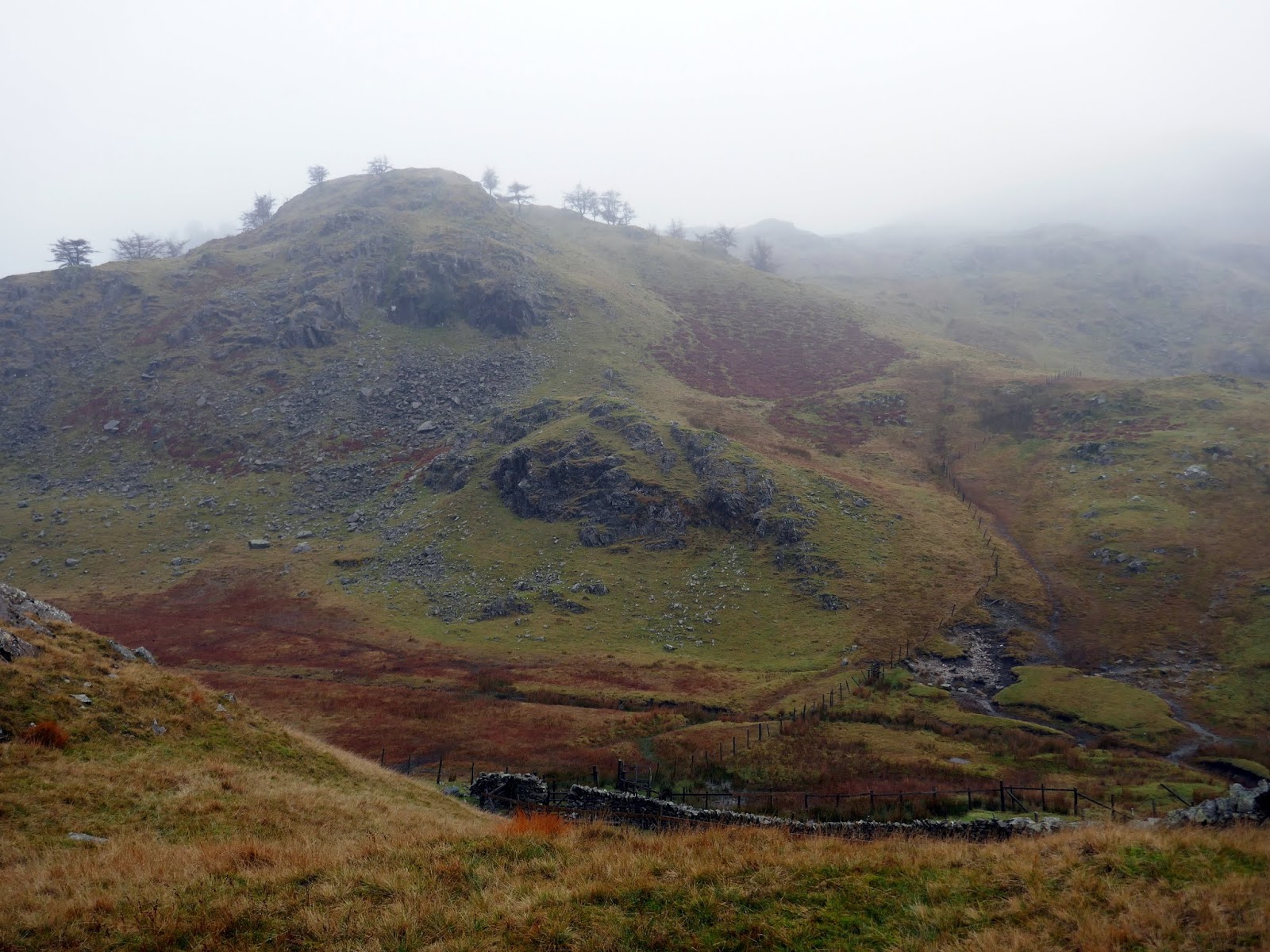 This collection of low hills see little in the way of visitors as the main routes into the Coniston fells bypass them. They are an interesting collection of knolls clustered to the north of Dry Cove Bottom (an ironic name on a day like today). The first of these from Little Langdale is Great Intake.