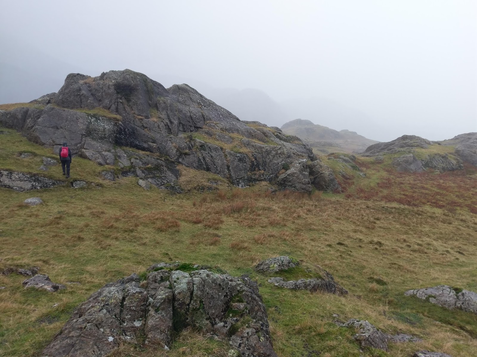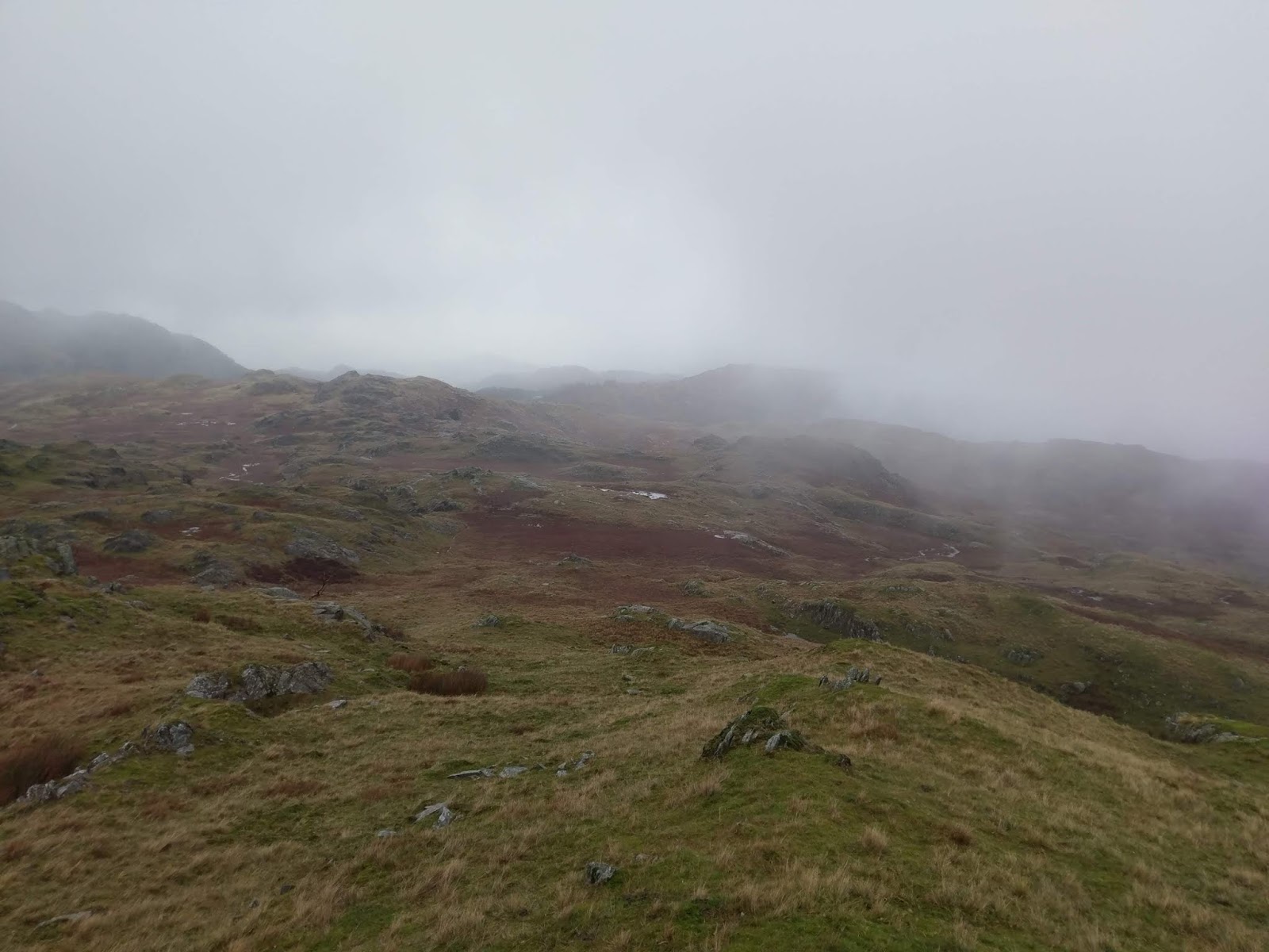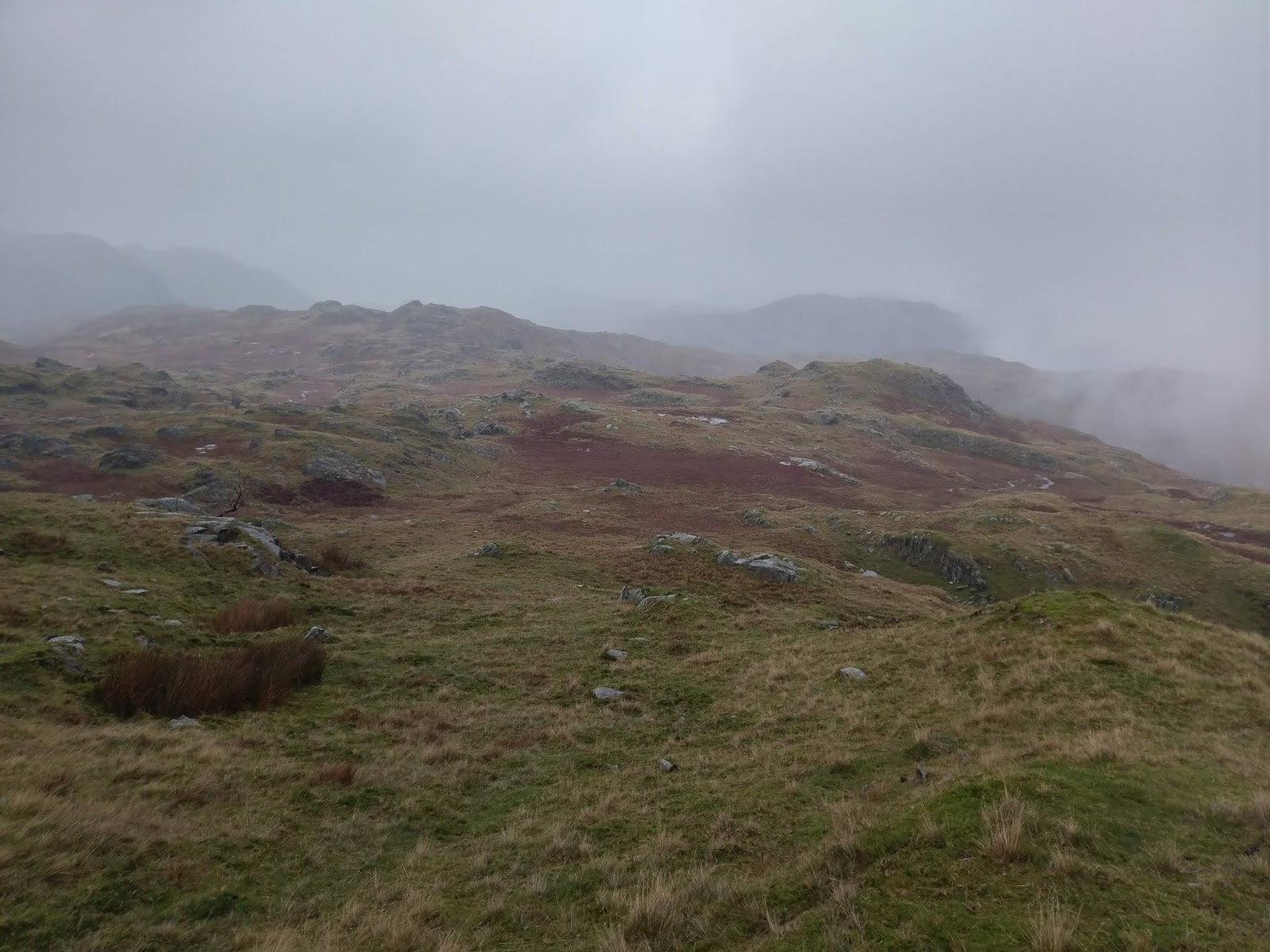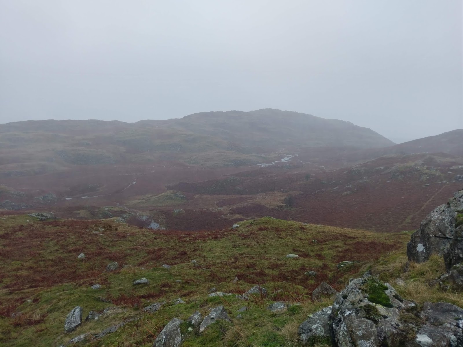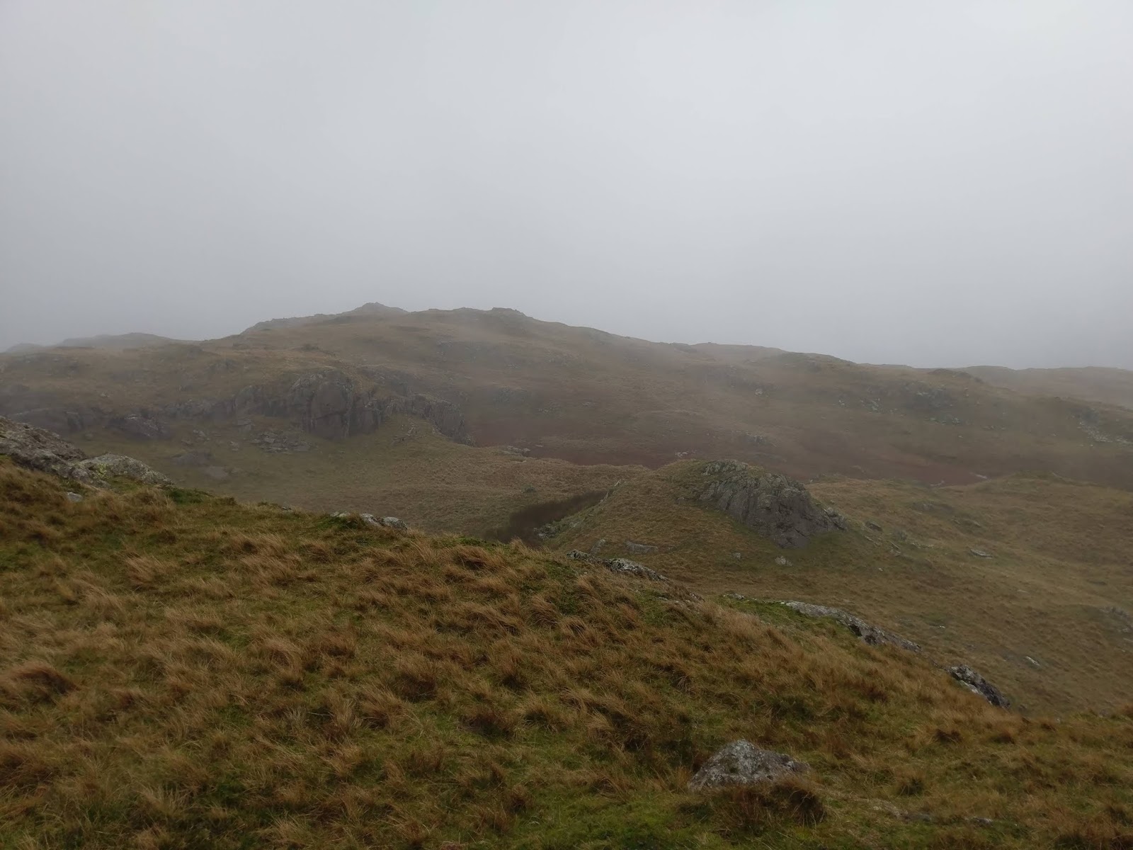 Beyond Kitty Crag is a marshy depression, made all the marshier by the weather. We managed to pick a way across, keeping any water out of our boots before climbing to the top of Long Crag. Views from these little fells are supposed to be very good as the look over Coniston and the lake. Sadly, no views for us today.